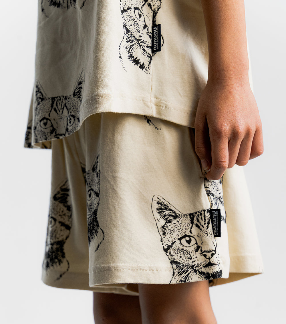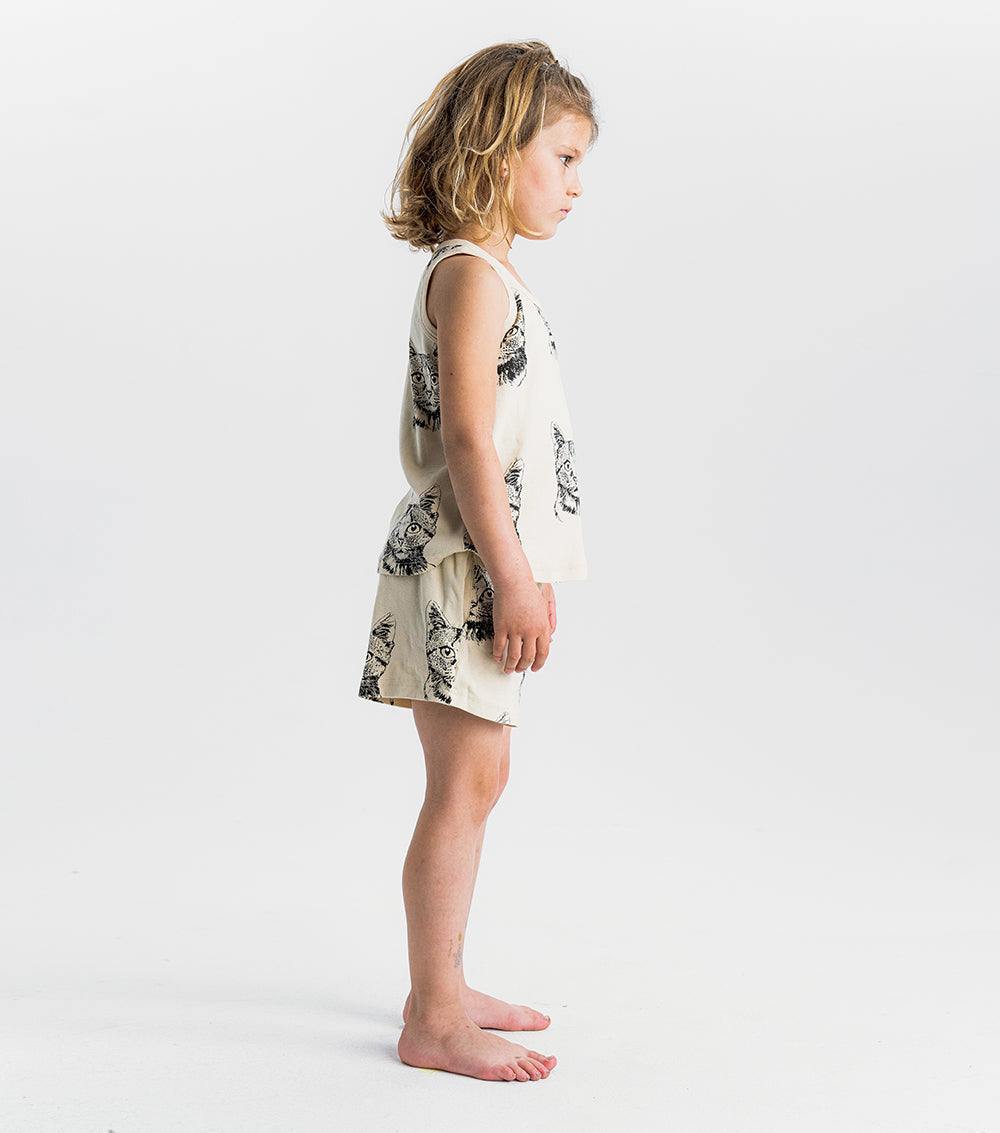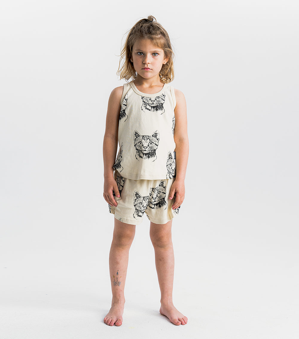 where are all the cool cats at? well it doesn't matter because we are bringing them hardcore in this natural-colored tank top & shorts loungewear set for boys & girls. it’s made of the softest ever fine rib so it’s literally so chill with a cool cat printed all over. but be careful, the kid wearing this set meows back.
