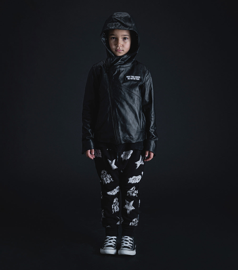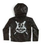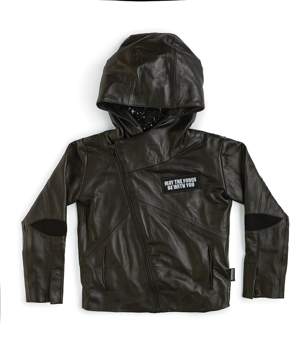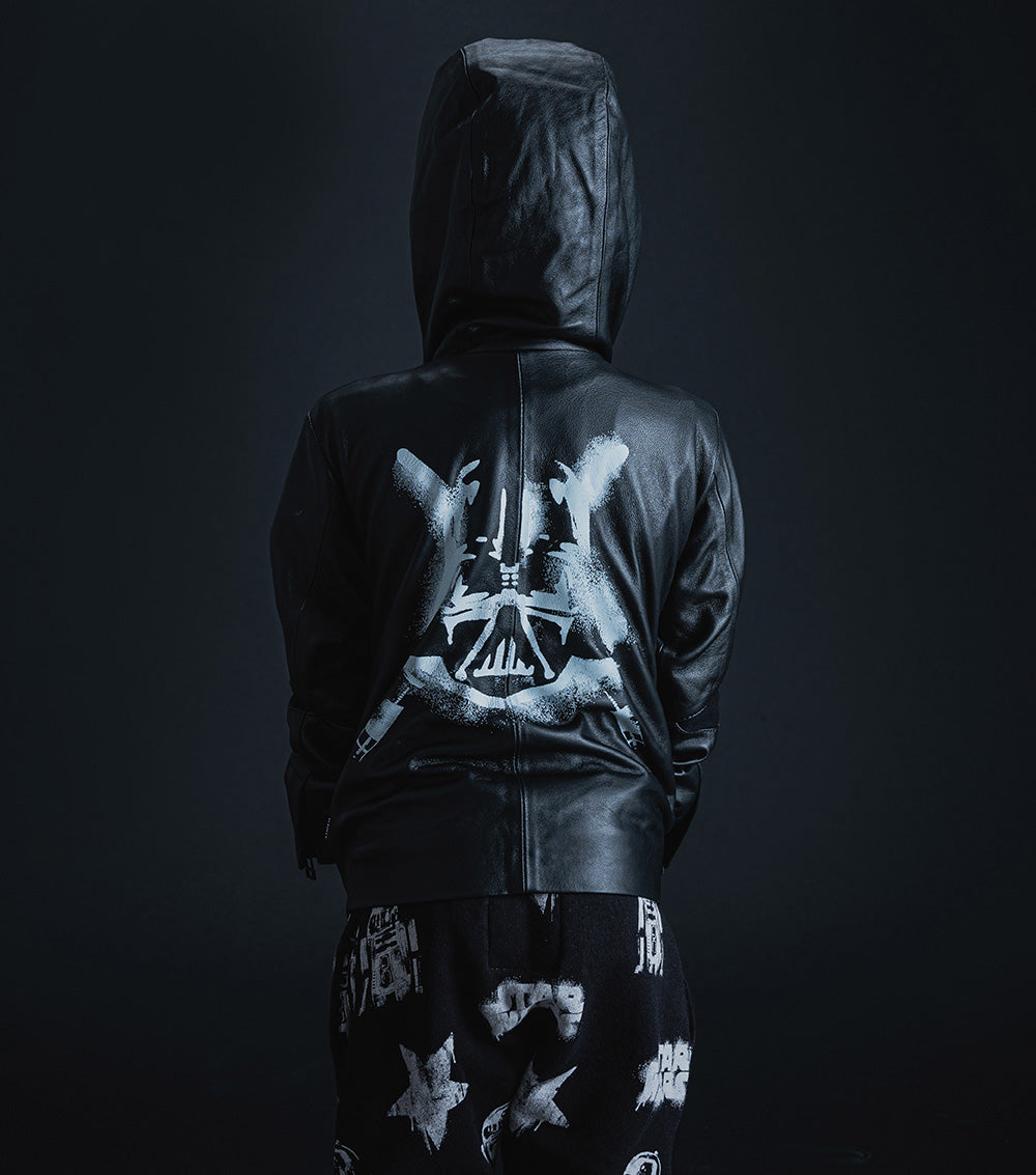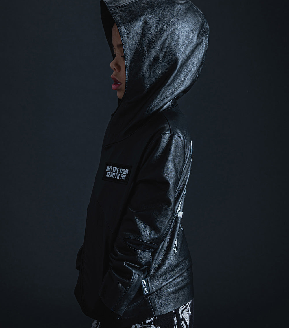 nothing like wearing an epically tragic figure on your jacket, just to show you know about life. here we’ve got Darth Vader in a sprayed stencil print, with two lightsabers crossed behind his helmet, on a cotton patch on the back of this absolute masterpiece. done in super soft and cool black leather, it’s got a relaxed fit & a nice slouchy hood to pull up when it all gets to be a bit much. The elbows are actually made from cotton to allow full movement and flexibility and the patch on the chest says “may the Force be with you,” so that should help.