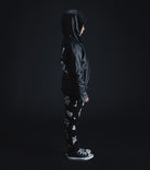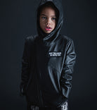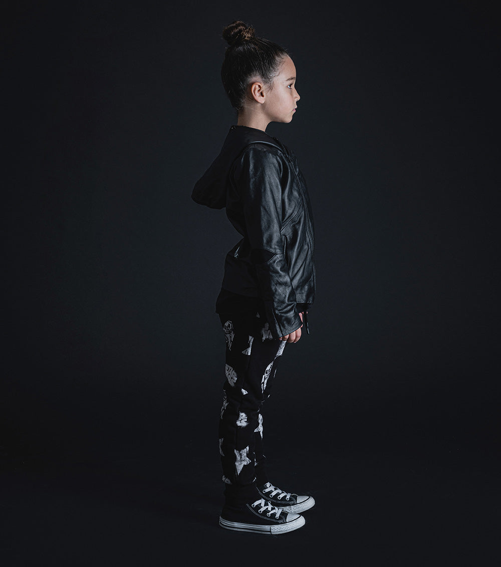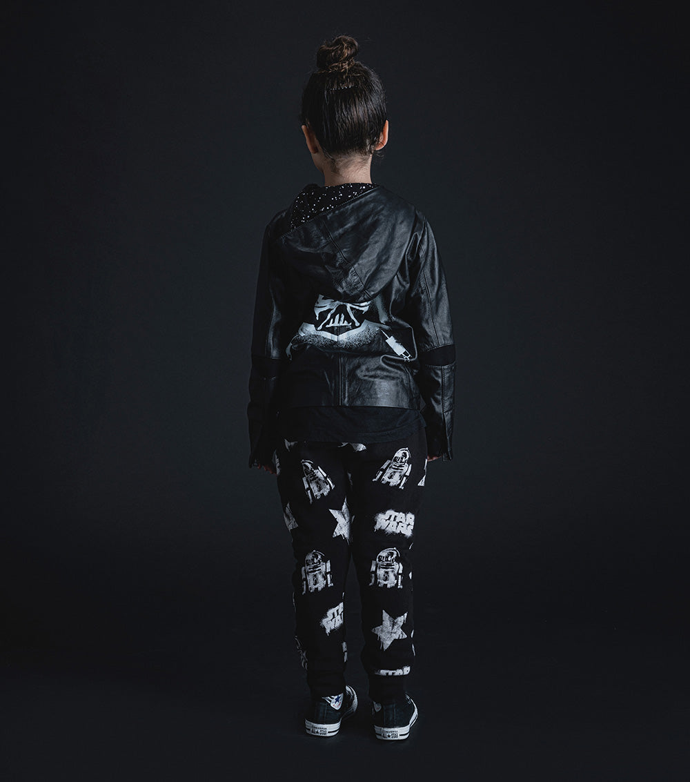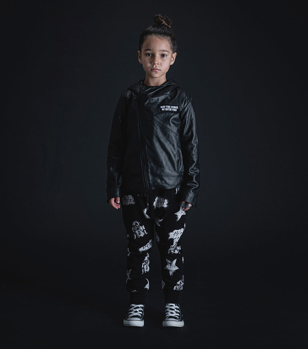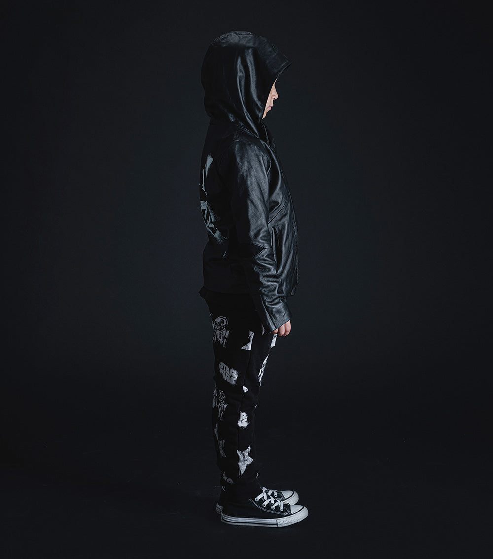 nothing like wearing an epically tragic figure on your jacket, just to show you know about life. here we’ve got Darth Vader in a sprayed stencil print, with two lightsabers crossed behind his helmet, on a cotton patch on the back of this absolute masterpiece. done in super soft and cool black leather, it’s got a relaxed fit & a nice slouchy hood to pull up when it all gets to be a bit much. The elbows are actually made from cotton to allow full movement and flexibility and the patch on the chest says “may the Force be with you,” so that should help.