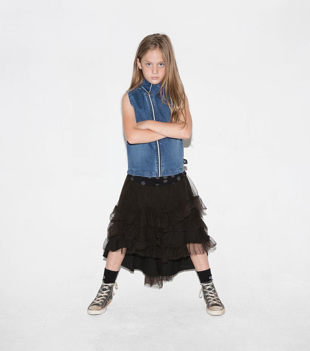A sleeveless jean jacket is a pretty rock & roll look, in general, but this denim vest keeps boys & girls looking tough in that arty, avant-garde way that only nununu can pull off. A diagonal zip nods to moto style, closing up to a generous hood that leaves only the angelic face to peer out with a look of realization that there is no cooler place to be than inside this vest
