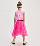 this dress is sure to strike up a conversation. it’s a super pink single cotton tank & a flouncy skirt bound by a sequenced black waistband. of course, it’s got the perfect number of tulle layers for maximum twirl potential along with a single cotton layer underneath to keep it comfy. the print is a bold lightning bolt made up of a multitude of colors for a dizzy 3d look that captures attention. pair it with grungy sneakers or edgy boots for a look that’s ready to shake up the atmosphere.