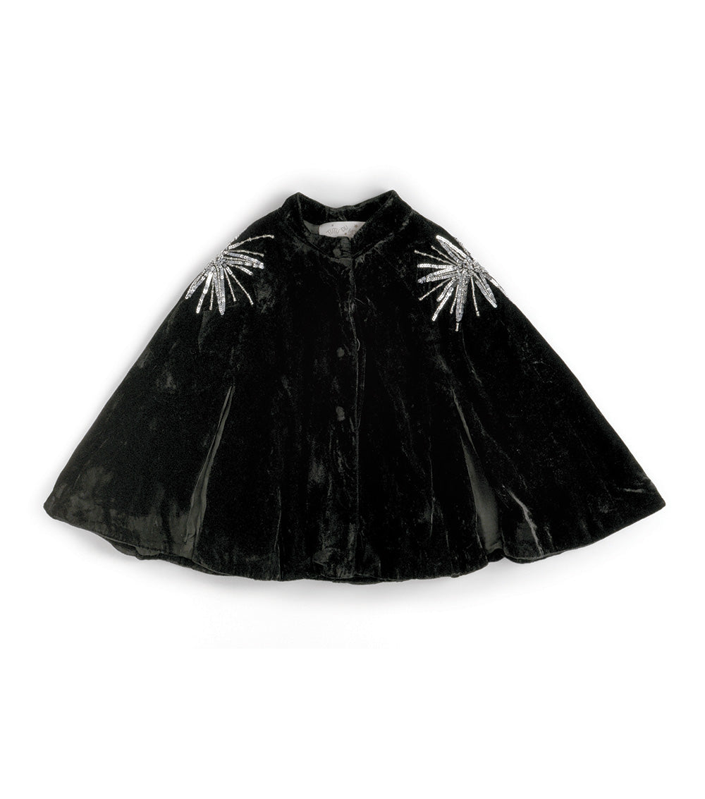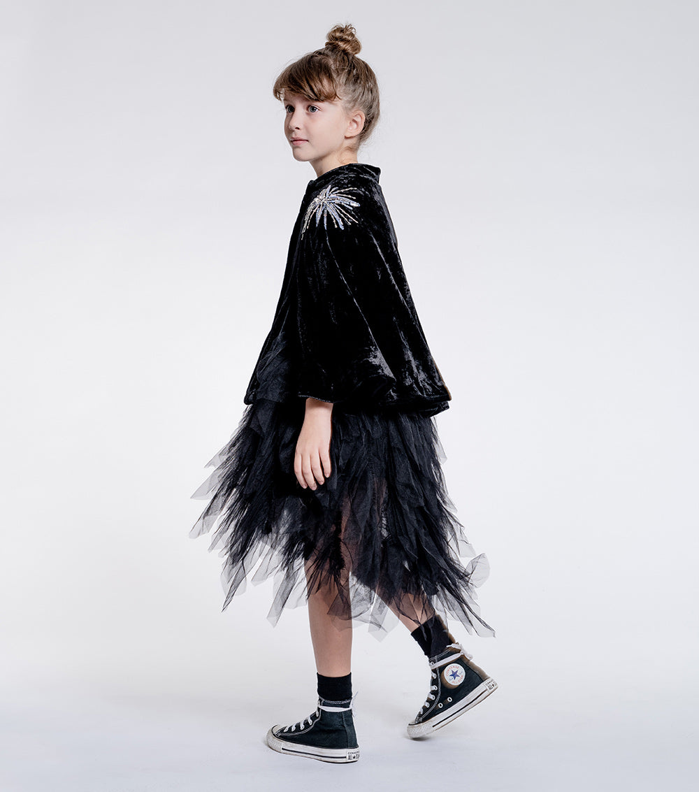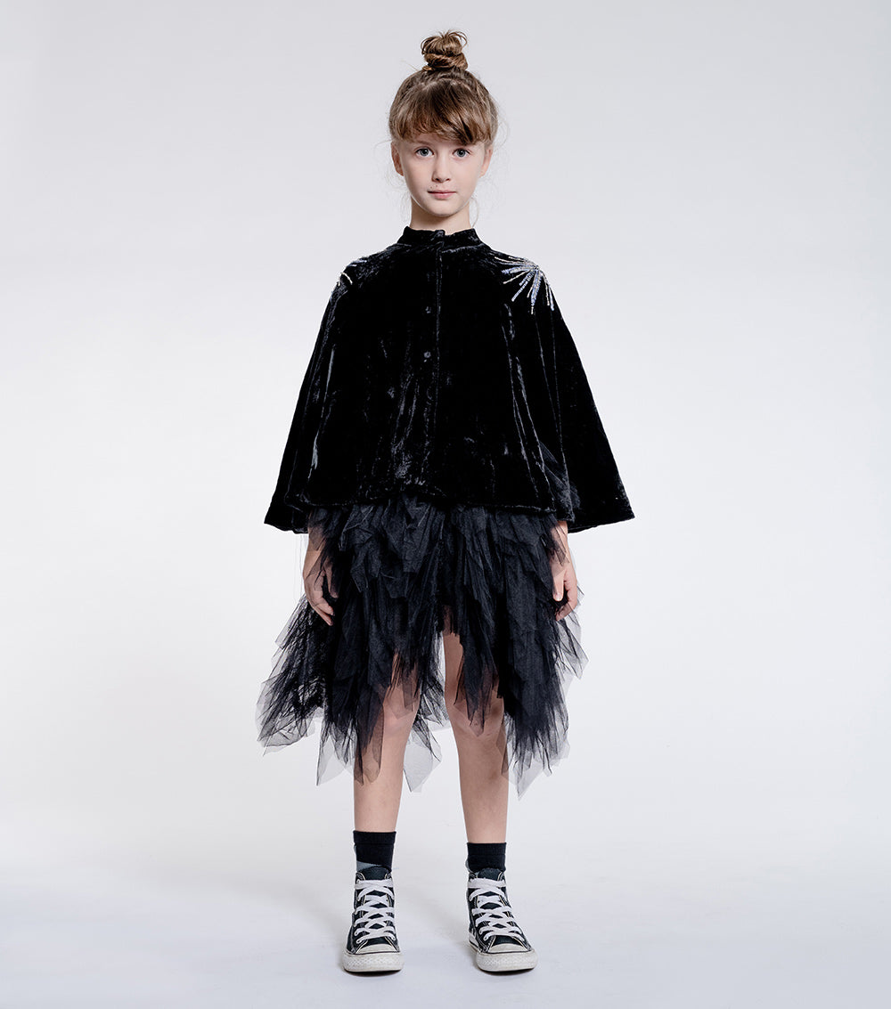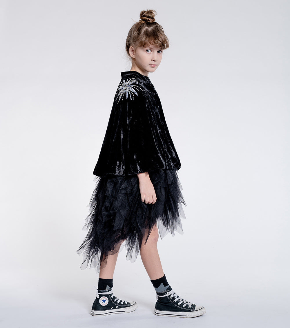 The perfect piece to add vava voominess all around. This cape is a product of our collaboration with the amazing stars from tutu du monde, bringing to life their ever so classic style blended with our edgy rebellious attitude. A super soft black velvet cover with hand-sewn sequined star elements at the front, make this the ultimate addition to every holiday look, over a dress, a shirt or even a tank top.