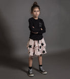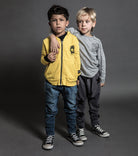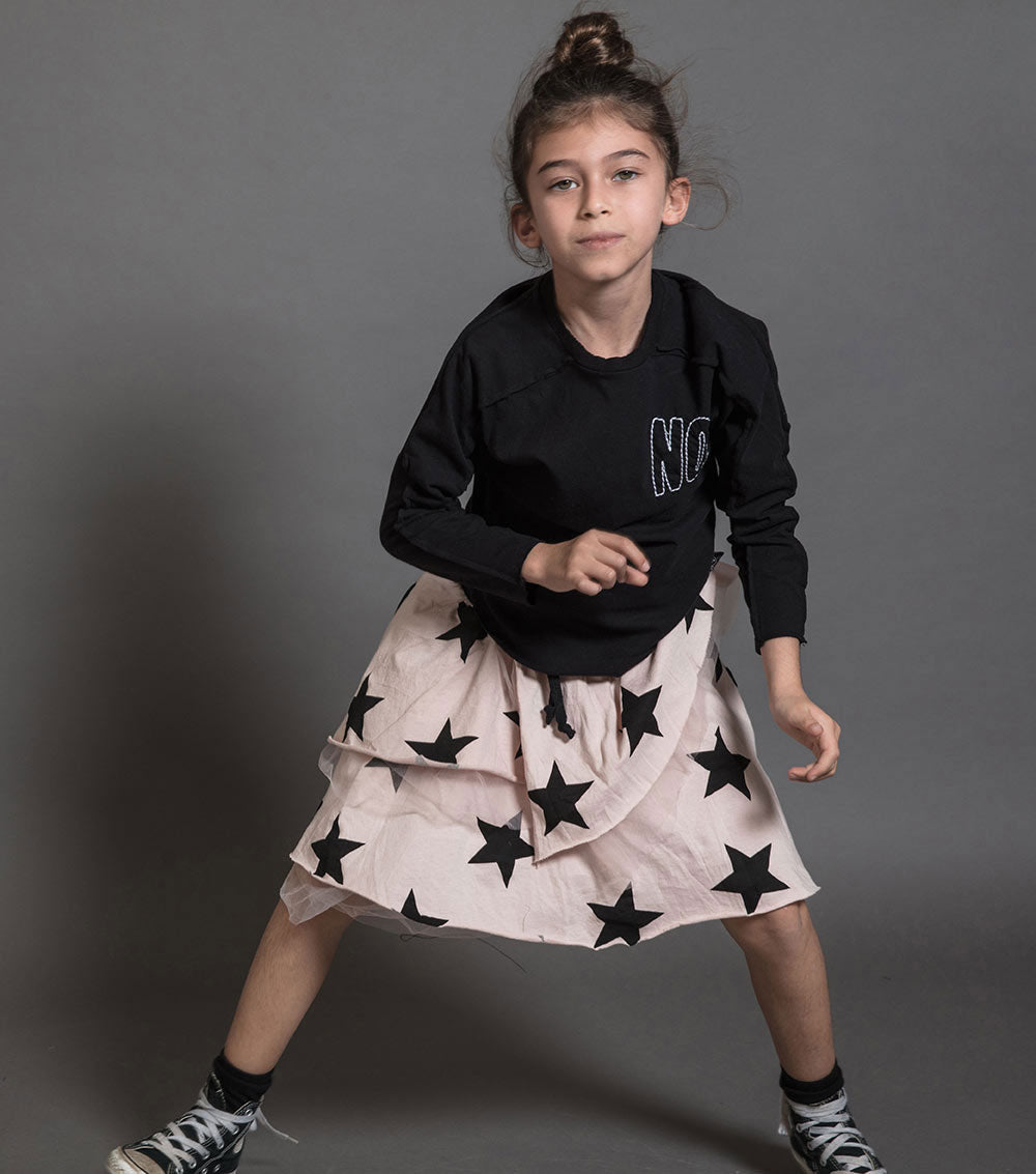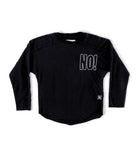 sometimes we wonder if “no” is the only word our kids know. it’s embroidered cooly at the chest of this black long sleeved shirt for boys & girls, almost as if it’s drawn on. the shirt itself is insanely soft, but it still looks tough with the inside-out seams coming down the sleeves. it’s also perfectly slouchy with its loose fit and curved, raw-finish hem.