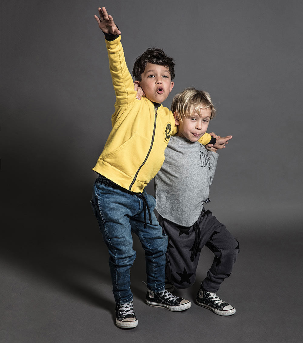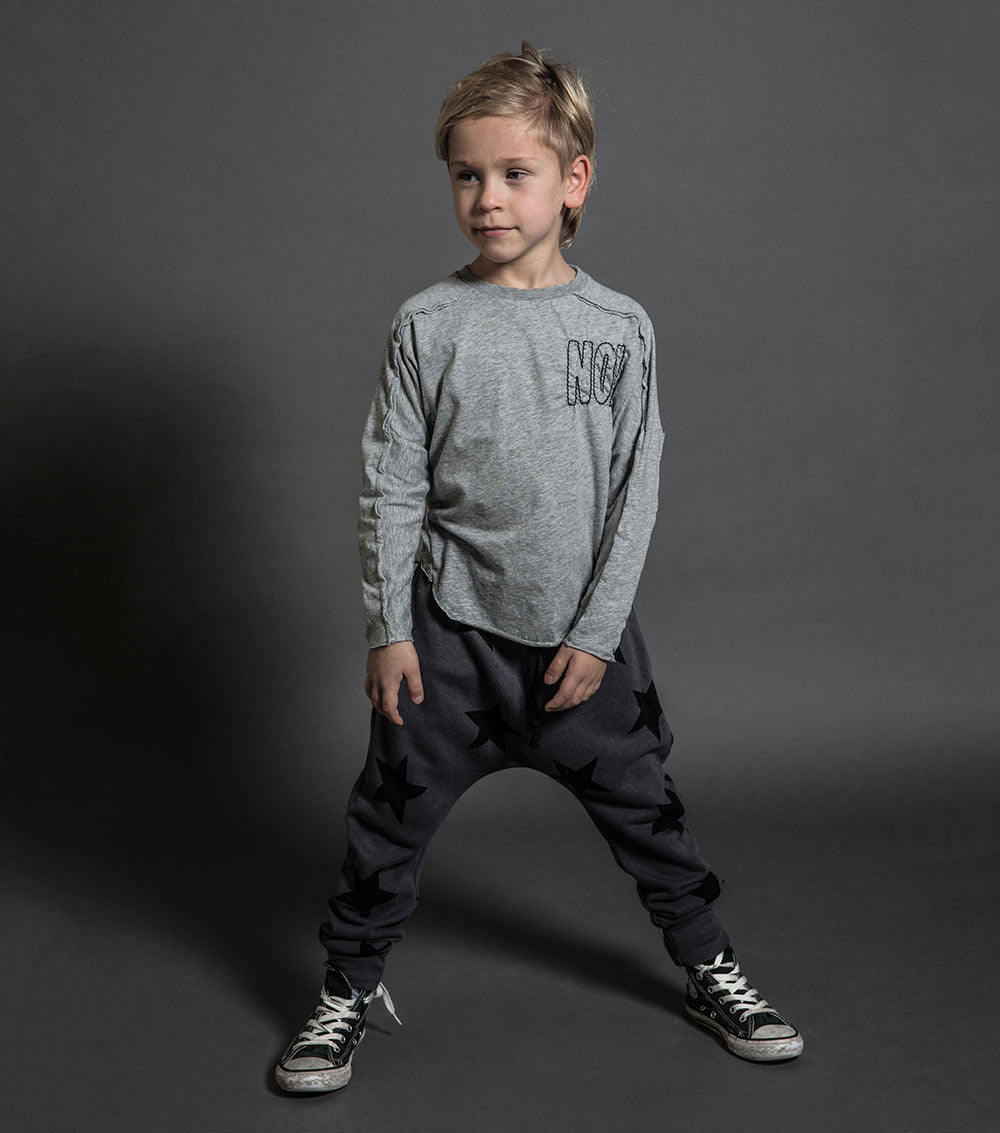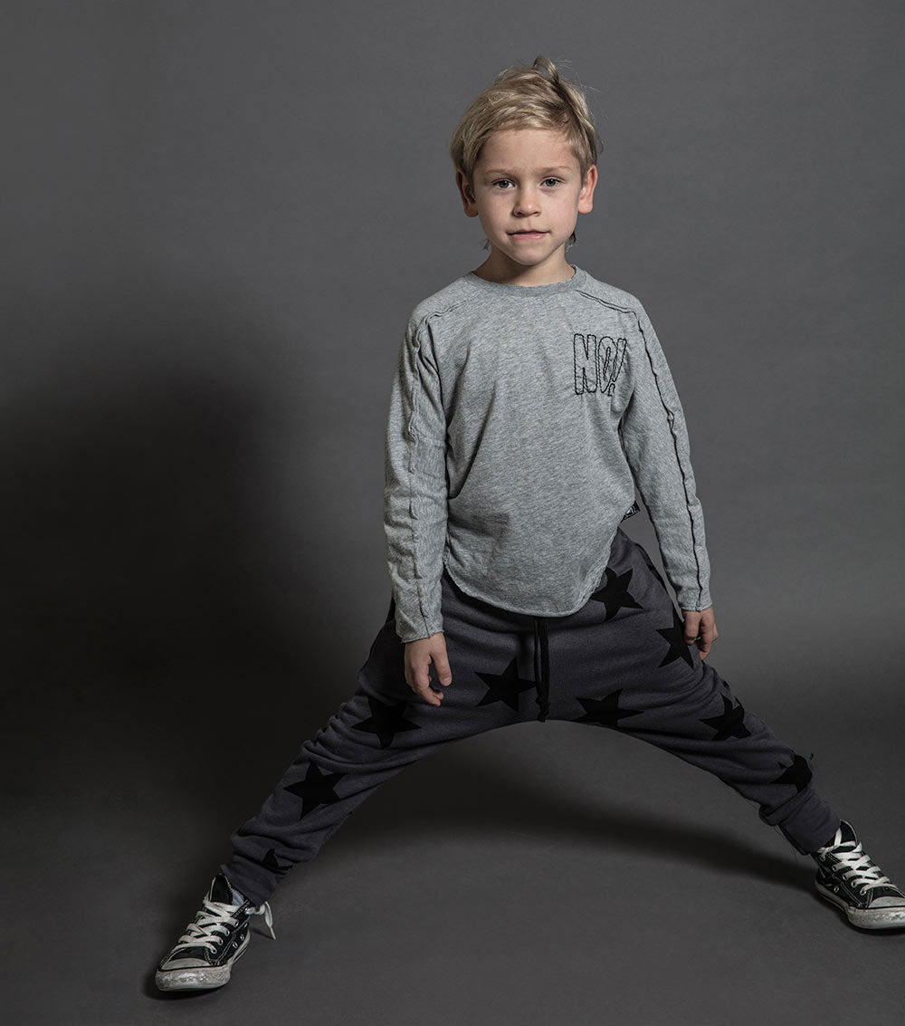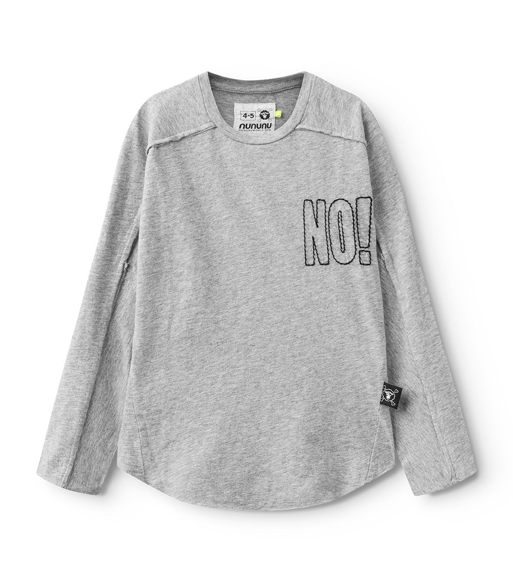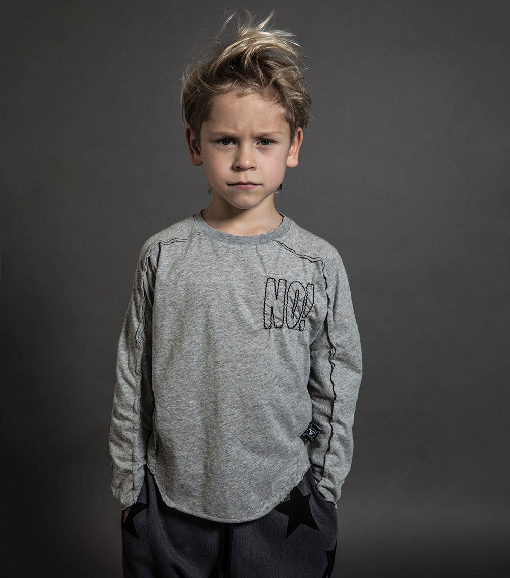 sometimes we wonder if “no” is the only word our kids know. it’s embroidered cooly at the chest of this heather grey long sleeved shirt for boys & girls, almost as if it’s drawn on. the shirt itself is insanely soft, but it still looks tough with the inside-out seams coming down the sleeves. it’s also perfectly slouchy with its loose fit and curved, raw-finish hem.