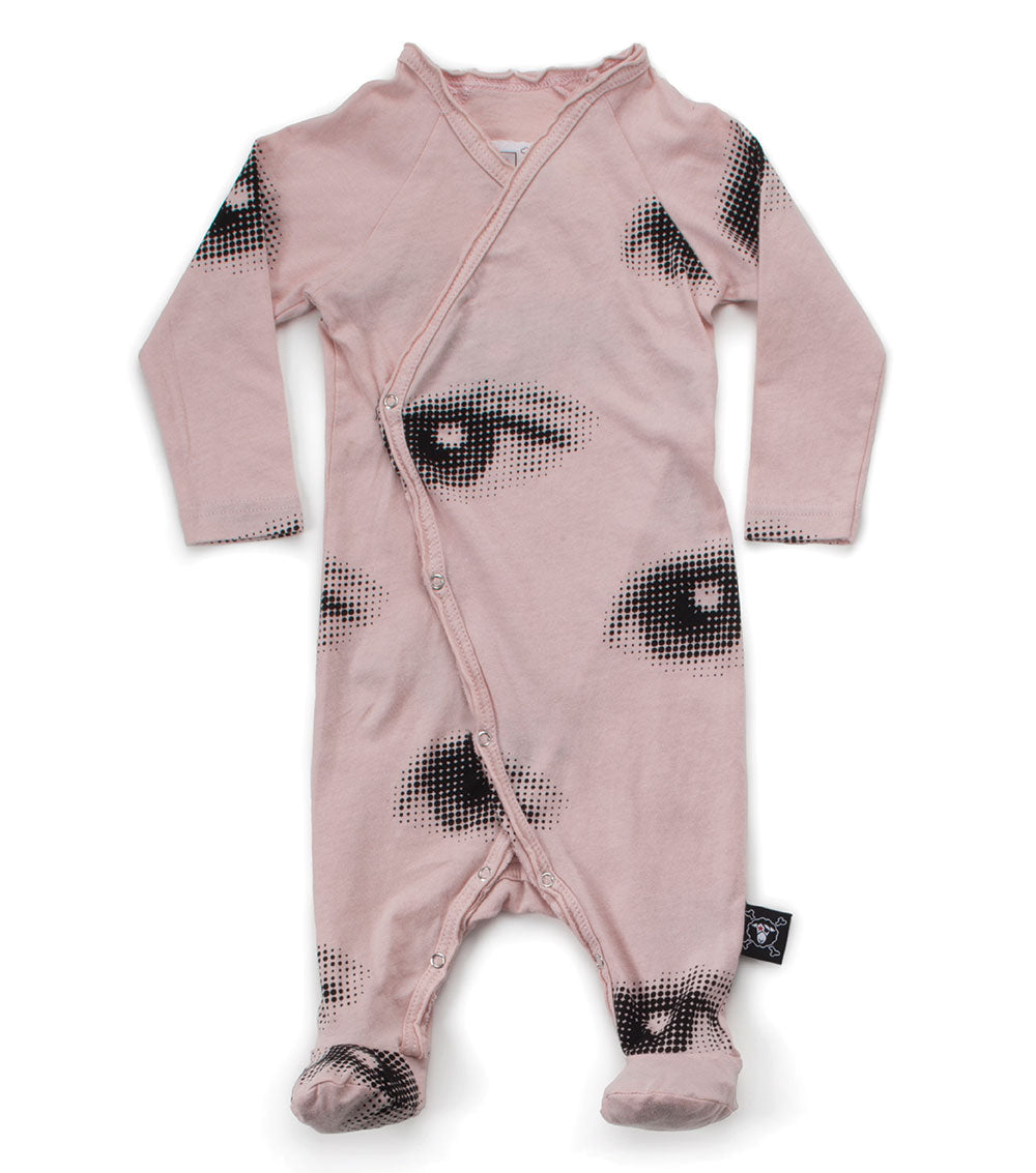 The powder pink envelope footie overall is for the real fashion babies. a very nununu asymmetrical snap closure wraps the kid in coziness & facilitates record-time changing. our dot-pixel eye print keeps watch along the way.