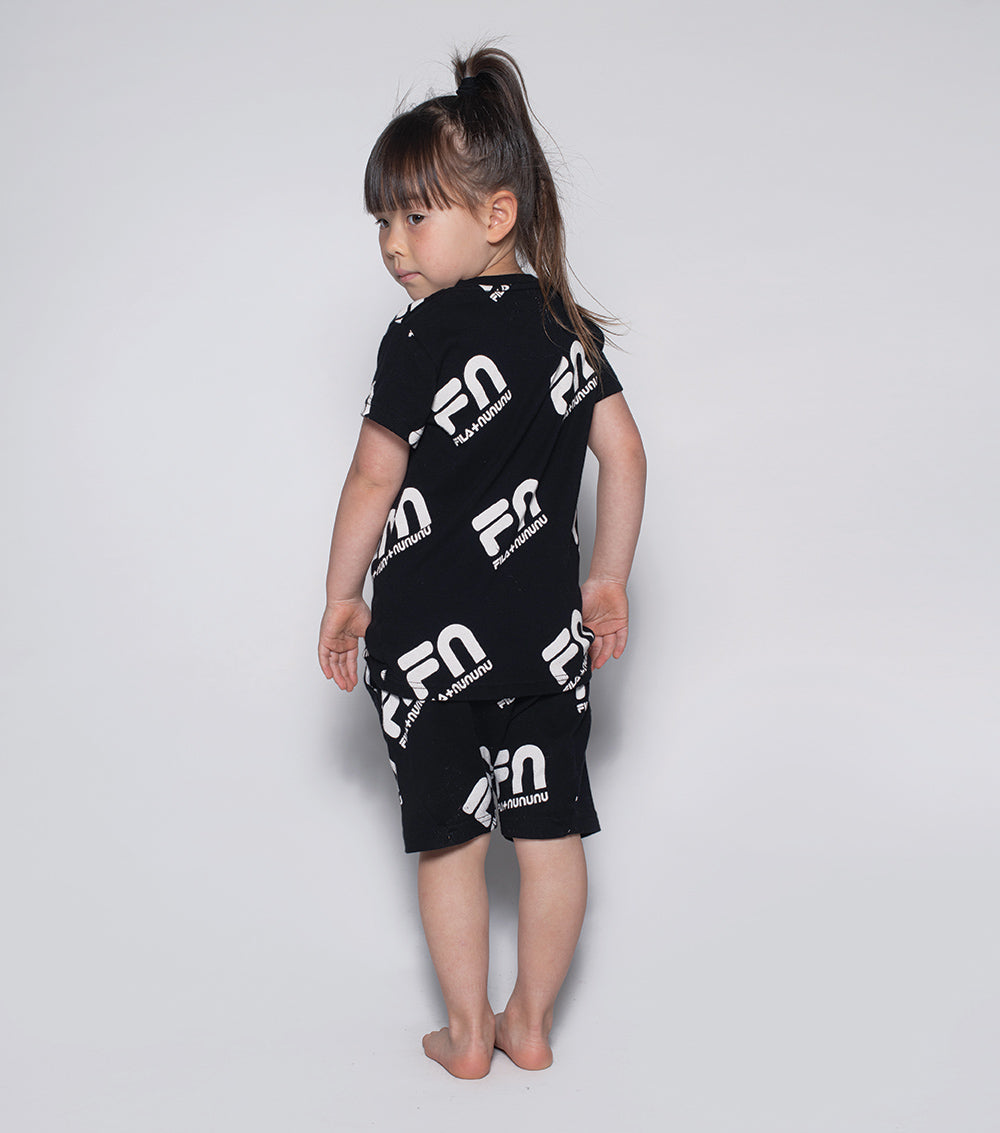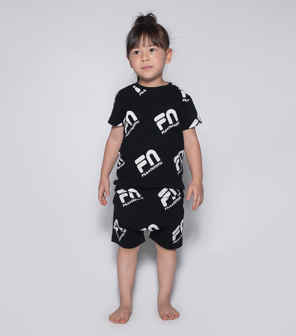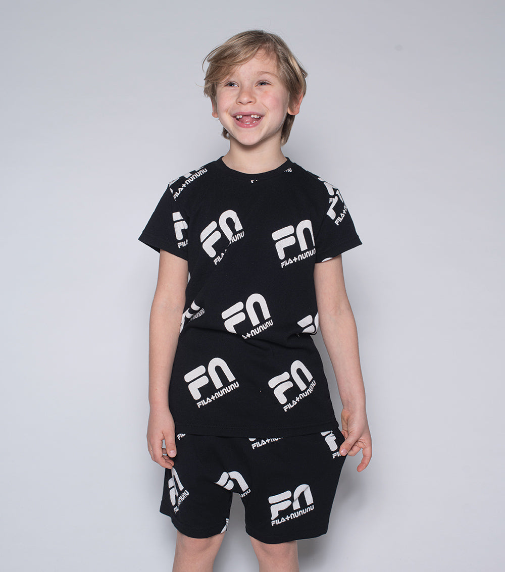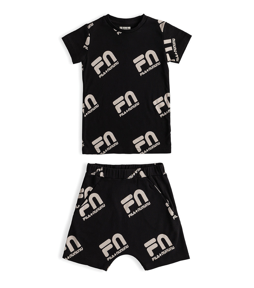 your fave nununu boy or girl will enjoy chilling out, going to sleepovers or just relaxing with the family in this unisex set. part of our collabo with FILA, this is not your ordinary kids’ loungeset. constructed of lightweight cotton, the t shirt & shorts combo features our mashup logo printed all over.
