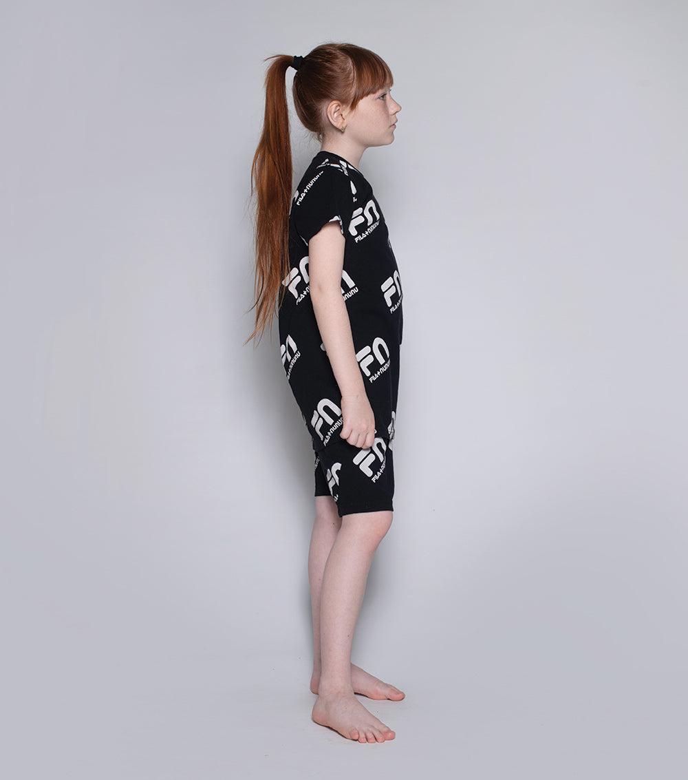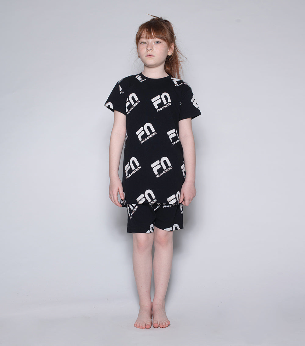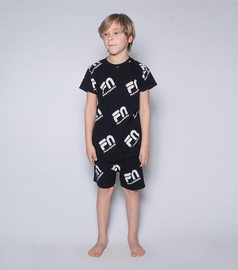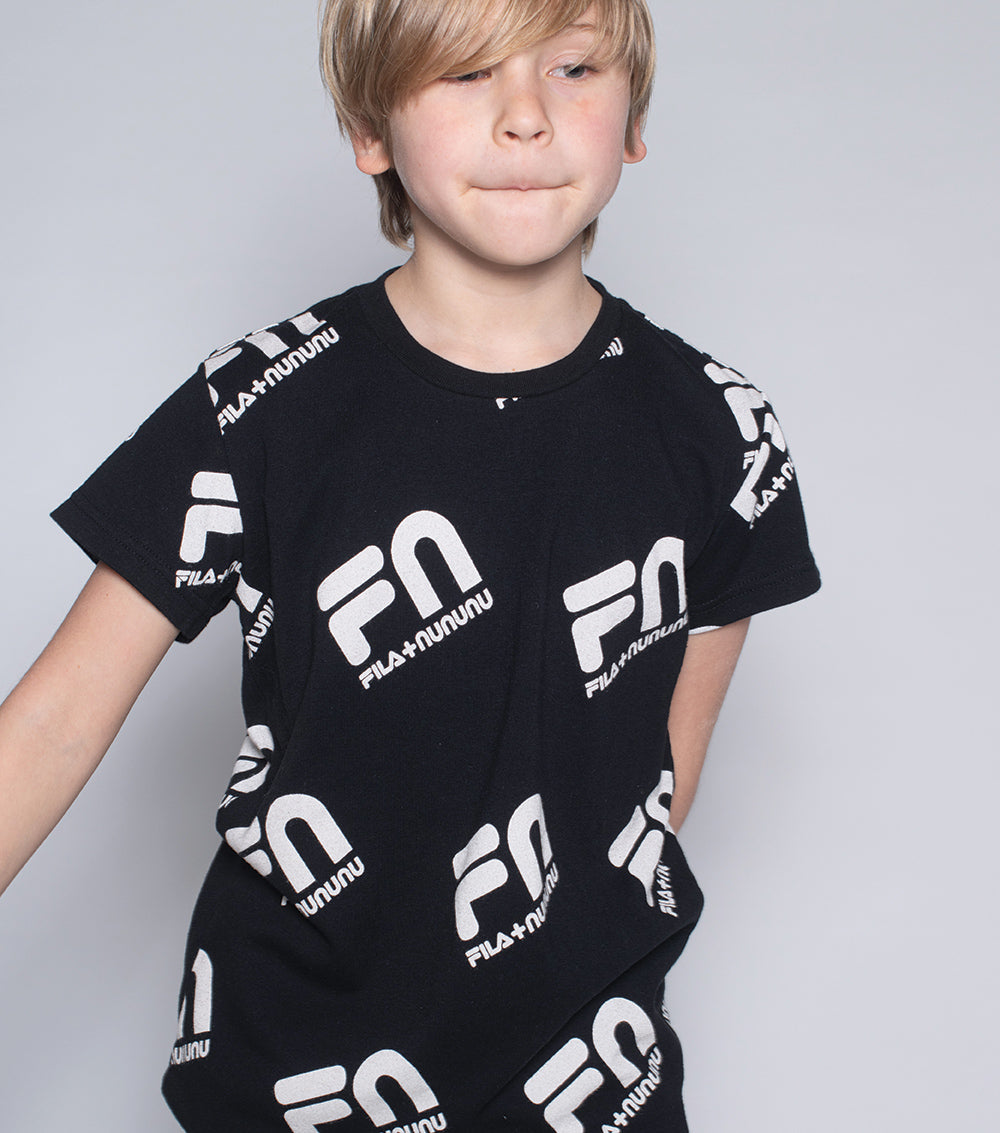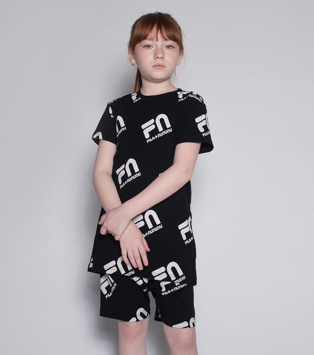 your fave nununu boy or girl will enjoy chilling out, going to sleepovers or just relaxing with the family in this unisex set. part of our collabo with FILA, this is not your ordinary kids’ loungeset. constructed of lightweight cotton, the t shirt & shorts combo features our mashup logo printed all over.