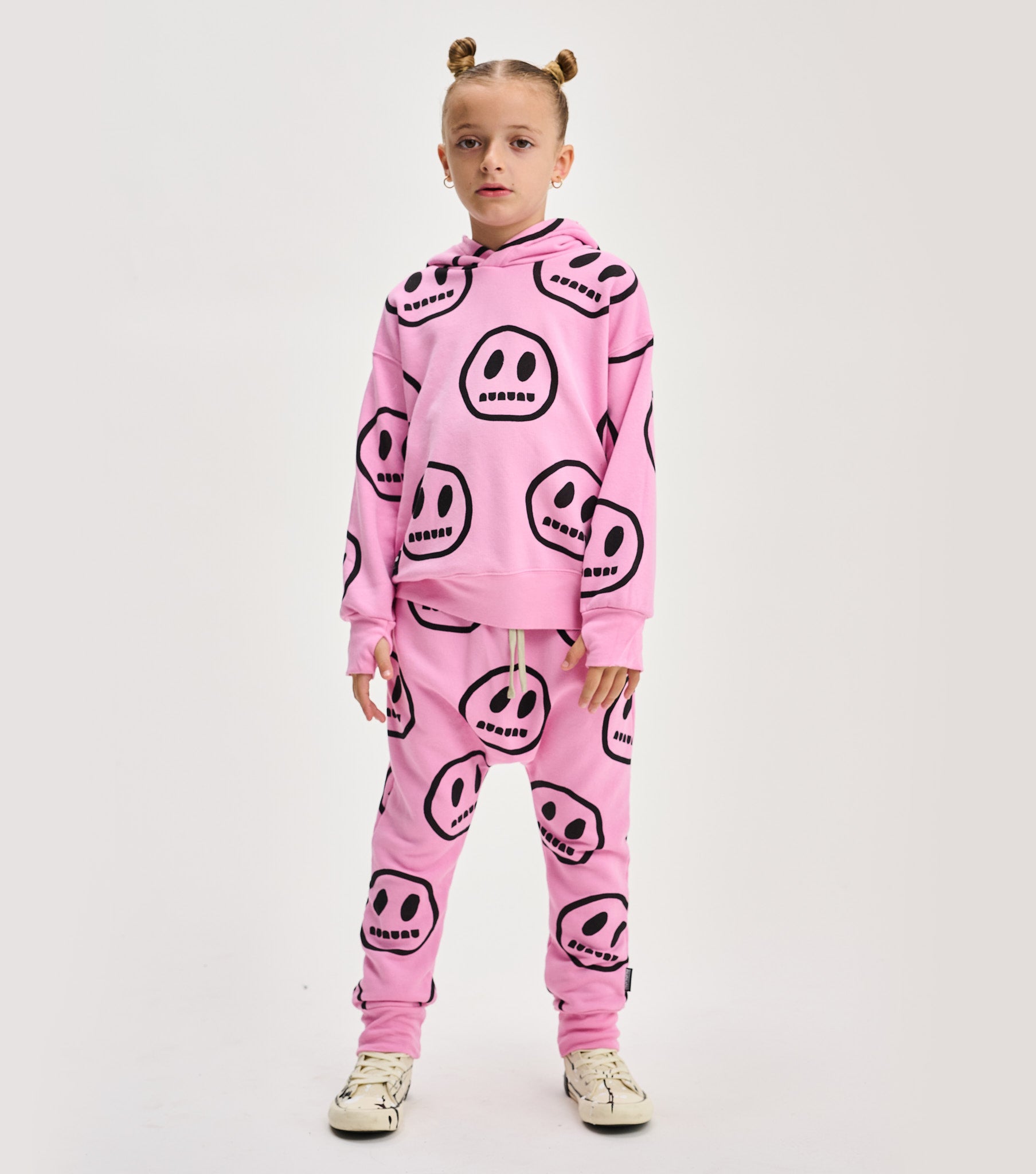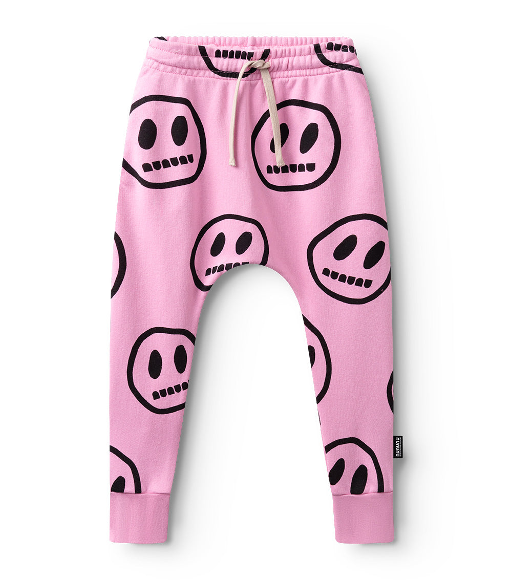 give your kid's wardrobe a dose of cool with the super pink nununu smile baggy pants. these black pants feature an all-over quirky smile print, combining fun and edge in true nununu style. the relaxed, baggy fit ensures maximum comfort and freedom of movement, making them perfect for playtime, chilling at home, or making a bold fashion statement on the go. with an elastic waistband and drawstring for easy wear, these pants are both practical and stylish. watch them rock the streets in these all-time favorite baggy pants!