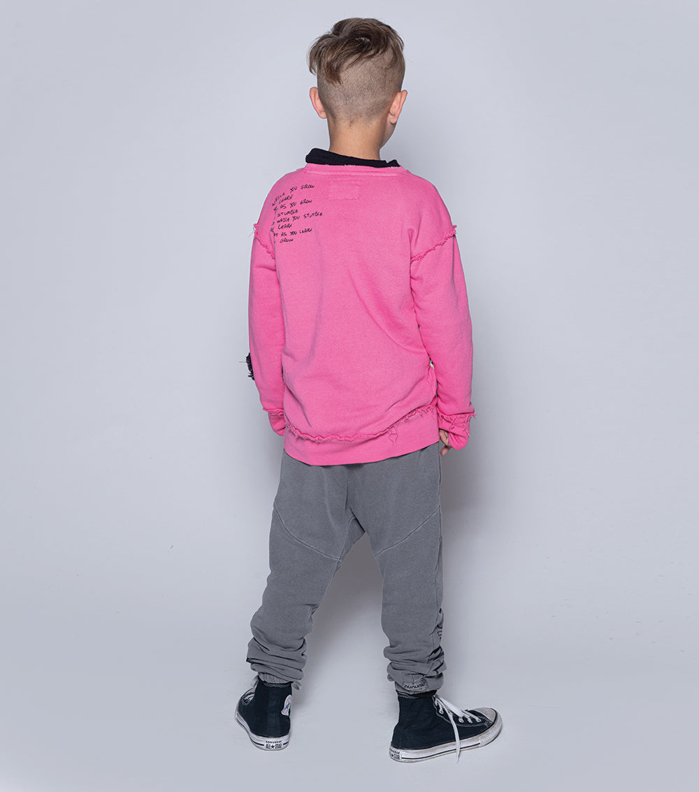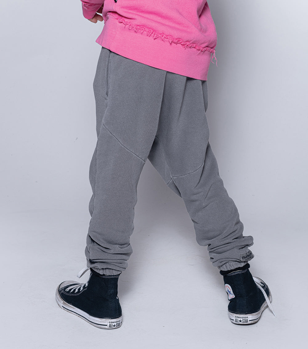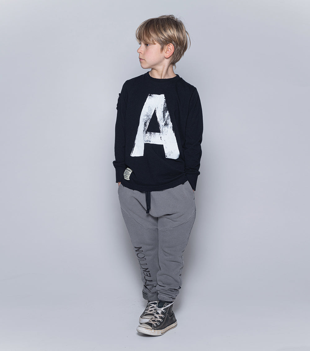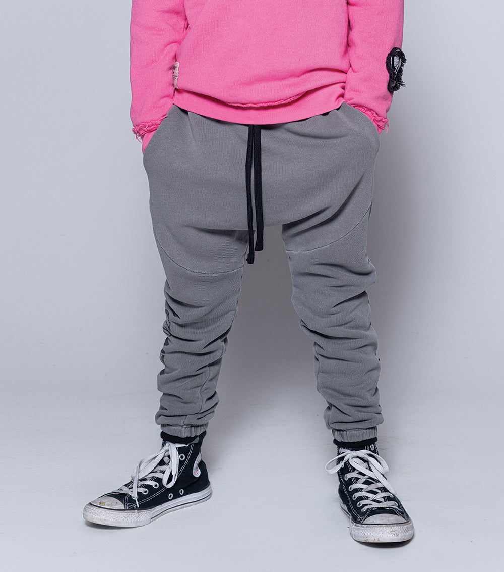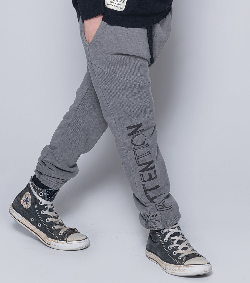 our beloved baggy pants get the vintage treatment in dyed grey with slash seams at the thighs. they’re roomy & slouchy, giving boys & girls the freedom they need to run, play & perhaps even sit still at times. meanwhile, they’re the softest, coziest things ever, with the ideal cut—loose on top, tapered to the ankle. one leg reads “attention” in hand-drawn block letters, because obviously. the care tag lives on the outside of the cuff, because we don’t do things like everyone else.