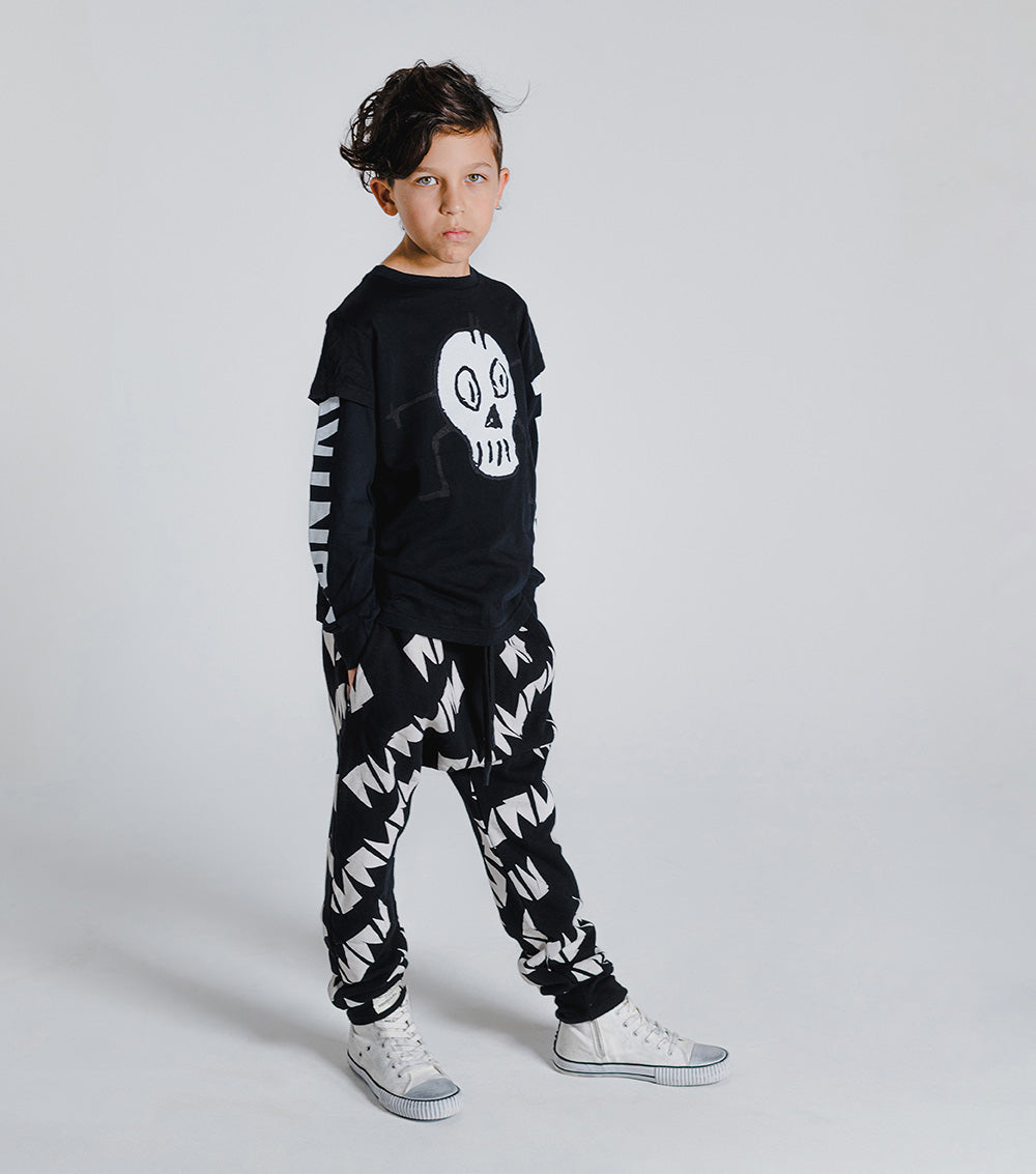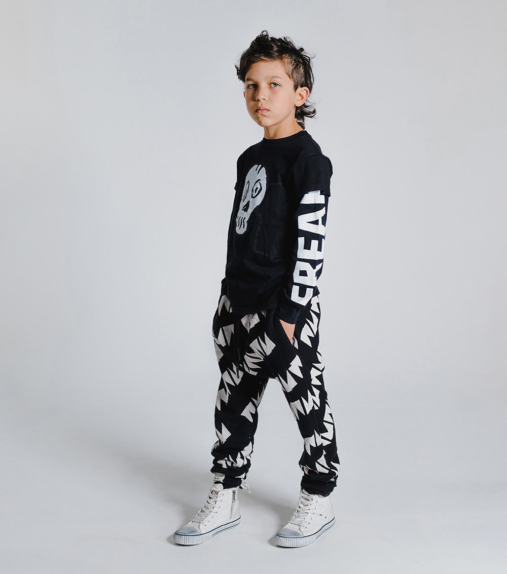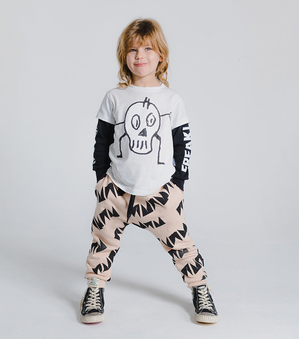 the abstract, angular version of our logo comes in on diagonal repeat on this classic nununu item, our baggy pants for boys & girls in nude. comfortable as hell in our soft cotton, they’re roomy & slouchy, giving legs the freedom they need to run, play & perhaps even sit still at times.