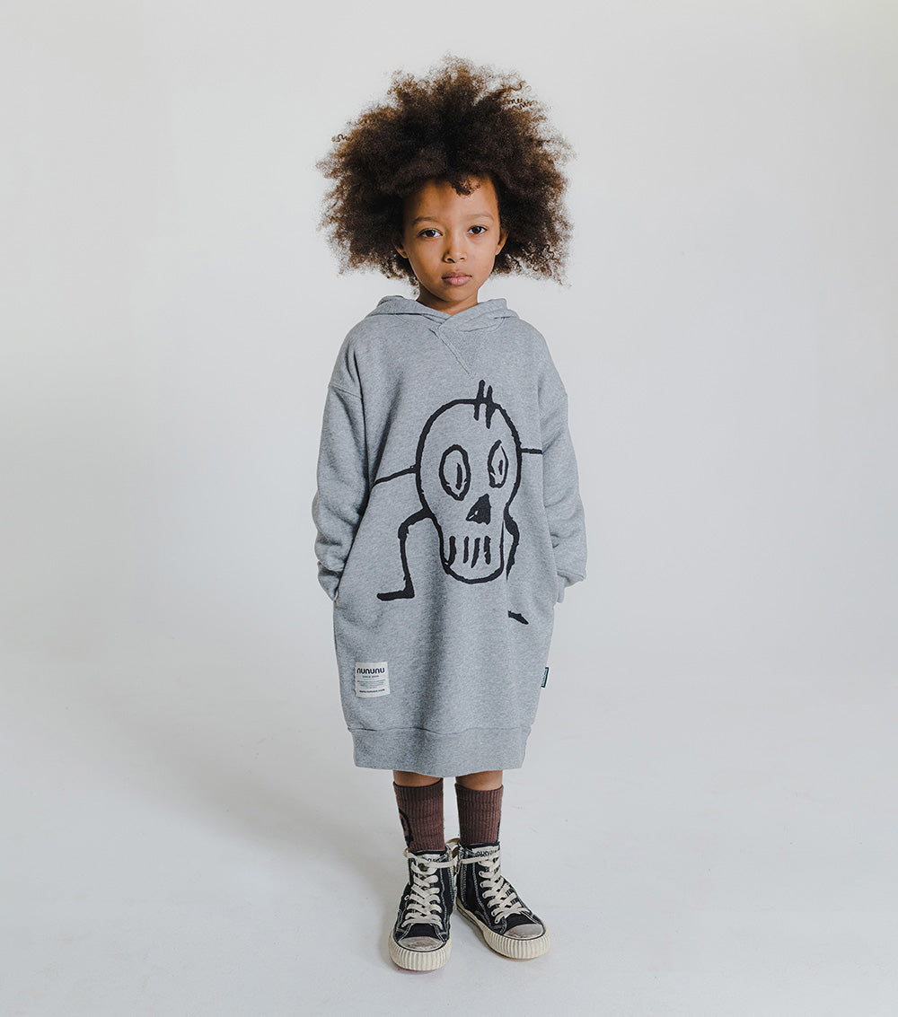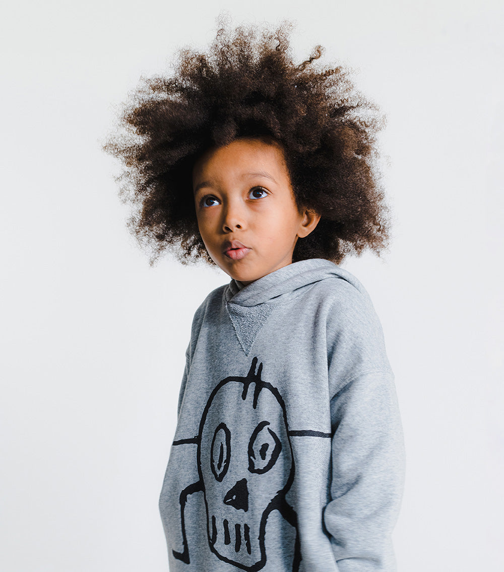 our latest take on the iconic nununu skull goes goofy with arms, legs & a tuft of hair scribbled on it—a collaboration with artist shay id alony. the new design comes nice & big on the front of this showstopping piece in black french terry. with its a-line cut & oversized hood, it’s a perfect throw-it-on to pair with leggings & jackets when it gets chilly. thumbholes & side pockets keep hands warm & secure, always.