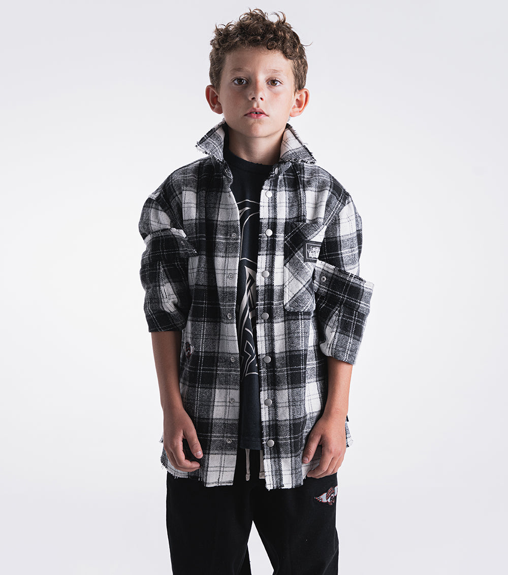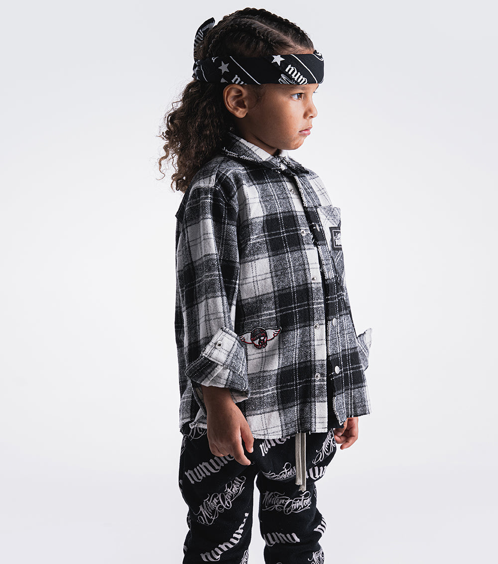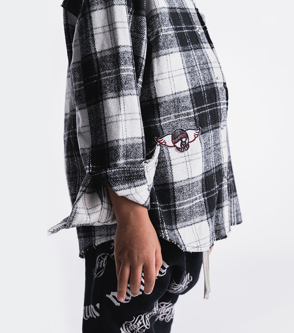 this gender-neutral shirt is the piece of your grungy dreams. it was made in collab with super famous tattoo and talented tattoo artist mister cartoon so it's got his signature winged dude inspired by graffiti making sure we never forget our roots embroidered on. the black & white pattern is classic but the bottom hem is looking a little chewed up for that subversive edge we like. it’s made of the literal softest flannel and has super convenient snap buttons. layer this shirt over & under anything or leave it buttoned on its own. either way it's the chillest look you’ve ever seen.