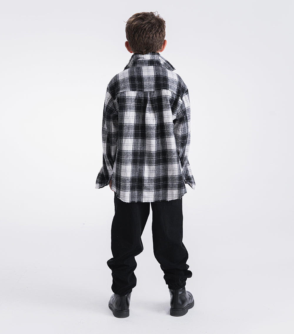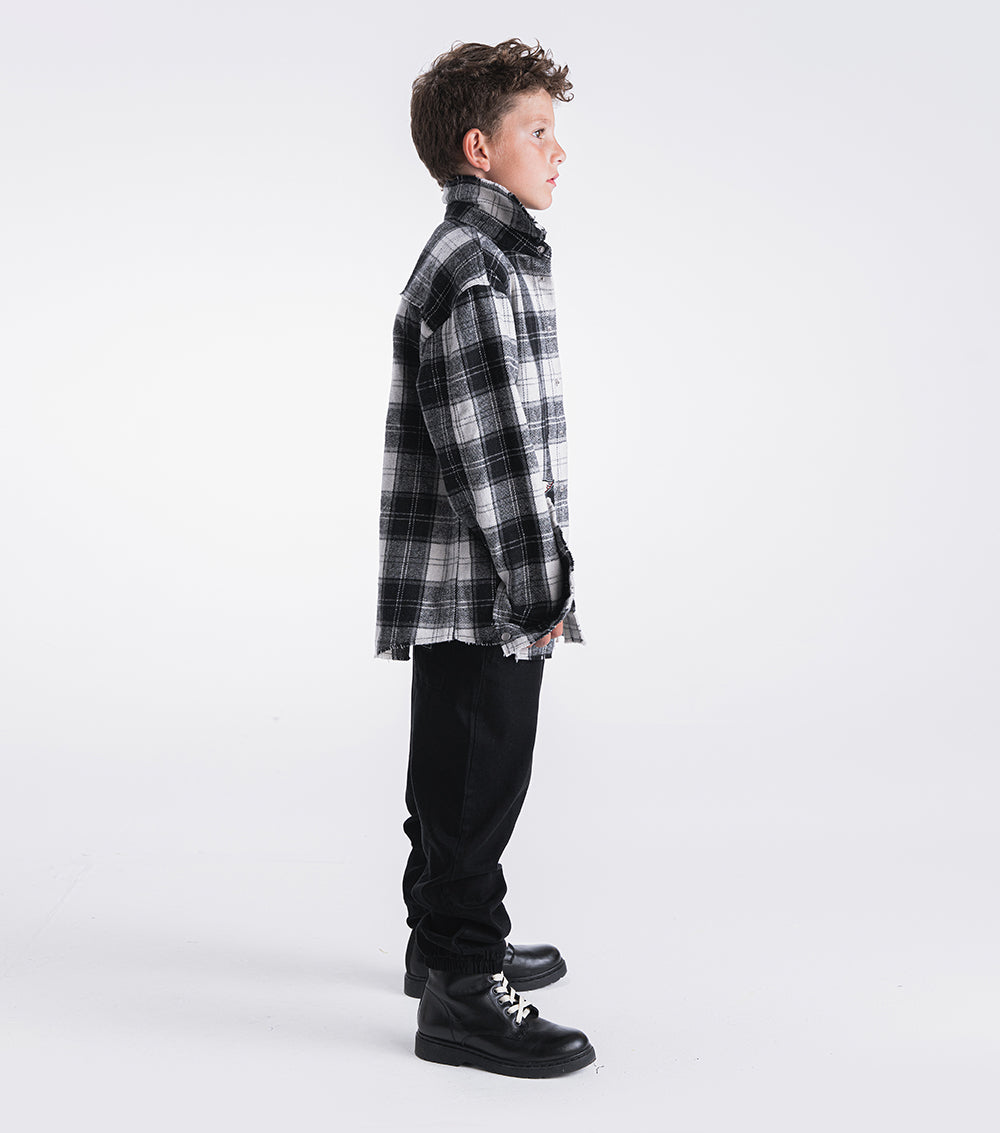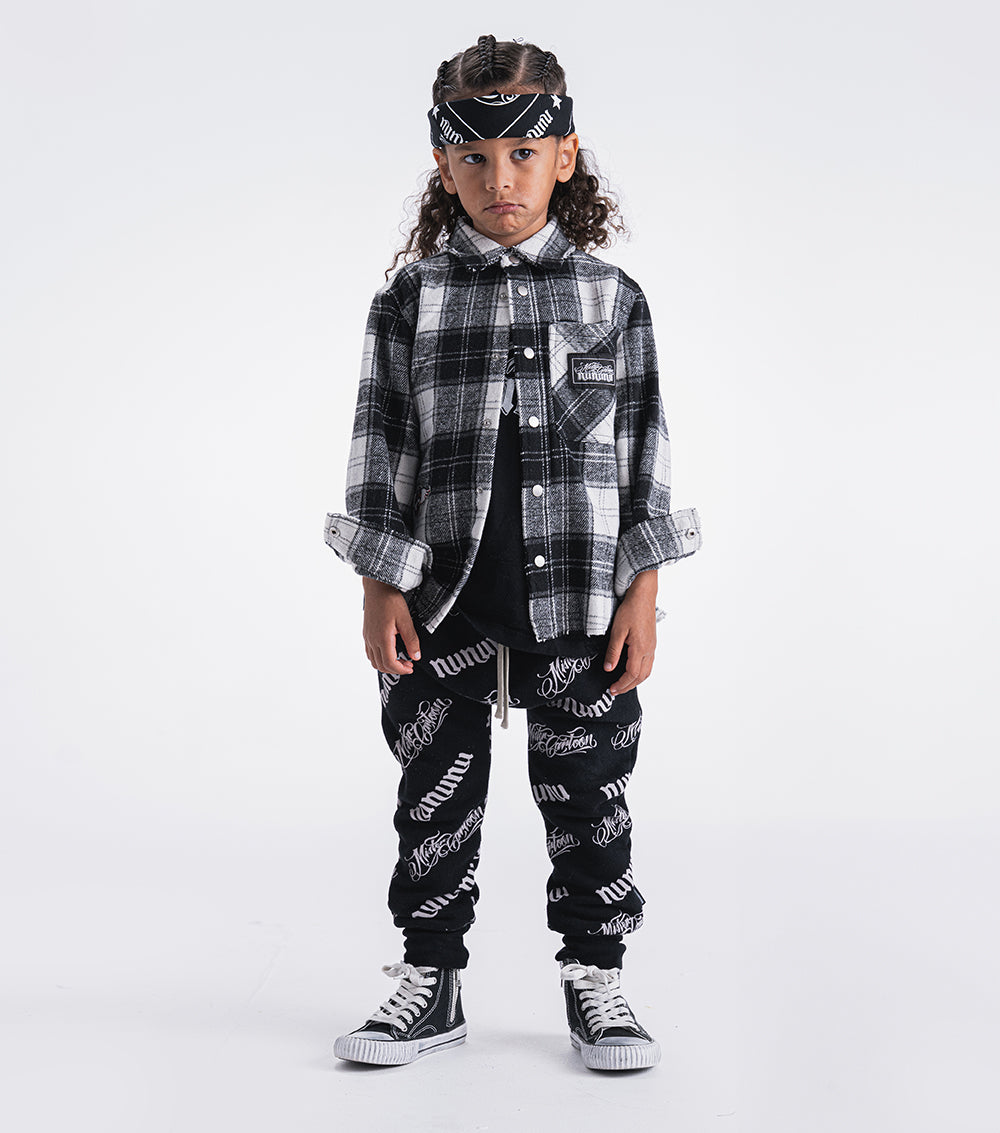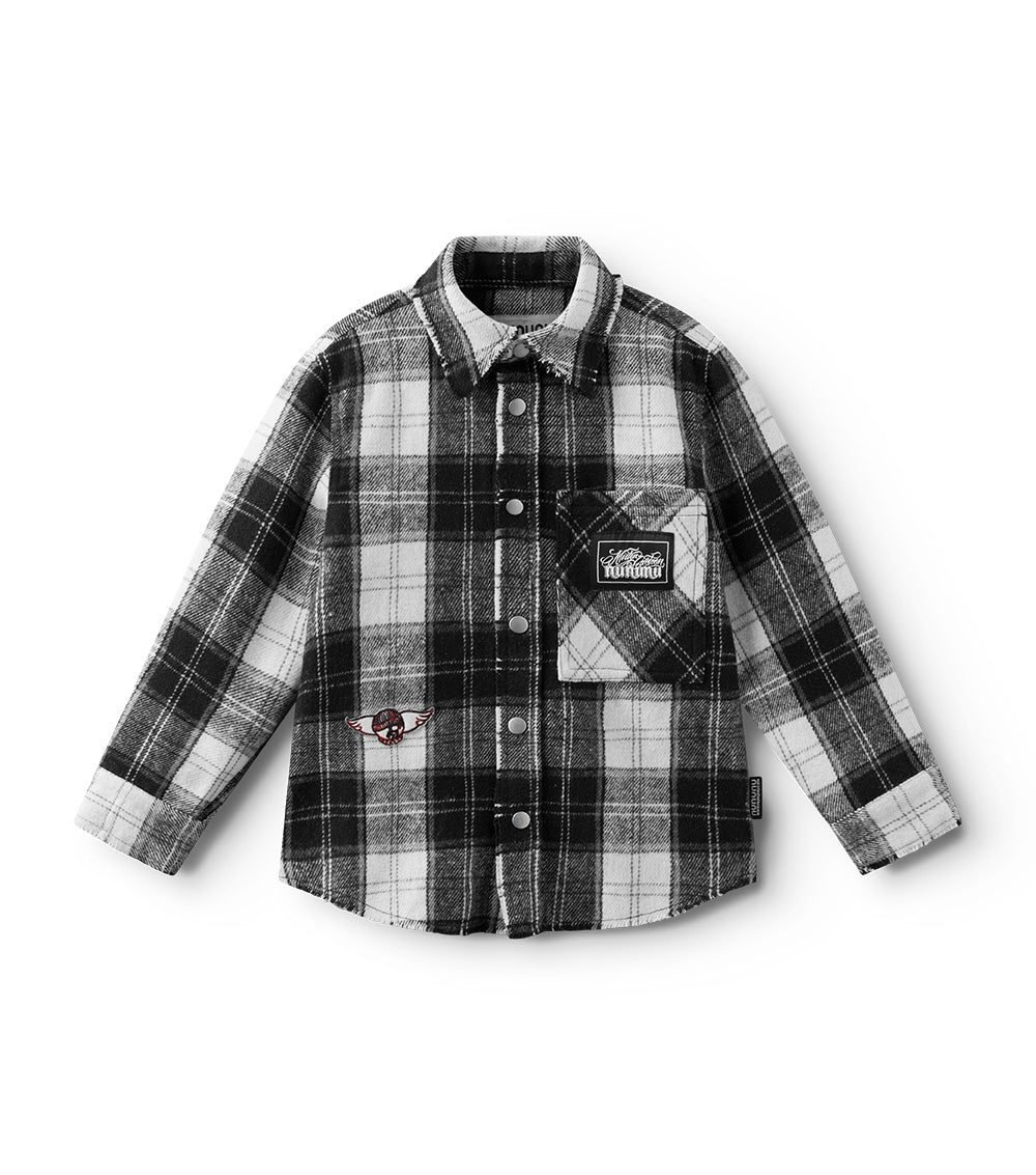 this gender-neutral shirt is the piece of your grungy dreams. it was made in collab with super famous tattoo and talented tattoo artist mister cartoon so it's got his signature winged dude inspired by graffiti making sure we never forget our roots embroidered on. the black & white pattern is classic but the bottom hem is looking a little chewed up for that subversive edge we like. it’s made of the literal softest flannel and has super convenient snap buttons. layer this shirt over & under anything or leave it buttoned on its own. either way it's the chillest look you’ve ever seen.