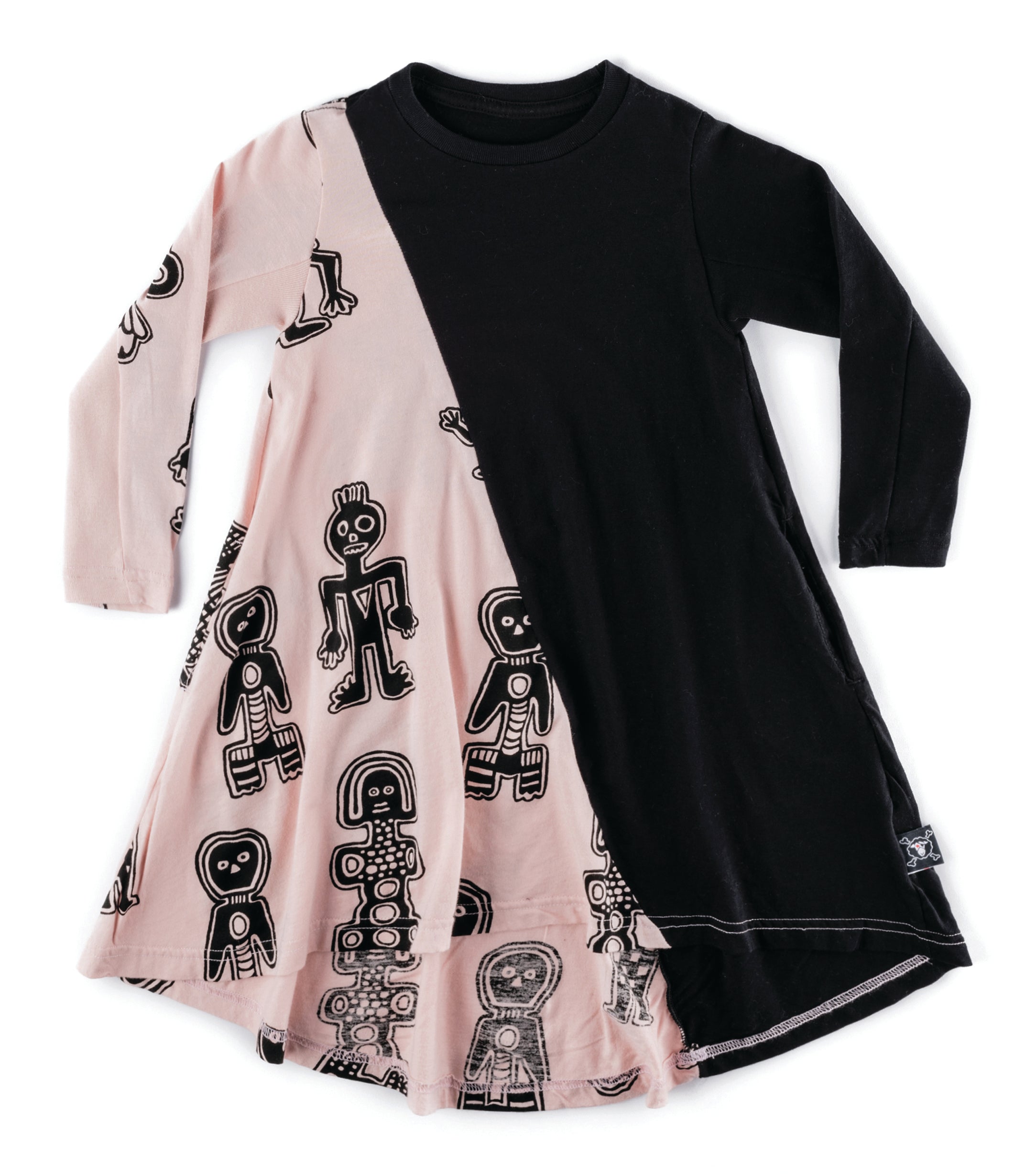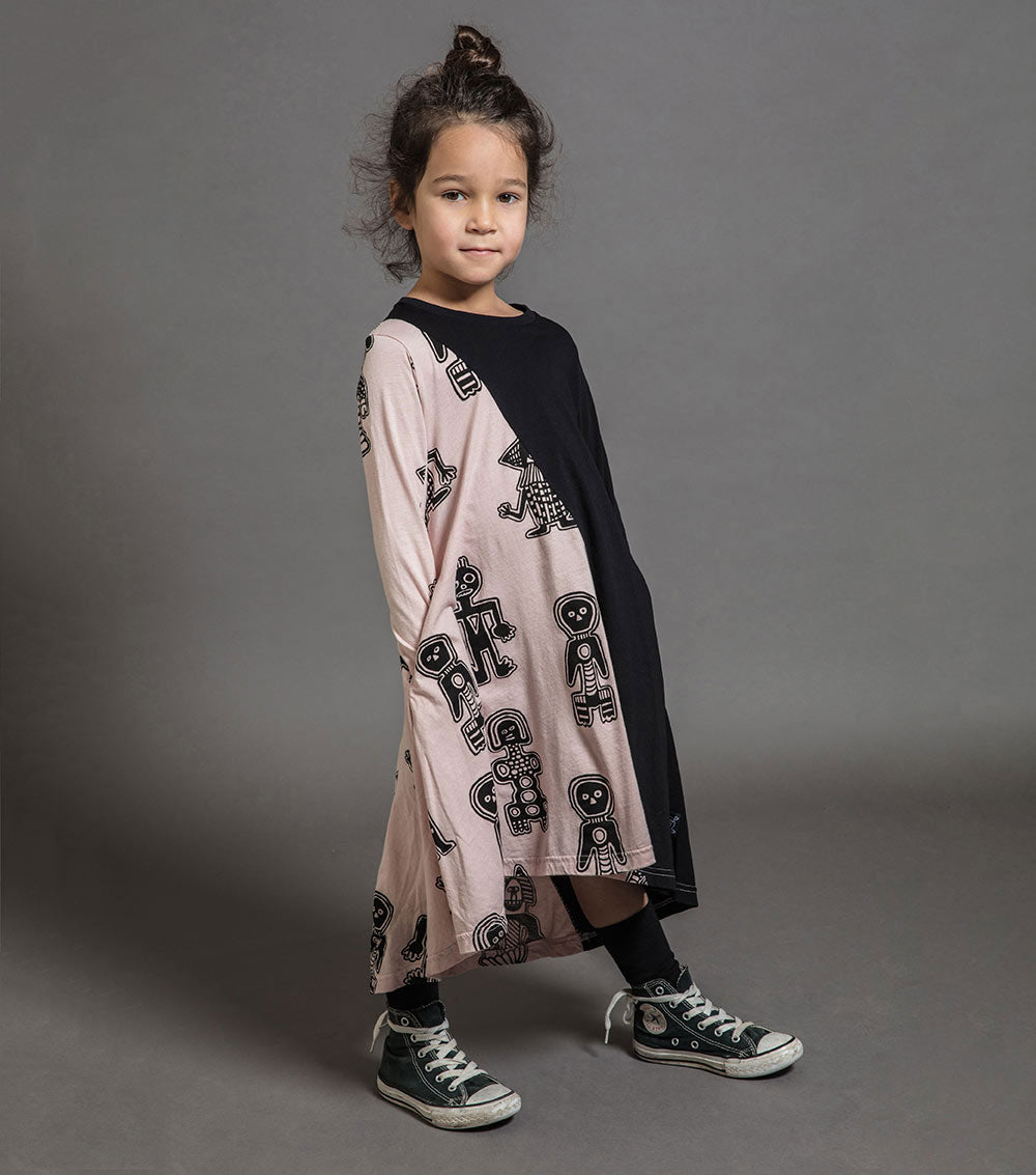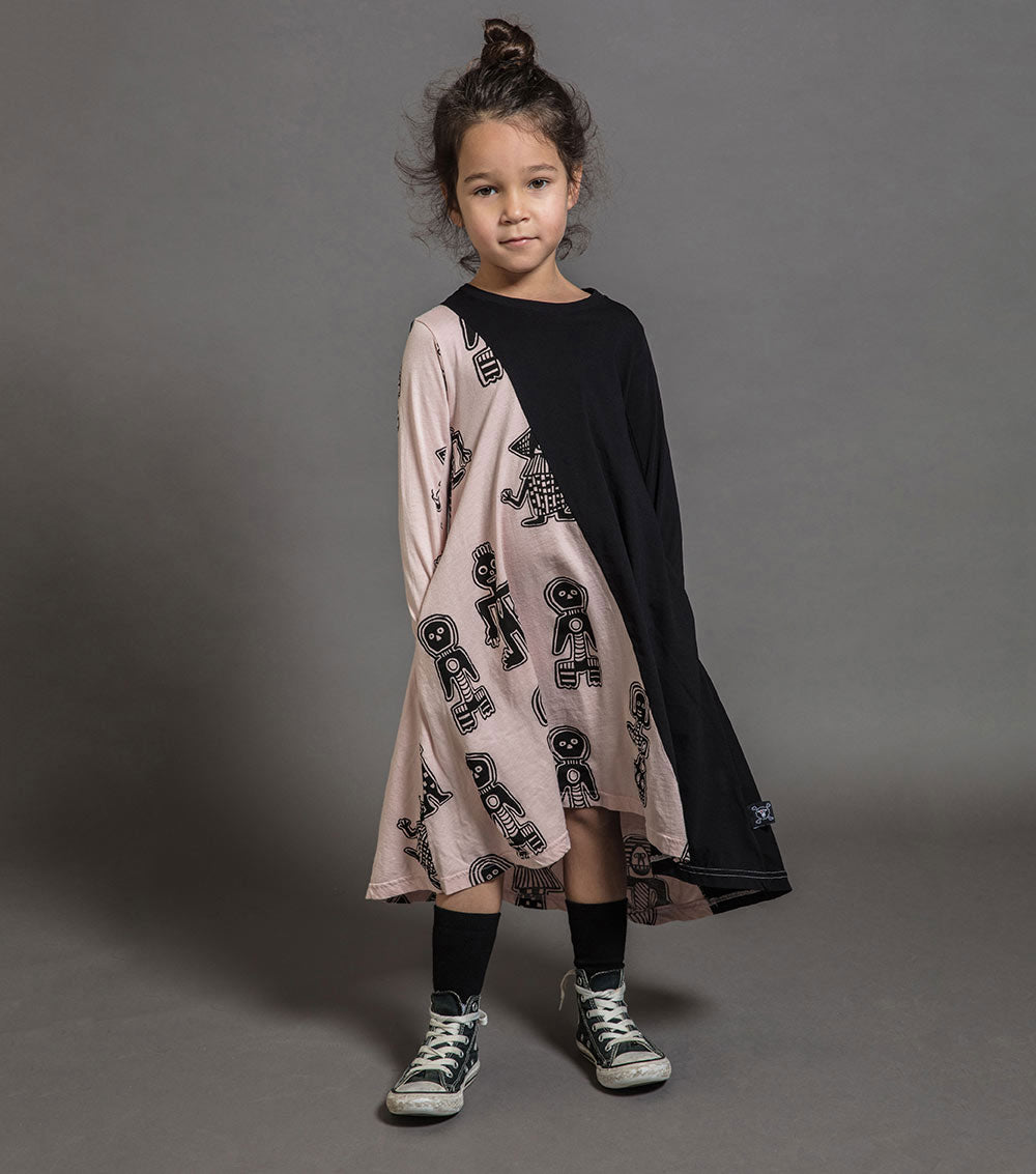 the classic nununu 360 dress is now updated with half-&-half black/powder color block featuring our zany tribal dancer print, a design collaboration with artist Shay Id Alony. it creates this cool visual effect when swirling around, which is the whole point of this dress, basically. long & full but not bulky, the 360 is super comfy with thumb sleeves to keep her hands cozy while dealing with the dizzies.