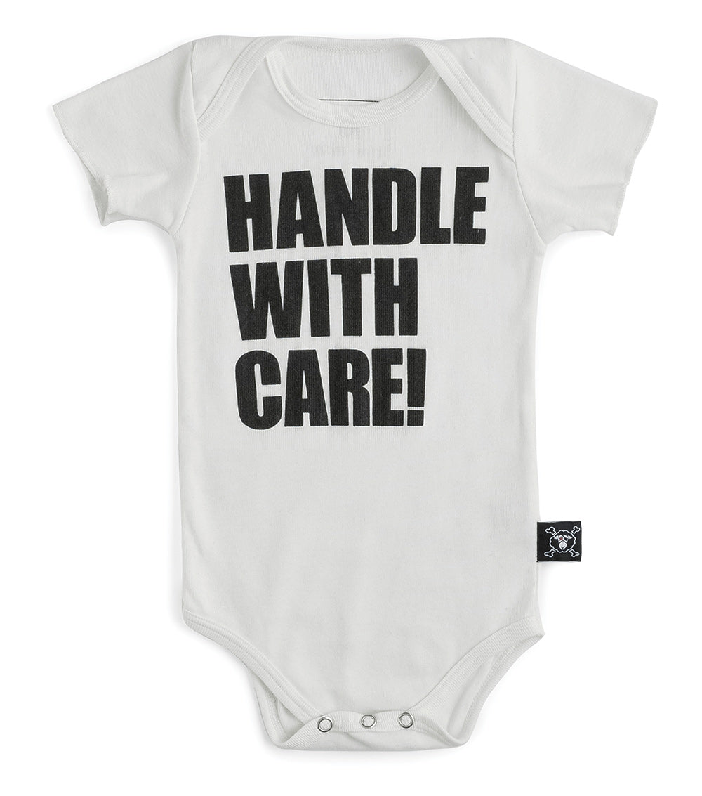 our white short sleeve onesie screams “handle with care!” because babies are obviously fragile packages. this classic item goes on with zero friction. snaps at the crotch make diaper changes way easier, and shoulder flaps let you pull it down from the top—whatever’s easiest in the moment. raw edges keep it real.