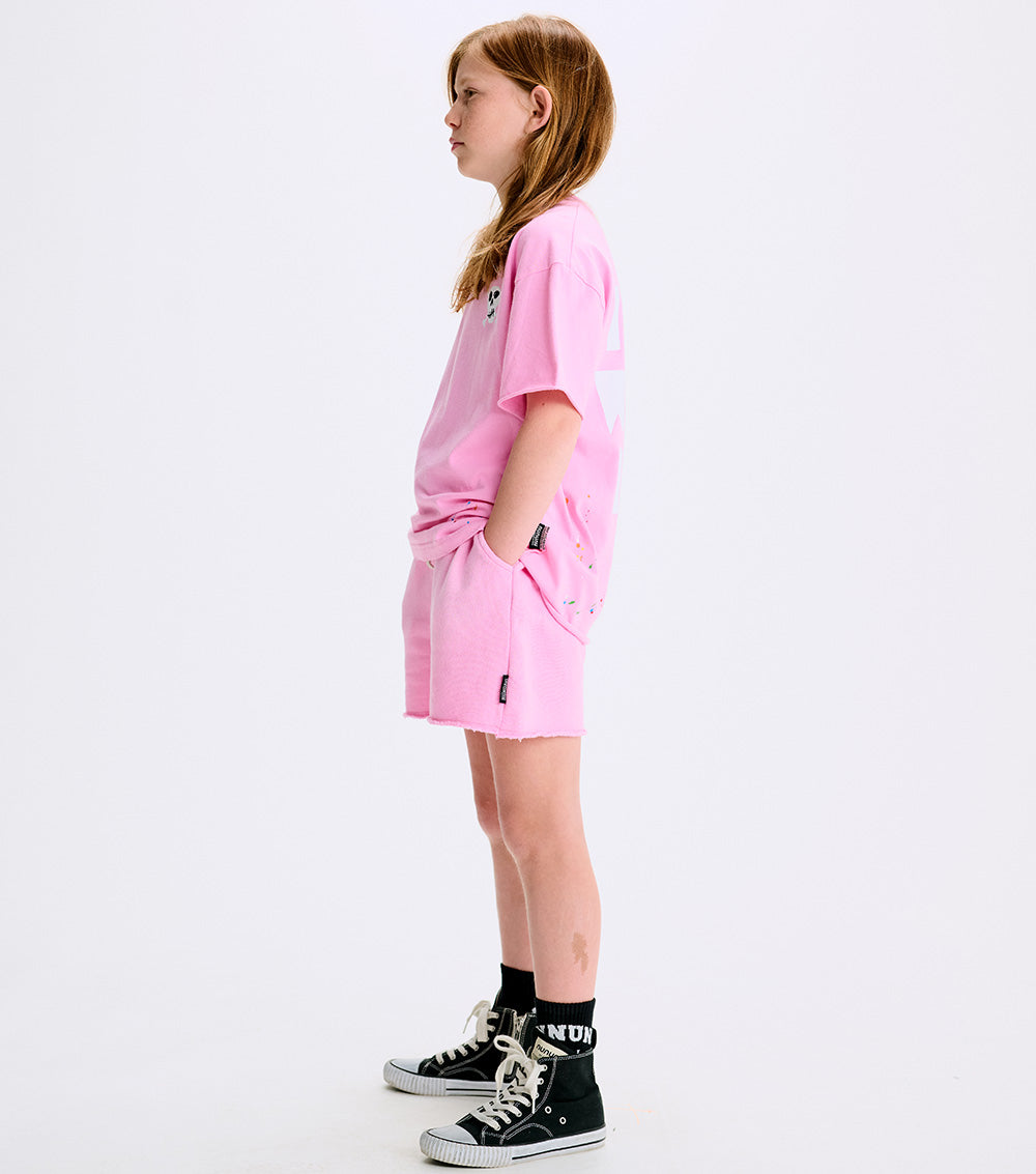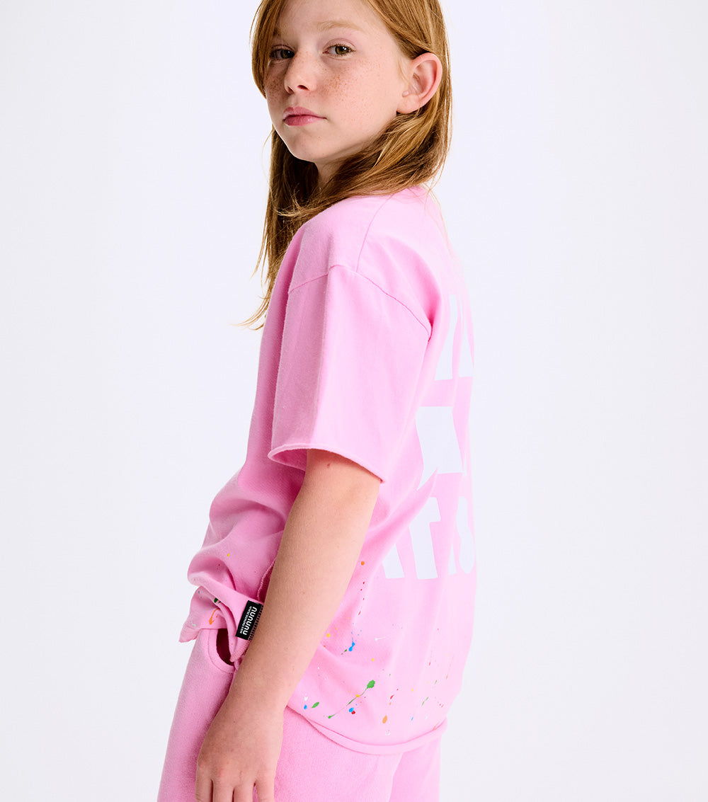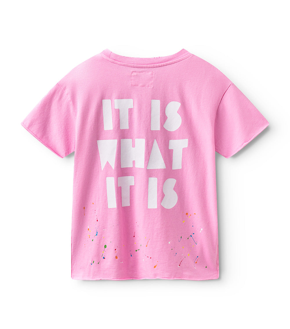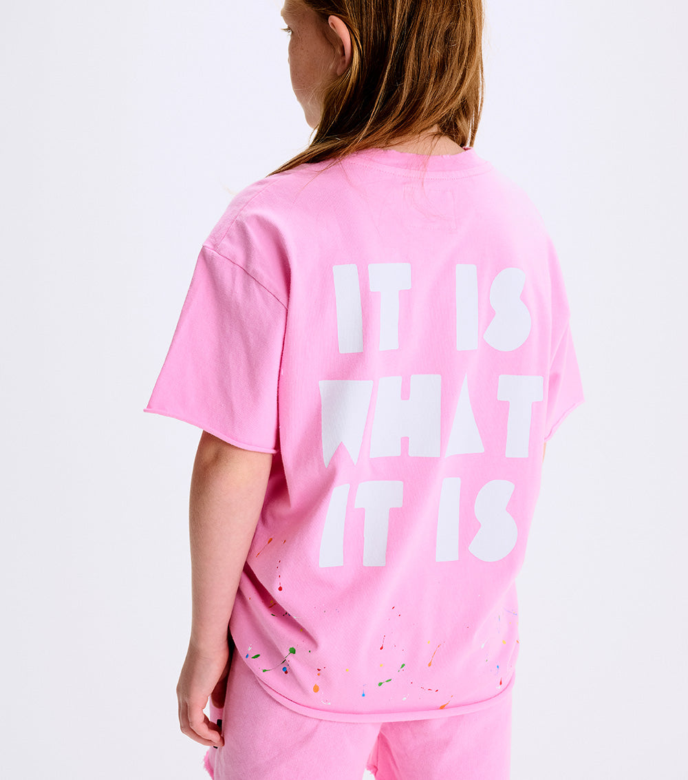 if your kid is equal parts artist & rebel, this is the shirt for them. it’s made of super pink heavy single cotton in a gender neutral cut with custom deconstruction and colorful handsplashes of paint making a statement on the front & back. plus, it’s got raw edges on the sleeves & the bottom hem on the backside. kinda like they took scissors and made it their own. even better, it’s got a tiny woozy skull print on the chest that almost looks drawn on in pencil. turn around and it says it is what it is, nice & big in white in our video game style font. because some days they’re just too creative to simply say whatever.