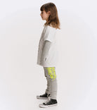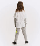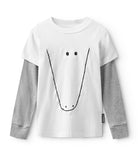 get kooky with this single cotton twofer that’s ready to bite. it’s a simple gender neutral, white long sleeve fit with a smokey red tee on top. but peep the side eye look from the croco print. it kinda looks like it’s hunting for a snack, just like the kiddo wearing this fit usually is. subtle custom deconstruction makes it look like it's already taken a few nibbles straight out of your kid’s new favorite tee.