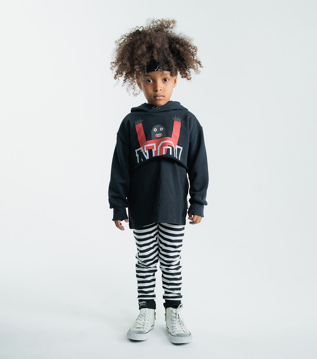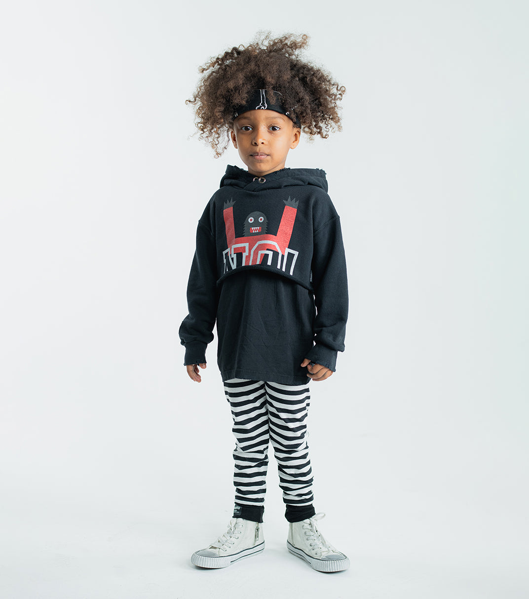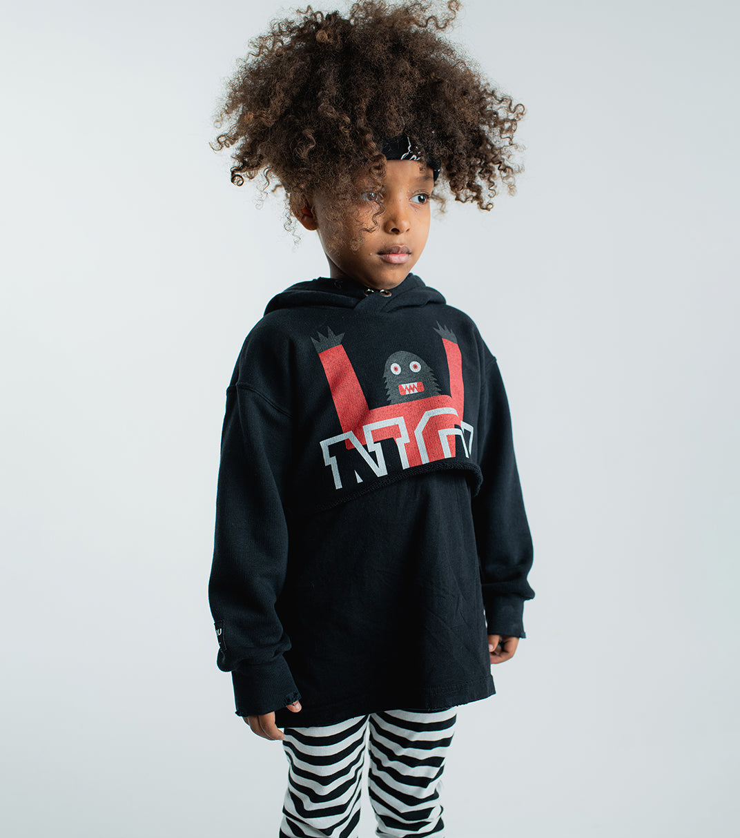 our new kooky monster is a creation by our favorite illustrator craig hopson (aka “craigio”). he shows up big on this black unisex “interrupted” gray hoodie, along with the word “no!” on the chest. except the whole thing is just hacked off in the middle for a completely punk look that is perfect to rock all summer long. soft & cozy in french terry, this guy is relaxed & a little bit rough around the edges. wear it with swimsuits or layer over tanks & tees for a super edgy style moment.