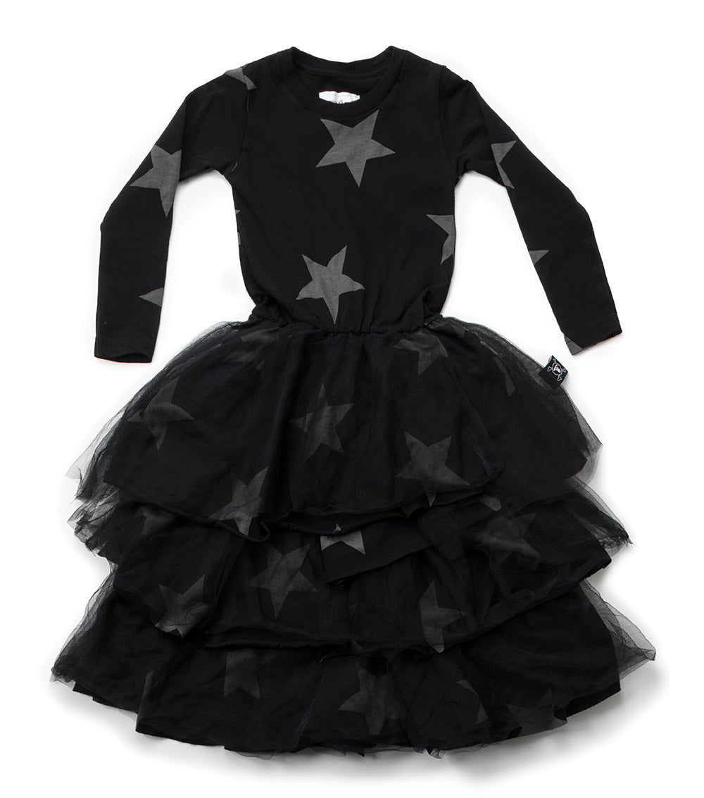the 2018 Carrie Bradshaw moment none of us knew we needed. this soft black cotton dress features expressively layered tulle for tearing up the playground or a playdate with spirit. an all-over star print adds the little star power. finish the look with a smize.