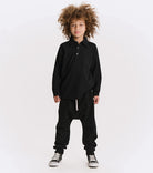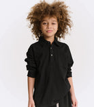 watch out dad’s closet, this shirt is coming for your all-time favorite look. it’s a classic, long sleeved polo made of a black pique so it’s super breathable with a ribbed collar just waiting to be popped. it’s a gender neutral cut with a washed sort of look that gives it a pre-loved through the decades feel. it’s a little faded and a little vintage in a way that seems like maybe it was a back to the future vibe.