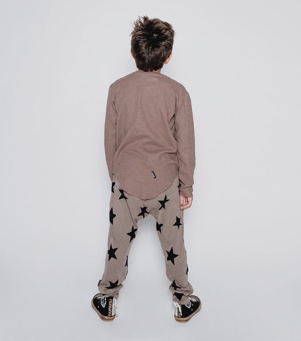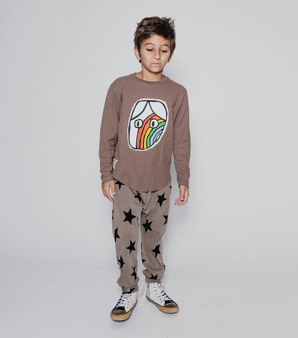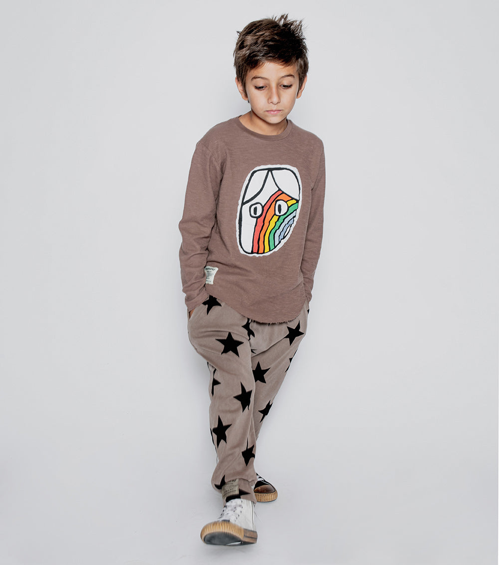 sometimes seeing stars is a good thing, because you can make all the wishes you want. it’s a classic nununu print splashed across yet another classic nununu piece, the moss green star baggy pants for boys & girls. they’re roomy & slouchy, giving legs the freedom they need to run, play & perhaps even sit still at times.