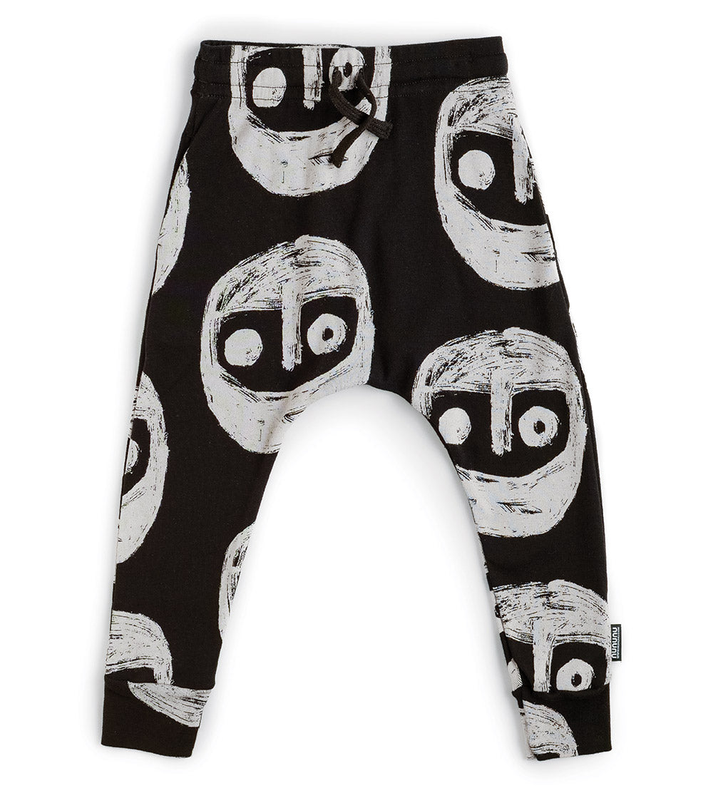 the warrior. this very nununu design -a collaboration with artist shay id alony- is a fun take on the global culture of face-covering that defines our times. we’ve always been fans of the eyes-only look anyway (see our ninja shirts) and this guy lets the boys & girls lean into it while expressing a strange sense of human unity. he comes scribbled all over our beloved black baggy pants. they’re roomy & slouchy, giving legs the freedom they need to run, play & perhaps even sit still at times. this print is part of our on-going collaboration with international artist shay id alony with whom we are proud to partner with. for more about shay click here