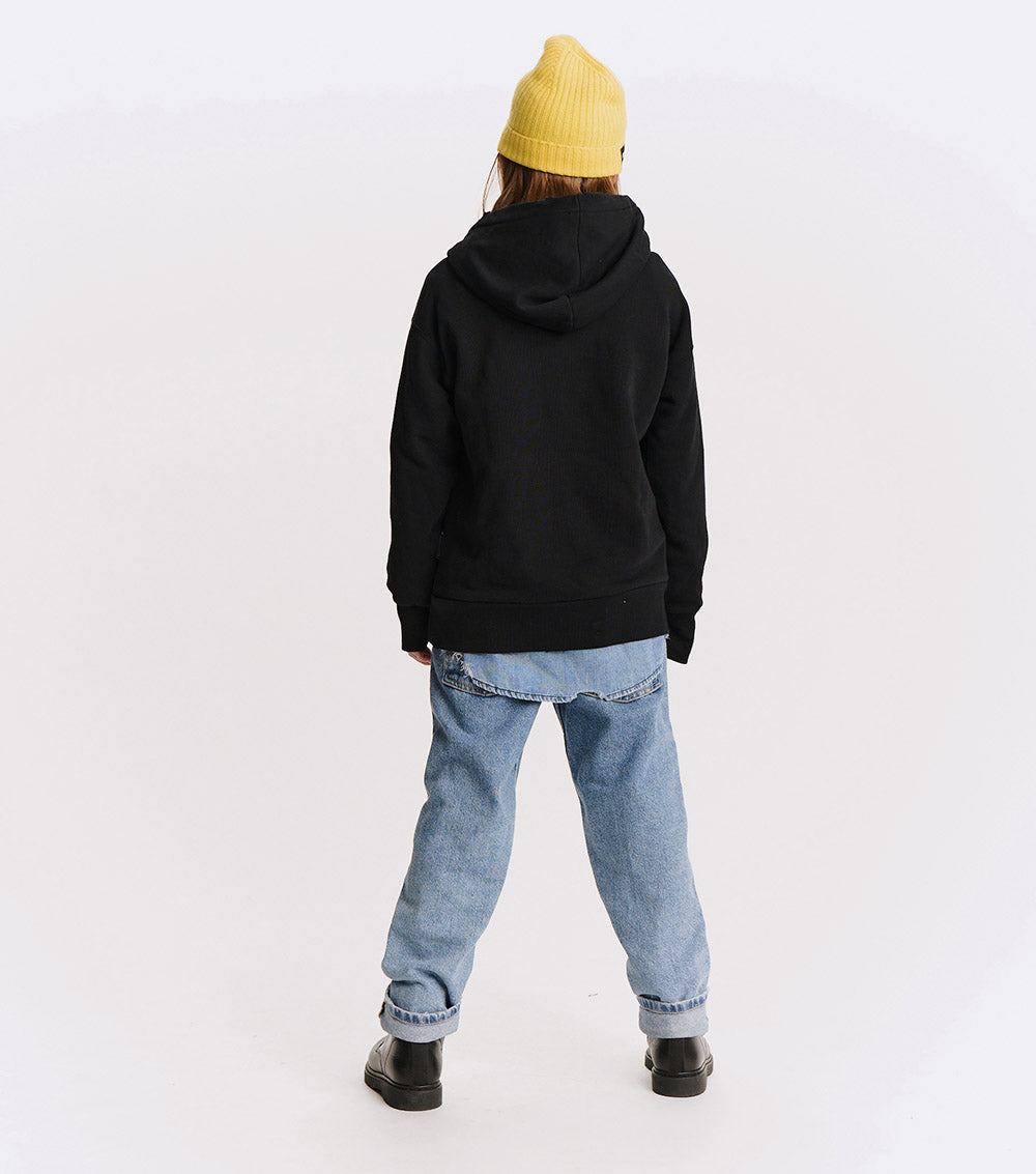 for the kid that’s already been there, done that, we’ve got a fit to show it off. it’s a neutral cut made of super soft black french terry with a big overlapping hood, cool kid thumbholes & custom deconstruction details for that worn-in, lived-in, seen-the-world look they know & love.  the front features a nostalgic print to remind you of the souvenir stores with those nostalgic i love tees. in place of the usual heart, we’ve got a smirky smiley who looks like it’s gatekeeping all the best travel spots