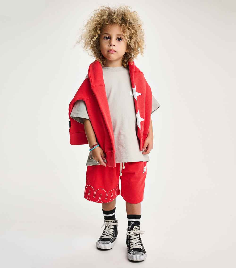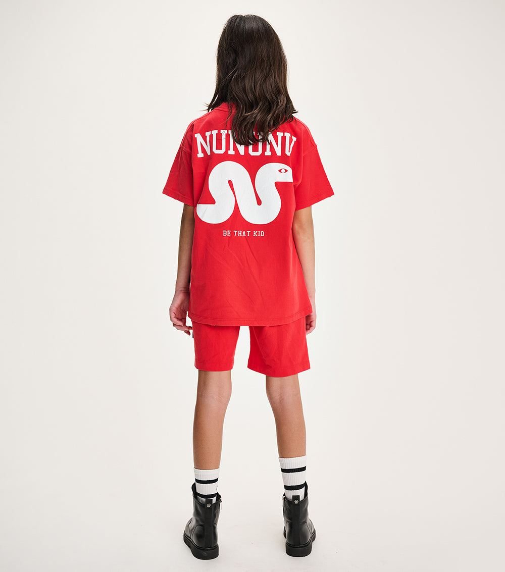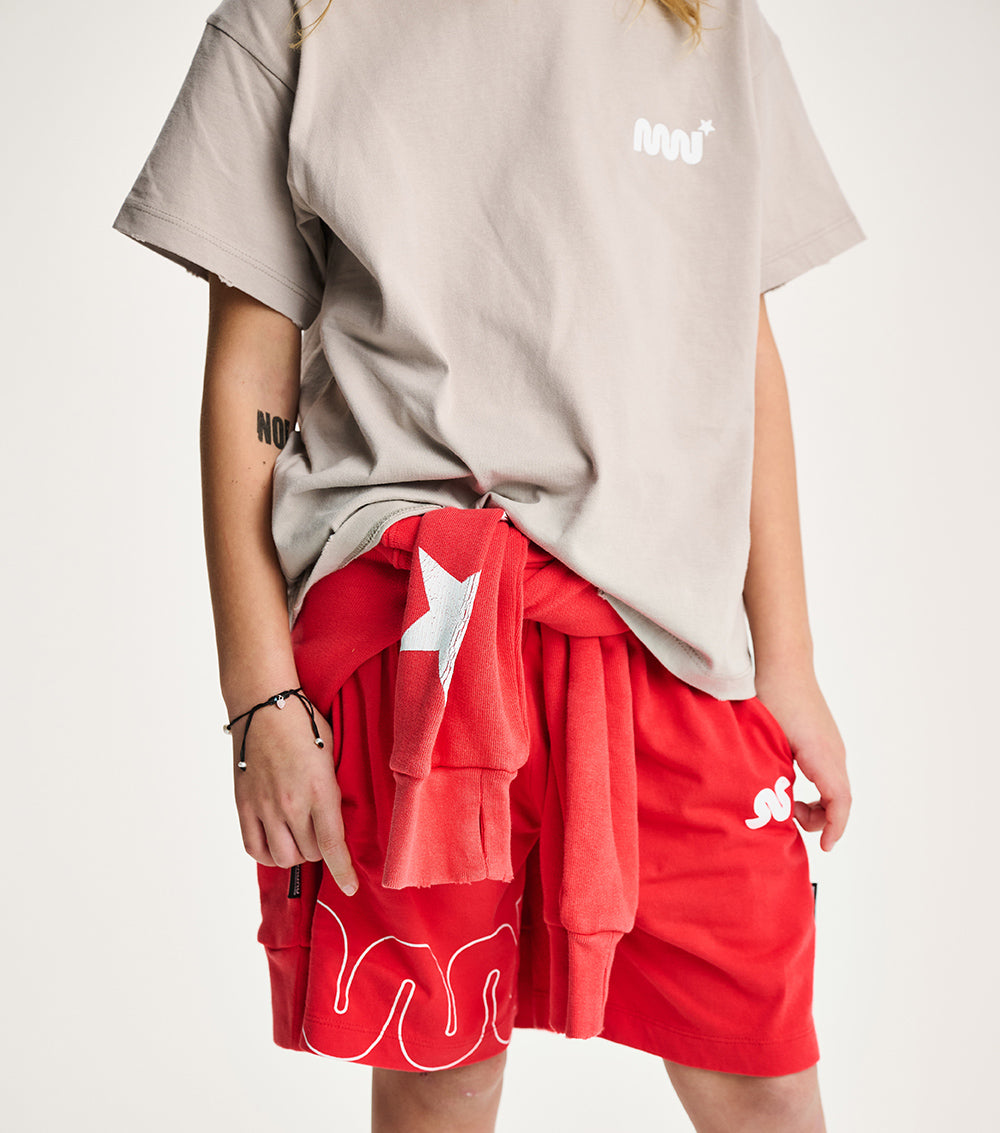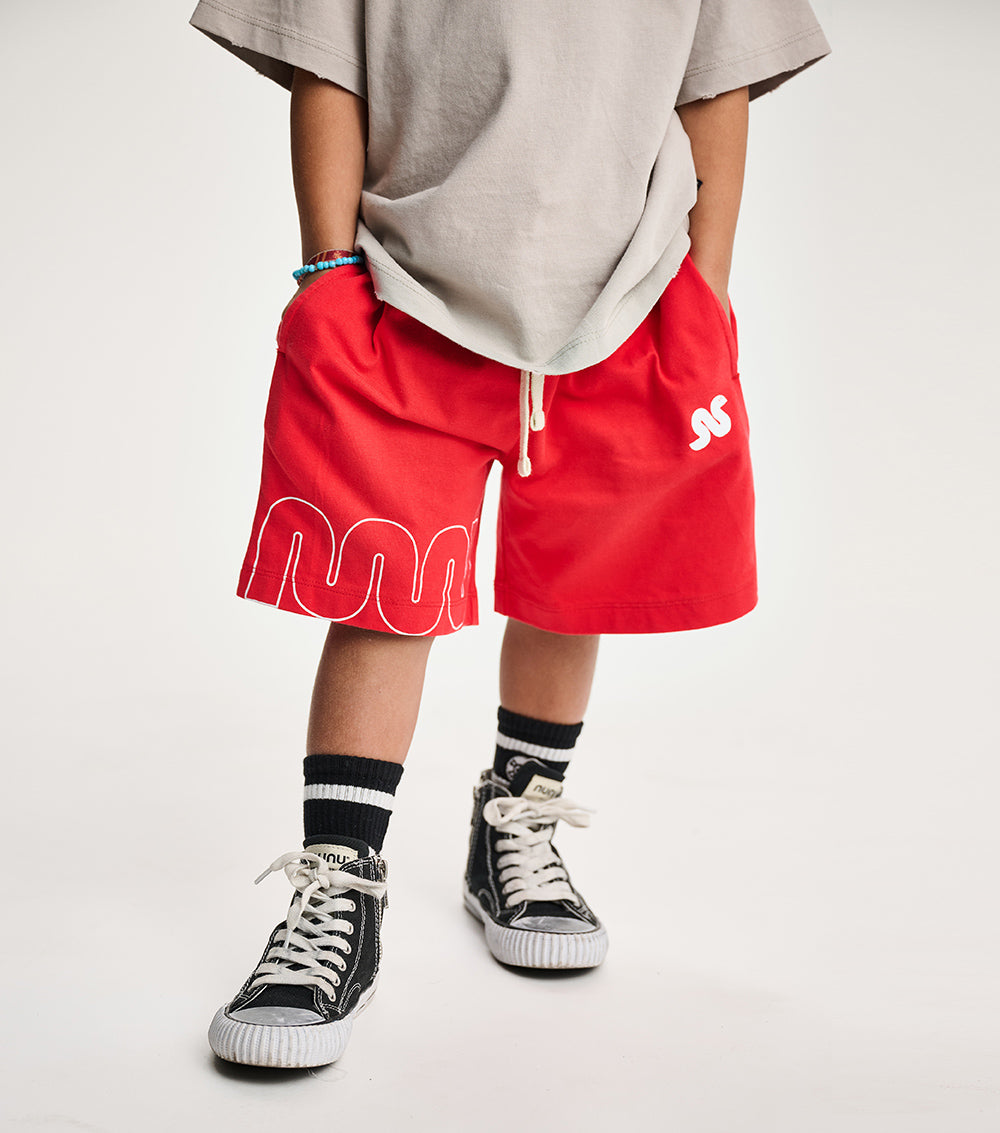 sleek, cool, and built for bold moves, these washed red heavy single cotton shorts feature our logo imitating a striking white snake that winds its way around the leg. made for comfort and style, they come with an elastic waistband, contrasting drawstrings, side pockets and an edgy vibe perfect for kids ready to slither their way into the spotlight.