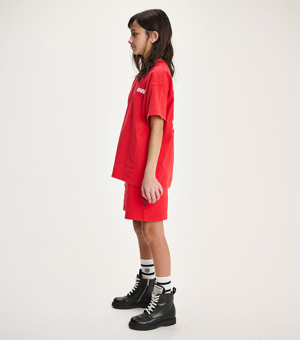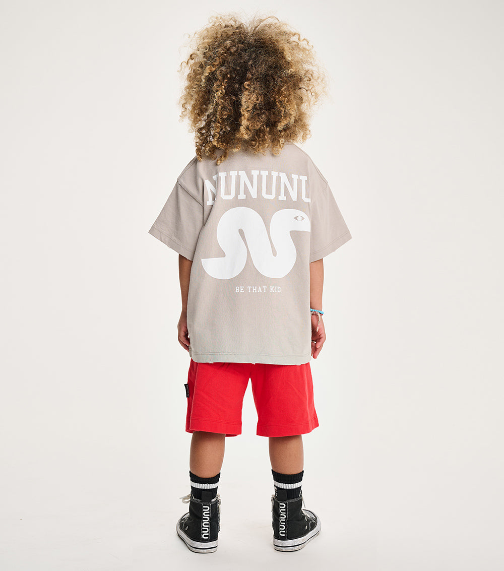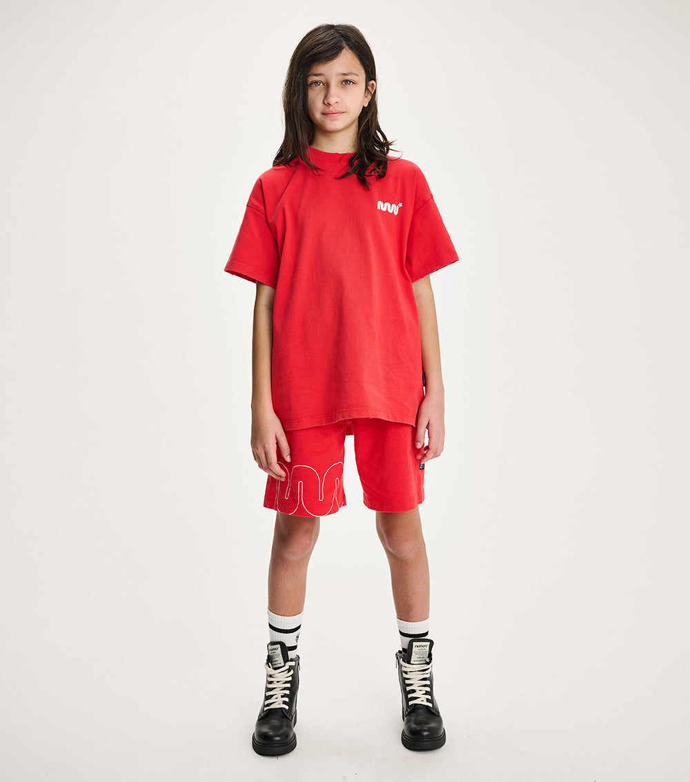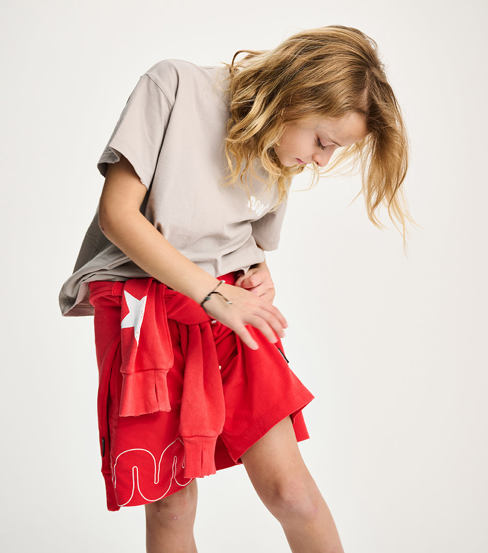 sleek, cool, and built for bold moves, these washed red heavy single cotton shorts feature our logo imitating a striking white snake that winds its way around the leg. made for comfort and style, they come with an elastic waistband, contrasting drawstrings, side pockets and an edgy vibe perfect for kids ready to slither their way into the spotlight.