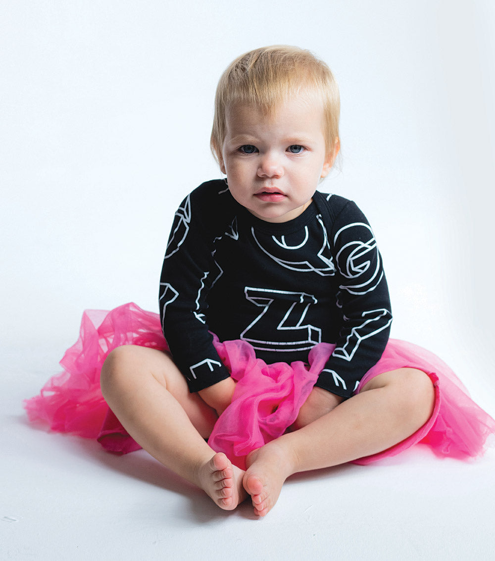 when the baby is in the mood to be extra, this black tulle skirt does not disappoint. it’s giving madonna vids, courtney love magazine covers & carrie bradshaw street style—with soft cotton underpants attached! generous layers of tulle cascade down while a black elastic logo waistband keeps it snatched. pair it with sneakers to up the grunge factor, or add ballet slippers & a sparkly headband for a legit event appearance.