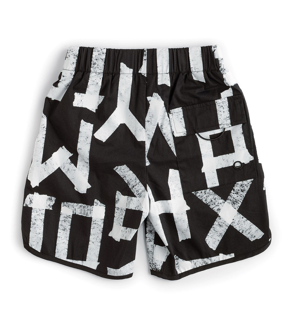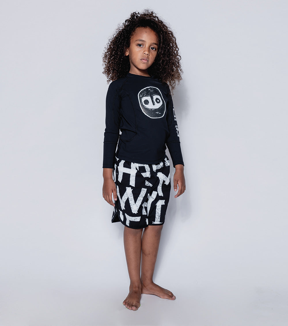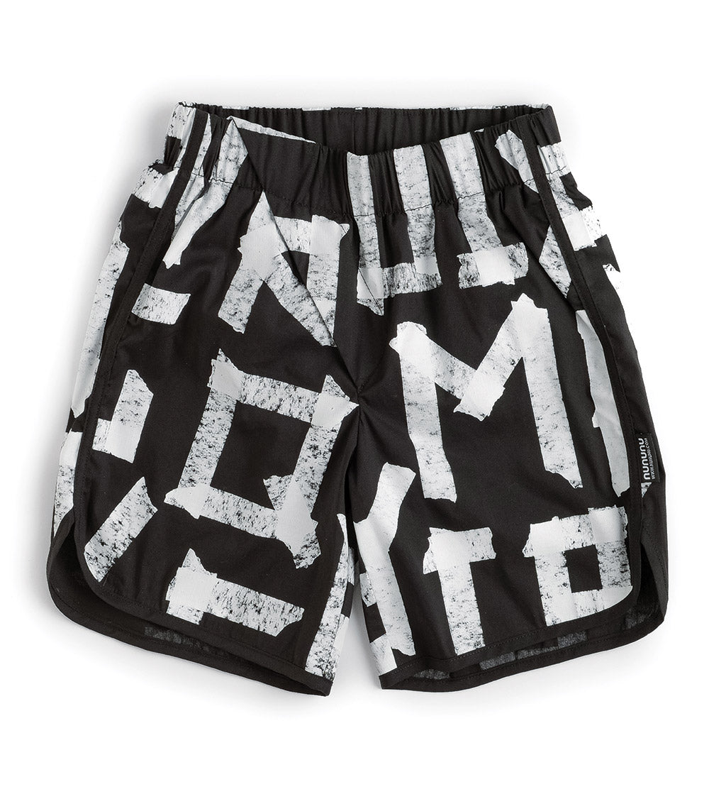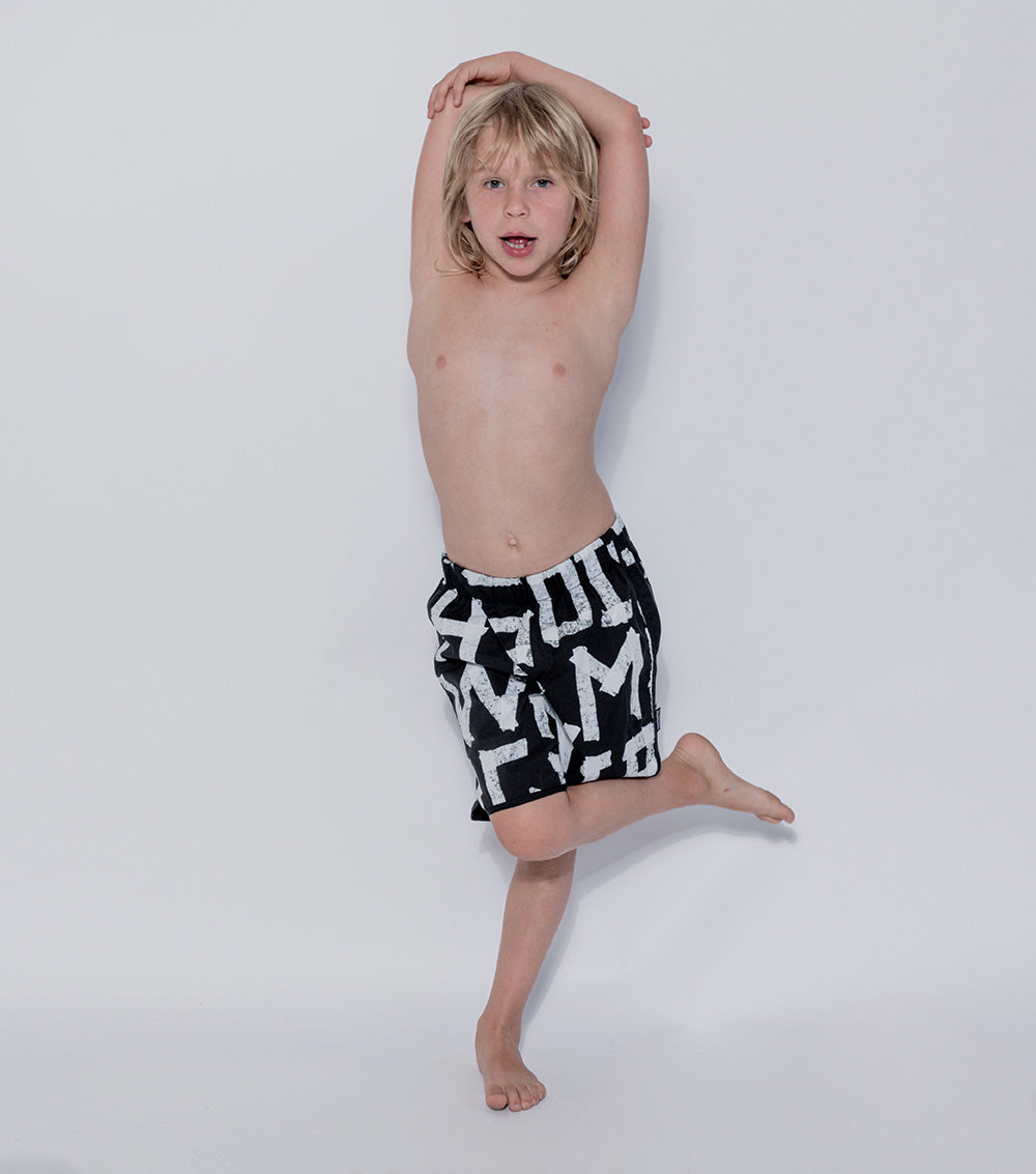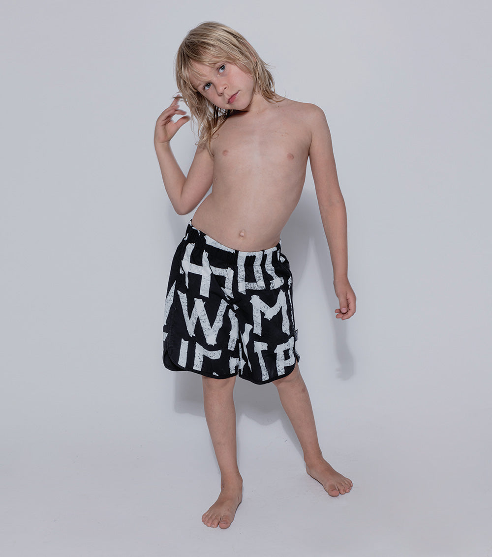 these black unisex swim shorts feature a bunch of random letters in our masking-tape effect, which is our way of saying it’s cool to have fun & express yourself with whatever is lying around the house. a classic swim short cut, they’re nice & roomy for running, swimming & rocking the boogie board. they have built-in undies & an elastic waist so the kid can easily change, because sitting around in wet shorts is just plain gross.