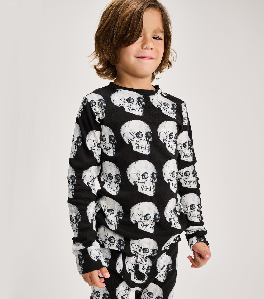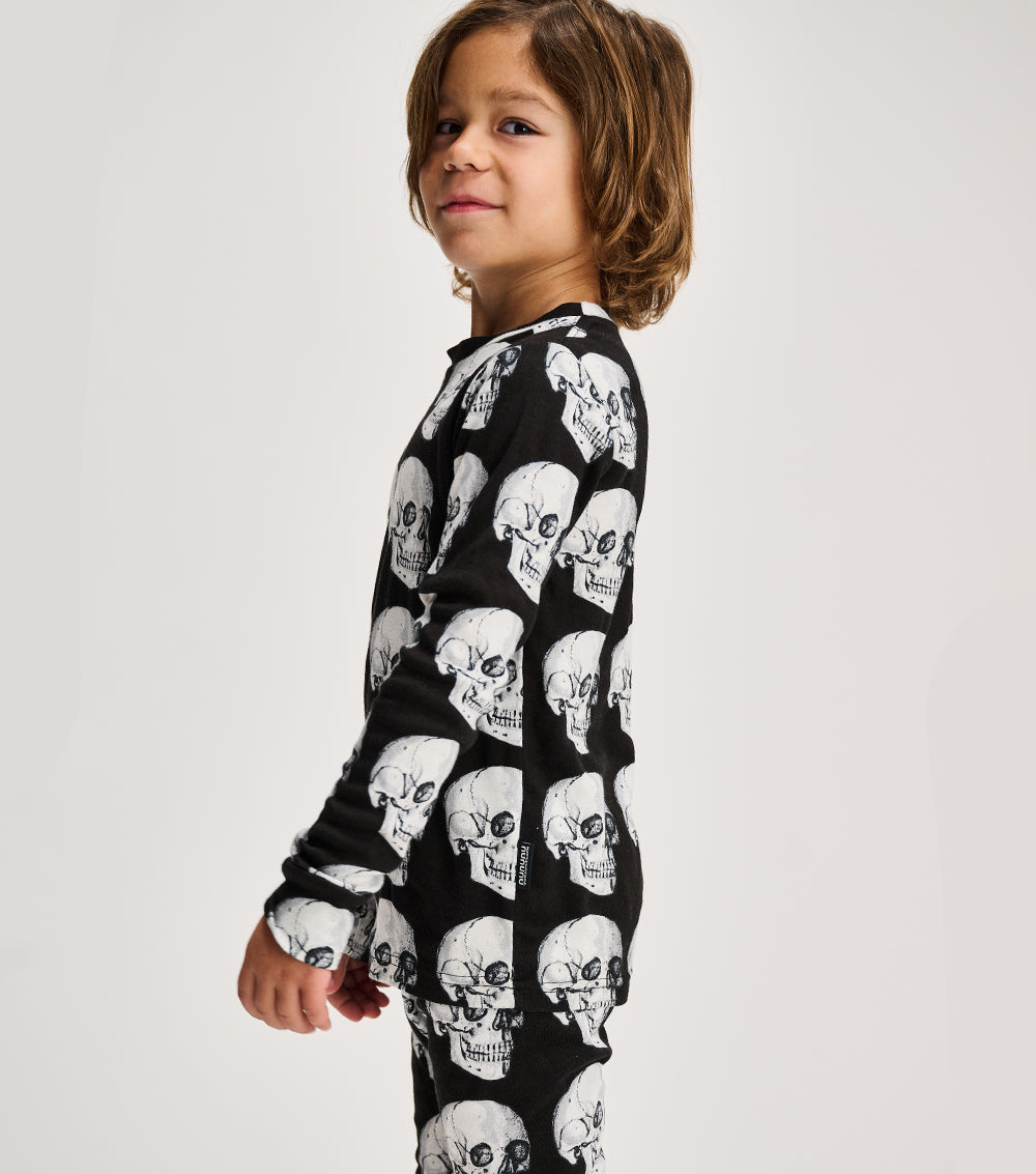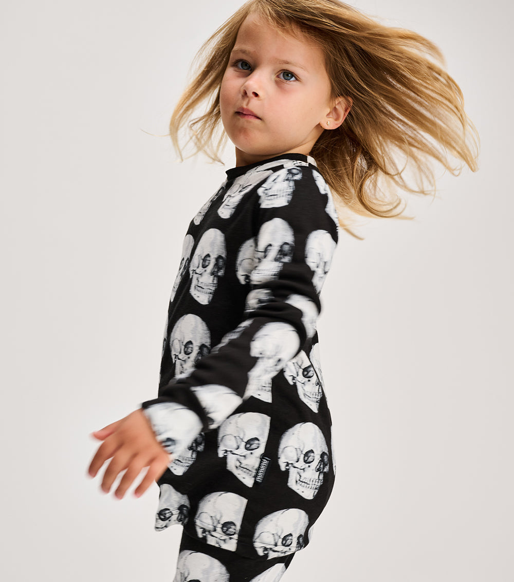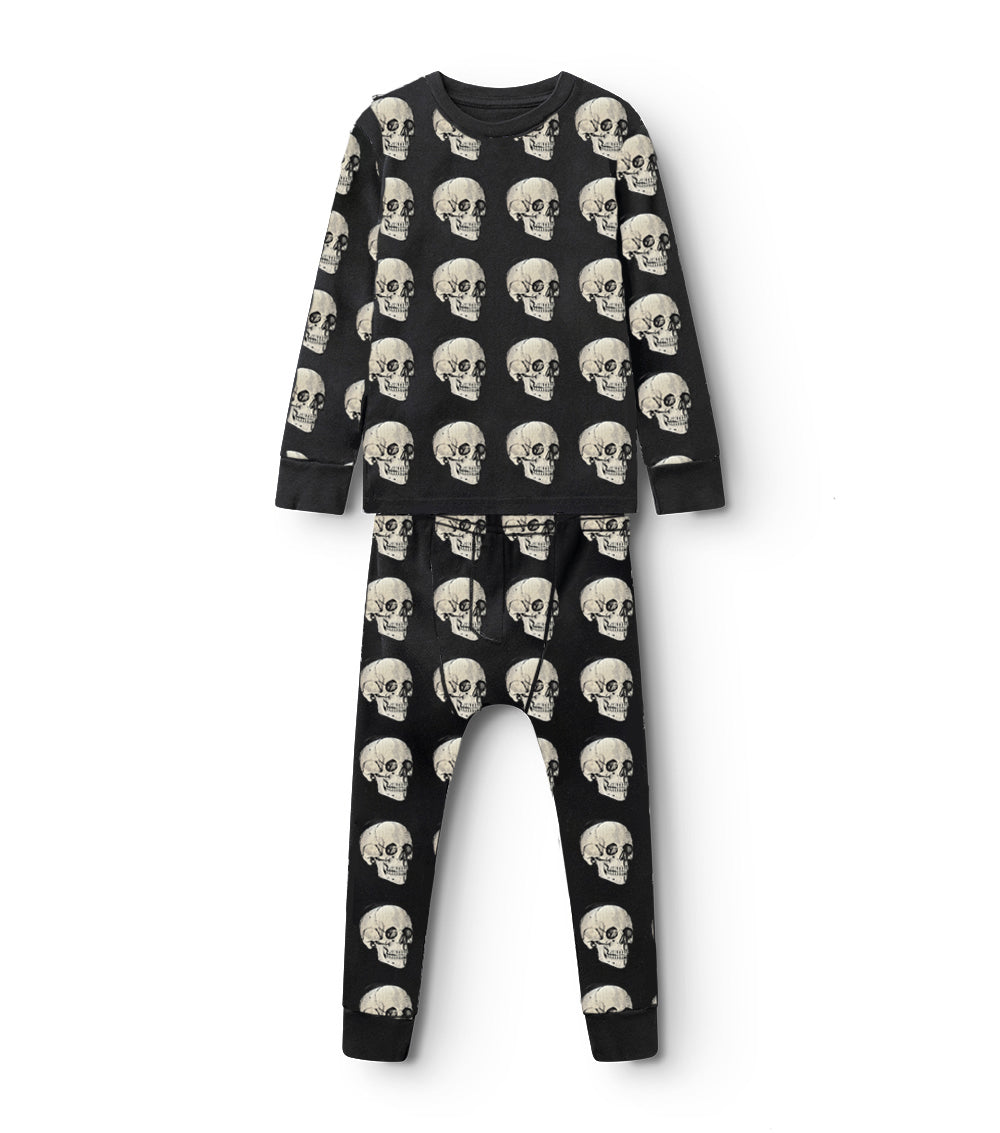 unleash some serious style with this black all-over md skull print loungewear set. designed for ultimate comfort and a rebellious edge, this matching set features a long-sleeve top and relaxed-fit pants, both covered in nununu's signature skull design. made from ultra-soft fabric, it’s perfect for lounging at home or hitting the playground with attitude.