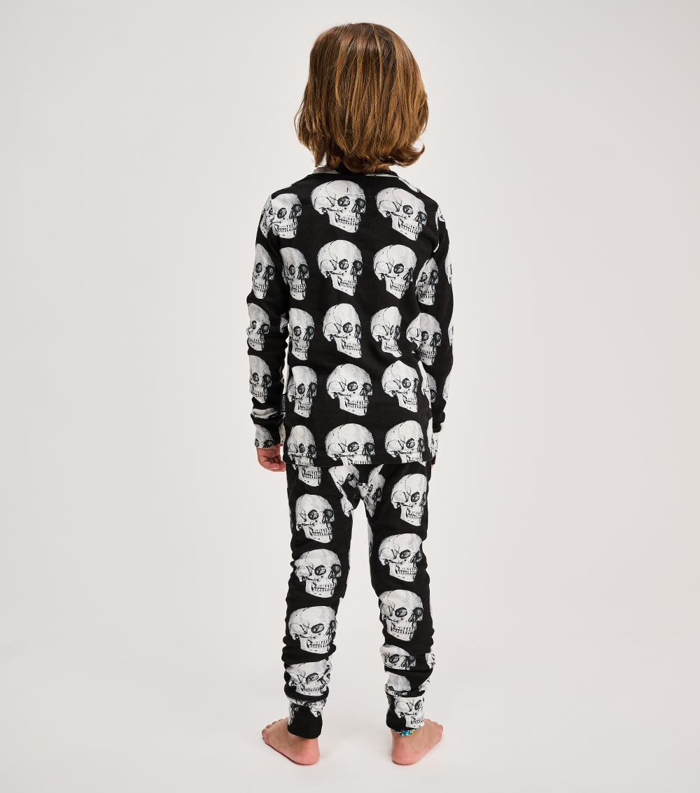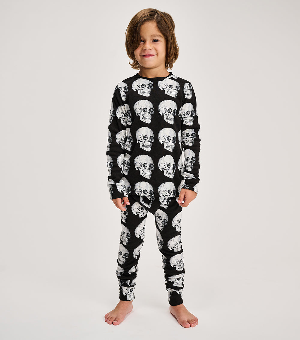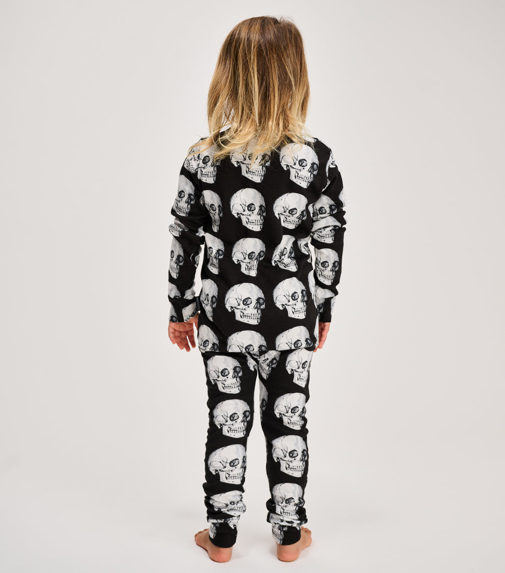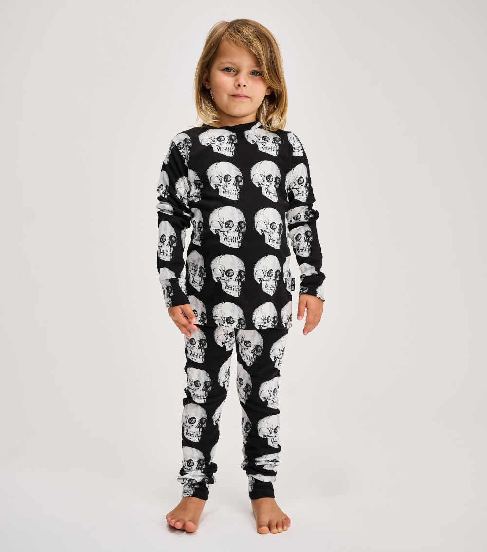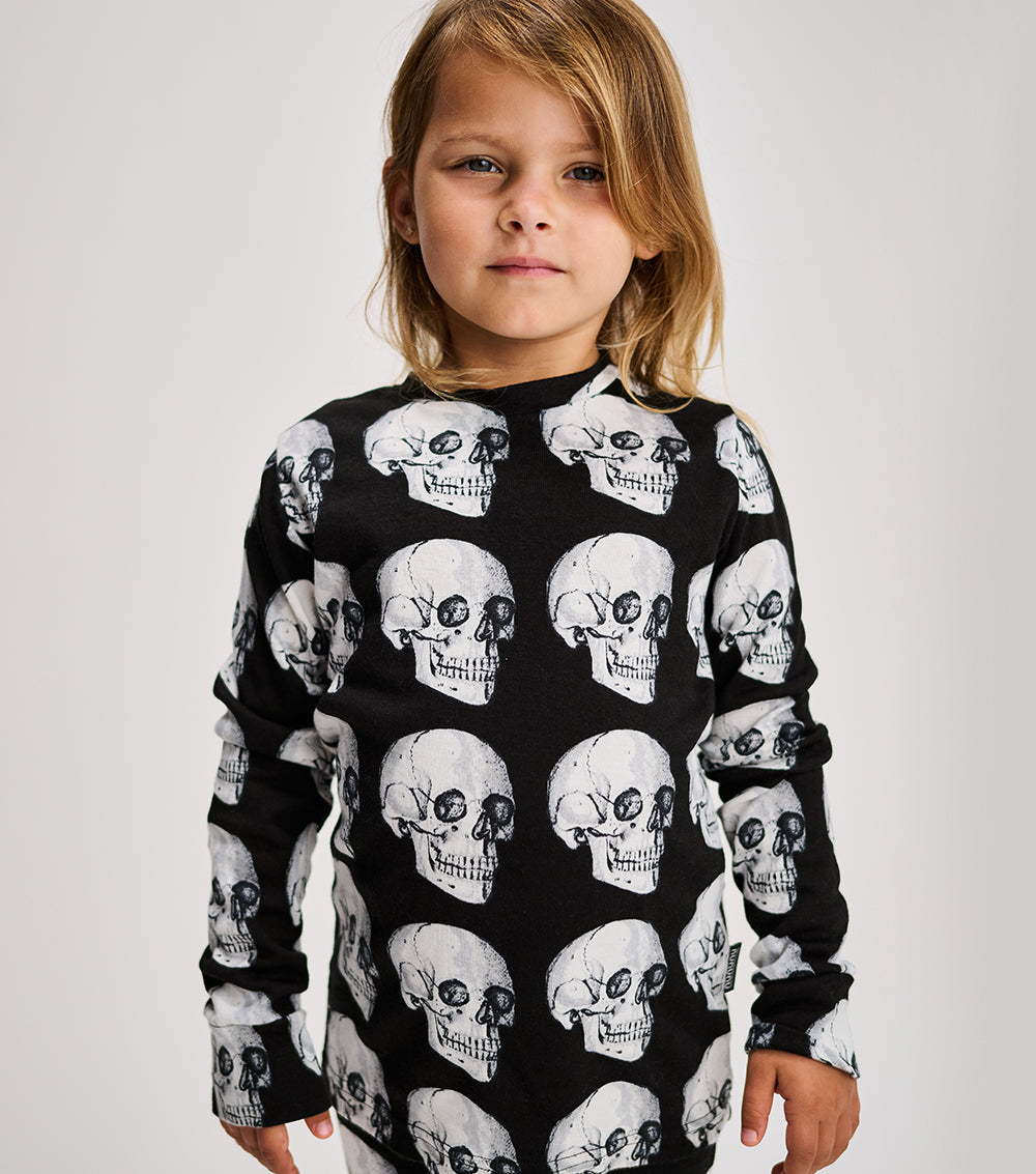 unleash some serious style with this black all-over md skull print loungewear set. designed for ultimate comfort and a rebellious edge, this matching set features a long-sleeve top and relaxed-fit pants, both covered in nununu's signature skull design. made from ultra-soft fabric, it’s perfect for lounging at home or hitting the playground with attitude.