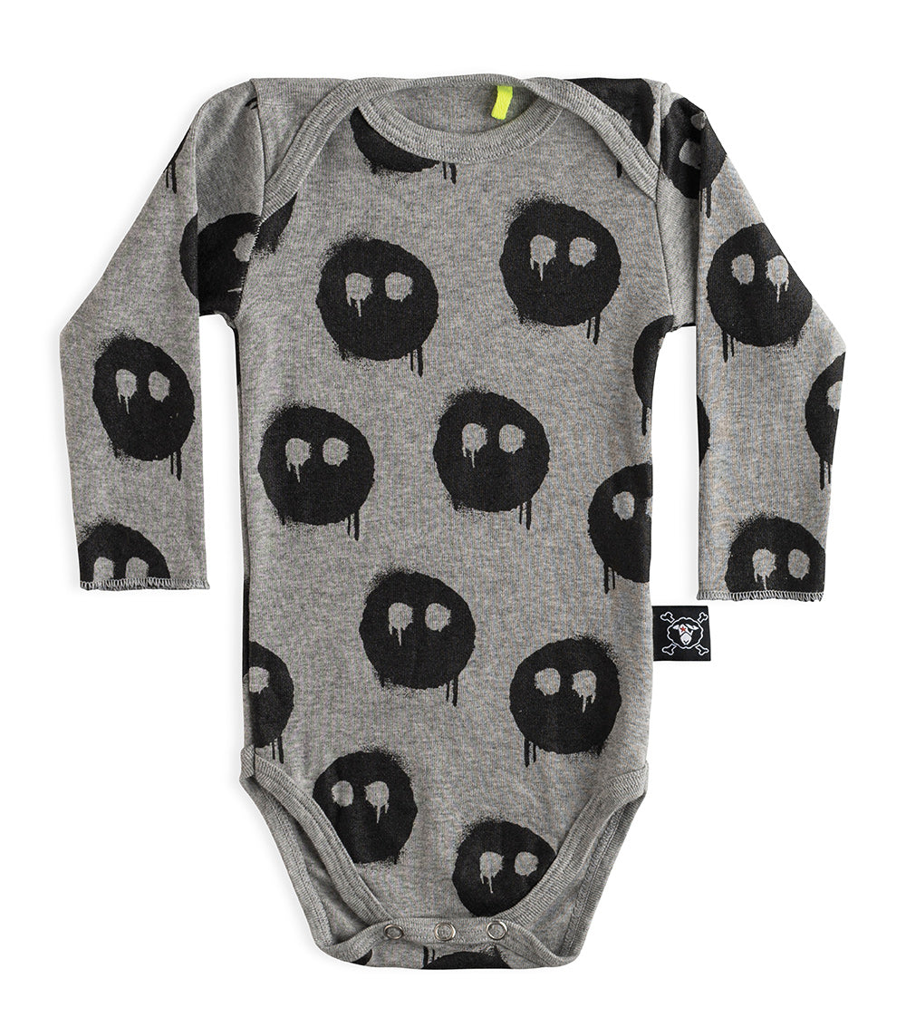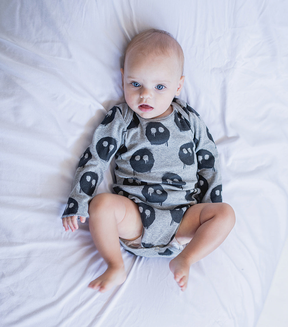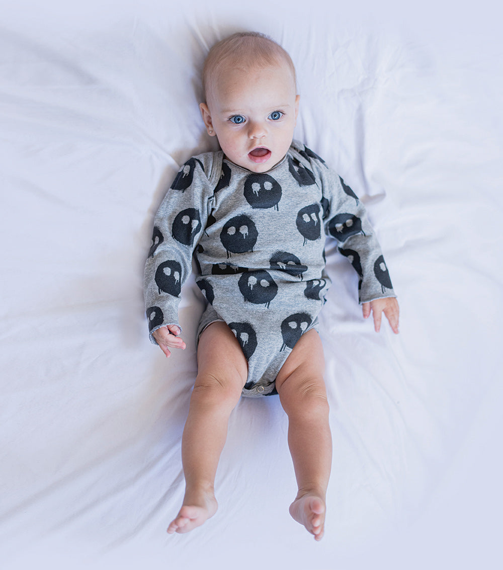 we’re having a bit of a face-melt moment, and it shows with this allover highly rebellious take on the smiley face. It comes printed all over this awesome heather grey long sleeve baby onesie. it’s a classic shape that goes on with zero friction. snaps at the crotch make diaper changes a no-fuss situation, and shoulder flaps let you pull it down from the top—whatever’s easiest in the moment.