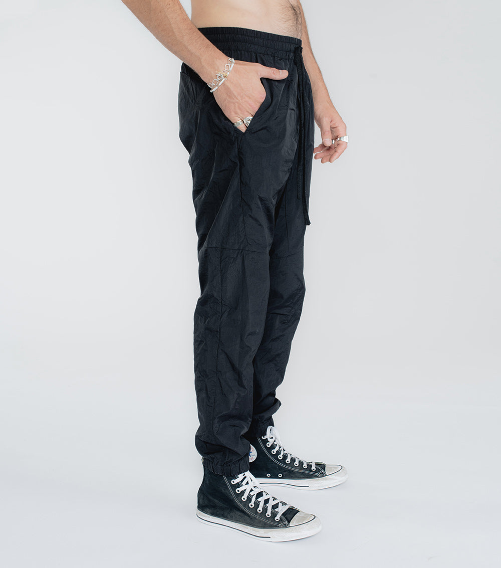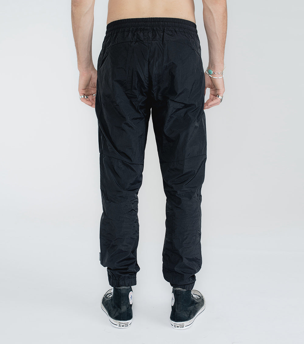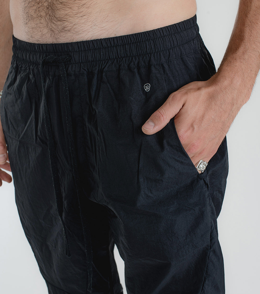remember the ‘90s? that aggressive track-suit moment? how fun that was? we’re taking you right back there with these dope-ass black nylon pants. these guys are souped up with maximum seaming action on top, yet they’re still completely cool & laid back with an elastic drawstring waist and elastic cuffs. yes, they make that ASMR-inducing sound when you walk. our embroidered tiny skull appears right back the left pocket. throw on a tee & sneakers and you’re good to go.