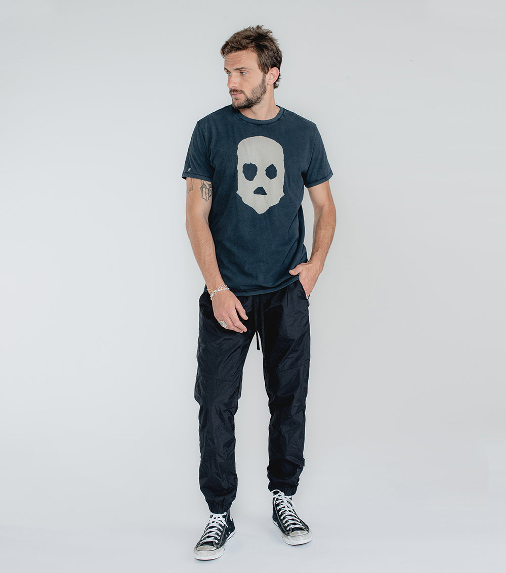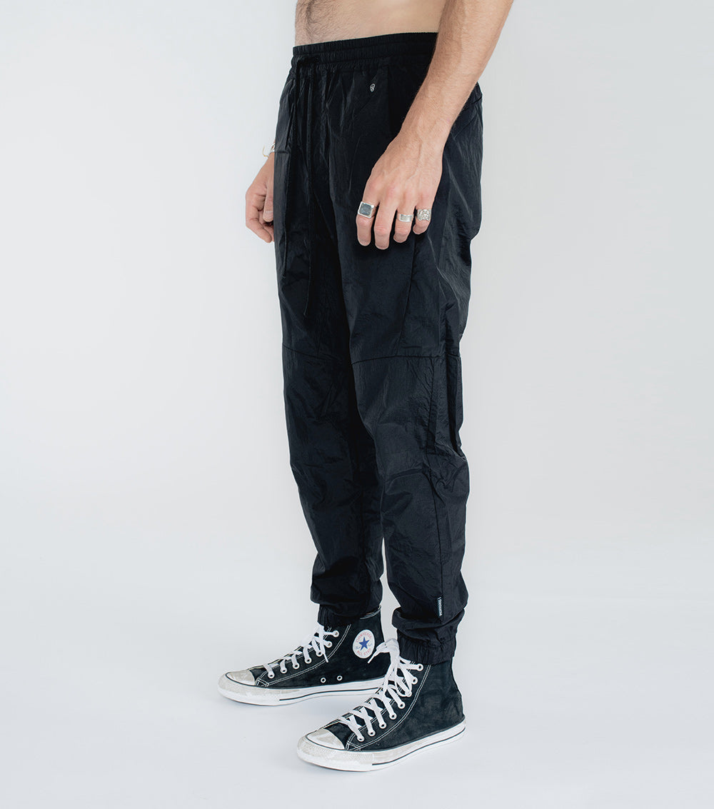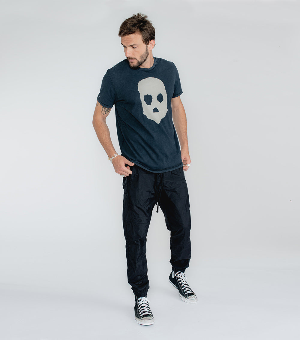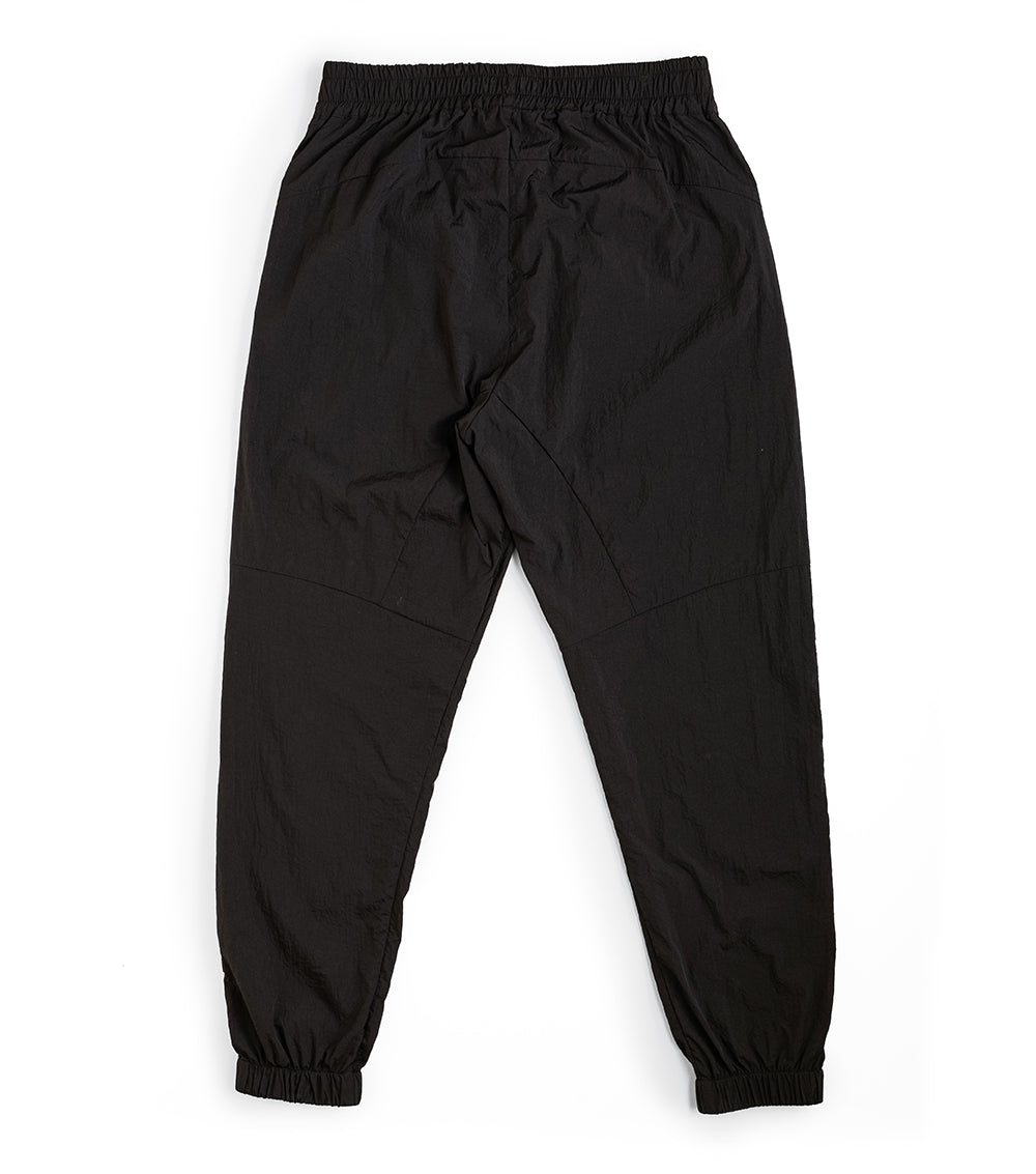 remember the ‘90s? that aggressive track-suit moment? how fun that was? we’re taking you right back there with these dope-ass black nylon pants. these guys are souped up with maximum seaming action on top, yet they’re still completely cool & laid back with an elastic drawstring waist and elastic cuffs. yes, they make that ASMR-inducing sound when you walk. our embroidered tiny skull appears right back the left pocket. throw on a tee & sneakers and you’re good to go.
