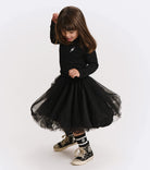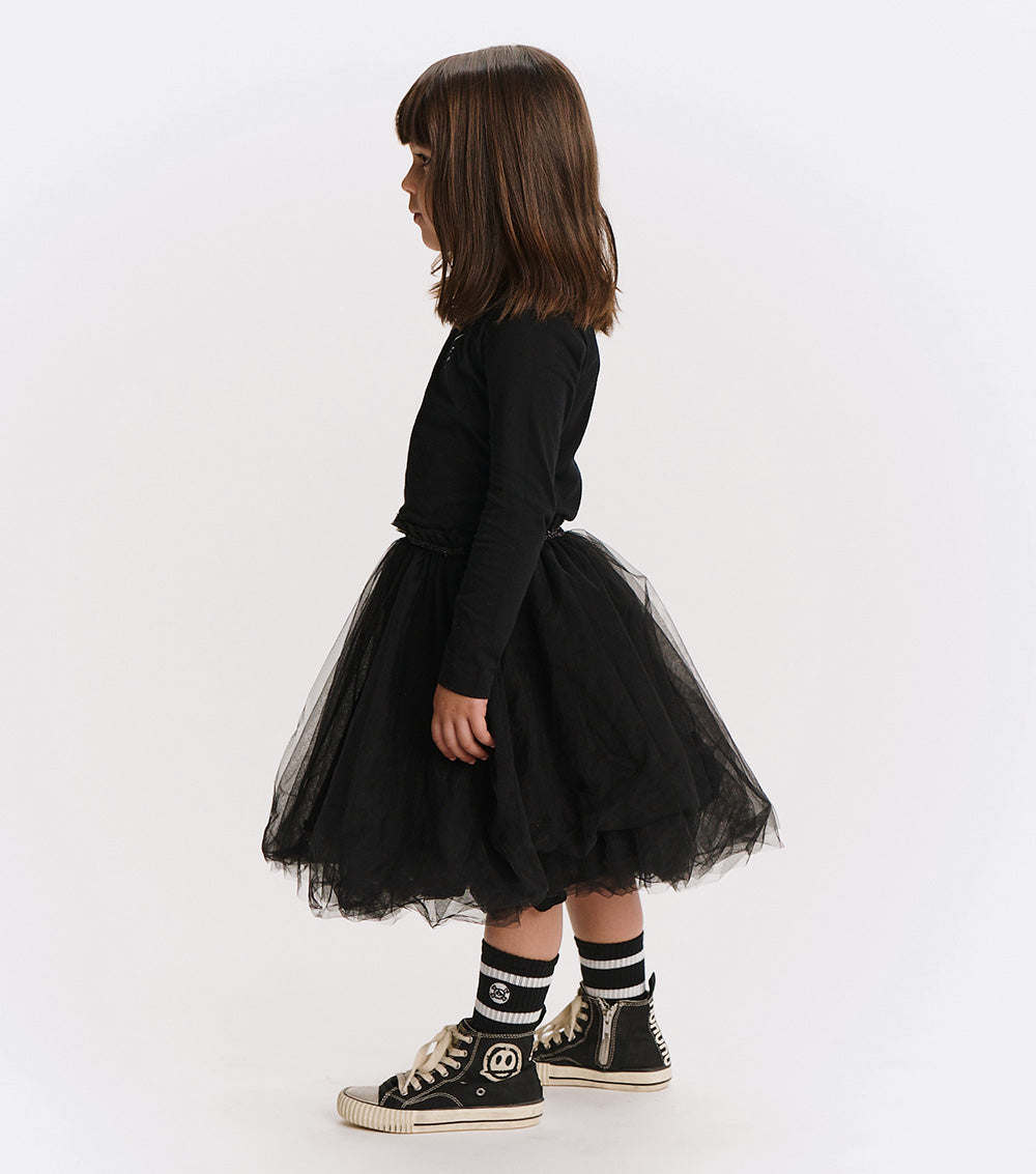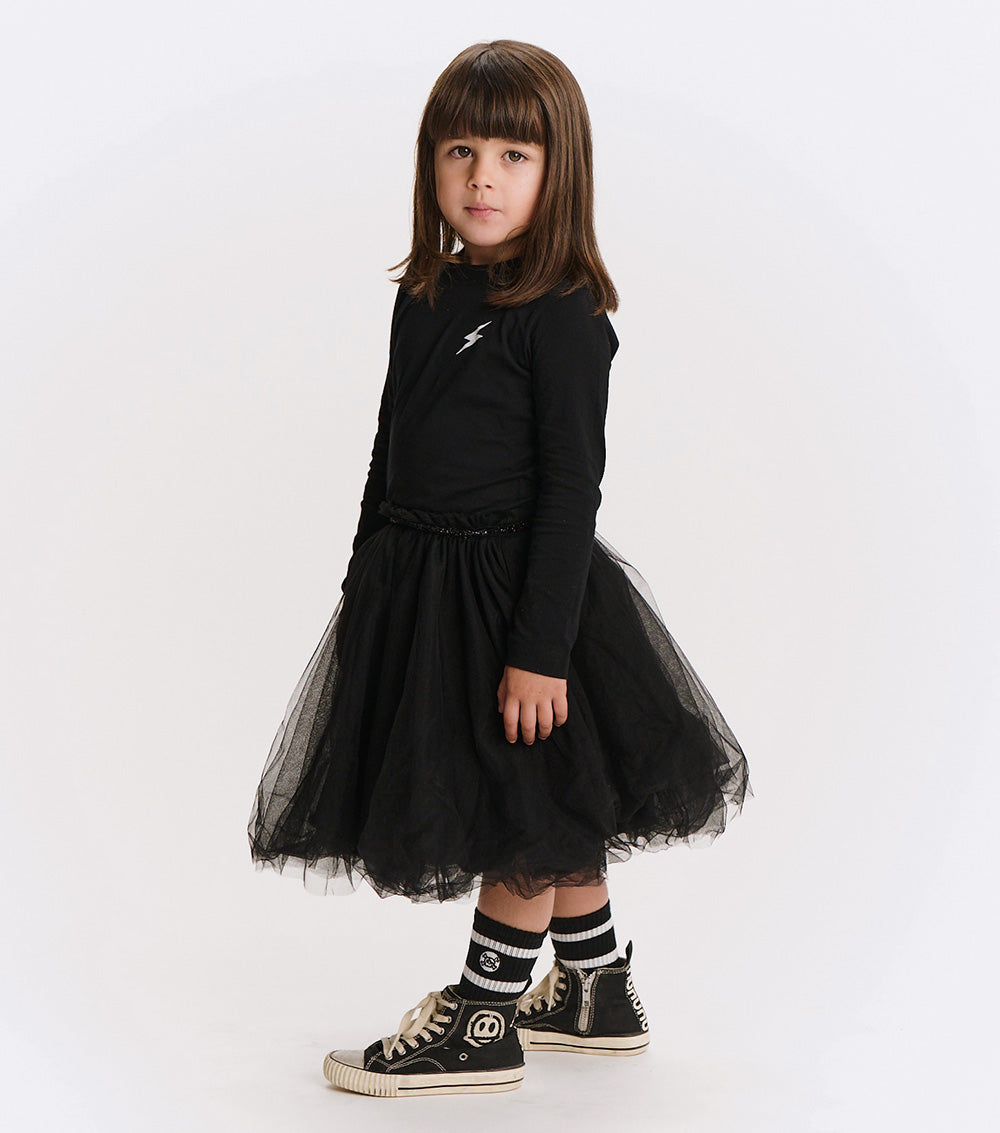 this dress is sure to strike up a conversation. it’s a black single cotton top & a flouncy skirt bound by a sequenced black waistband. of course, it’s got the perfect number of tulle layers for maximum twirl potential along with a single cotton layer underneath to keep it comfy.
