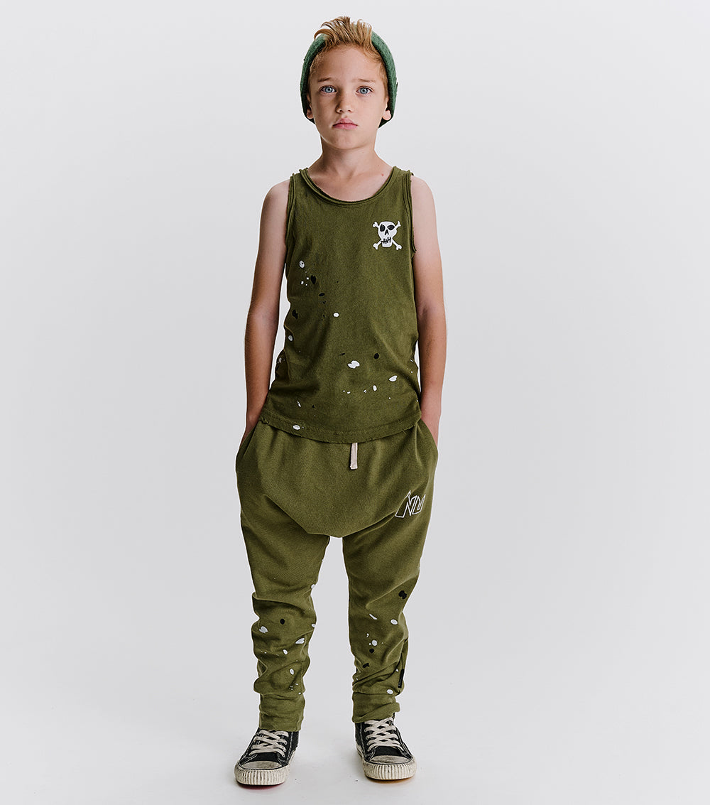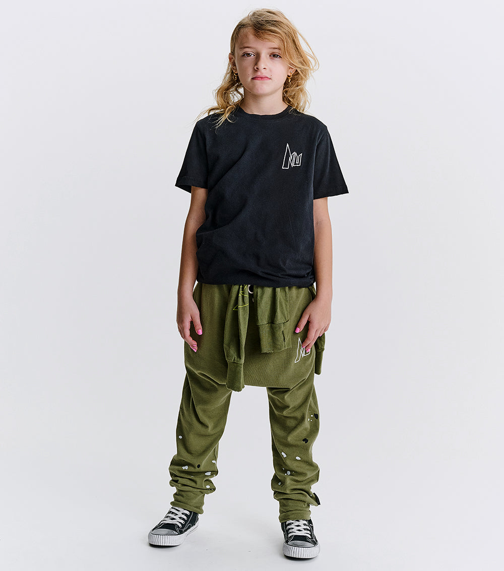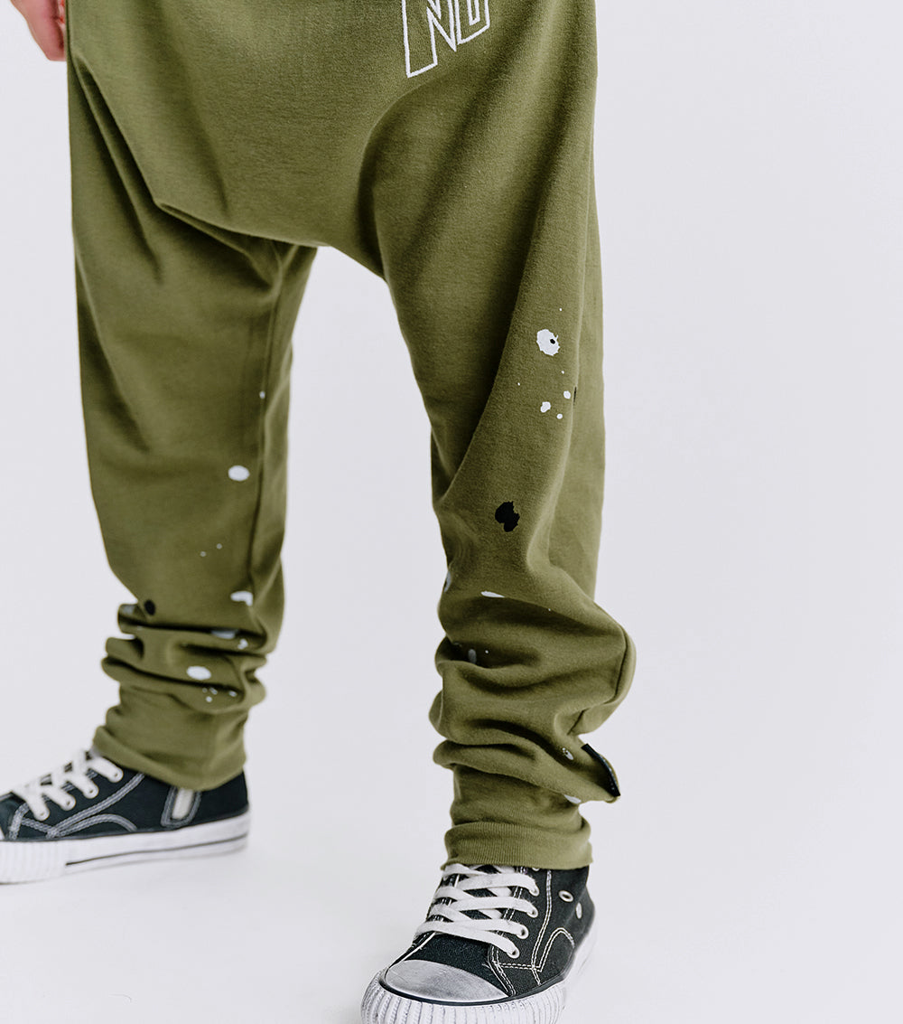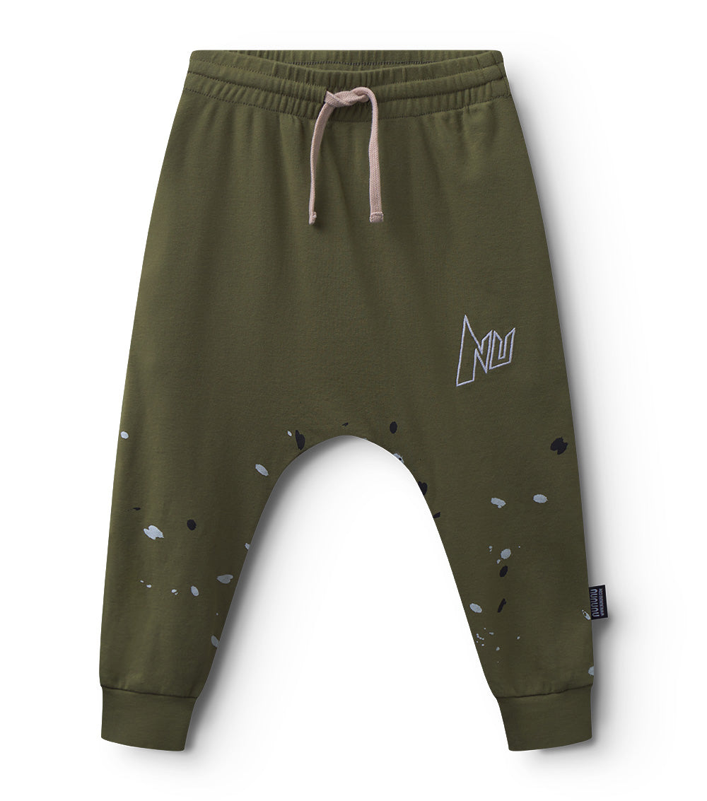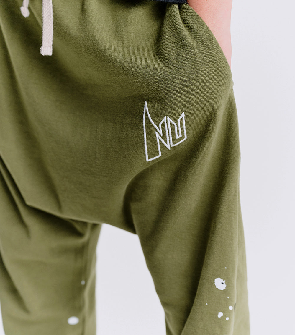 your personal rebel’s new favorite pants have arrived. they’re a gender-neutral baggy cut made of olive fine rib that’s light enough for all kinds of summer fun. they’ve got NU stitched on in an edgy super hero (or villain) kind of font that perfectly describes the variety in their vibe. creative splashes of black & white print match that alter-ego energy and the stretchy waistband, convenient drawstring & roomy dropped crotch ensure that their world saving & trouble making activities are easier than ever. of course, the two hidden slanted side pockets are ideal for hiding the evidence.