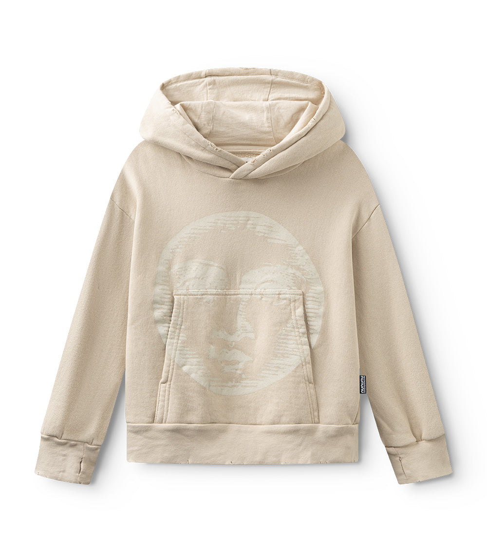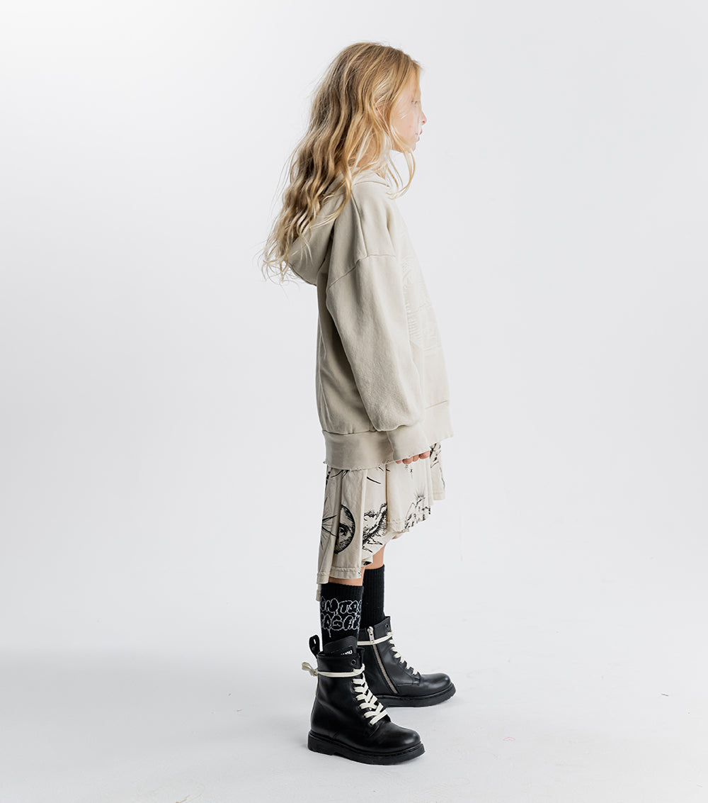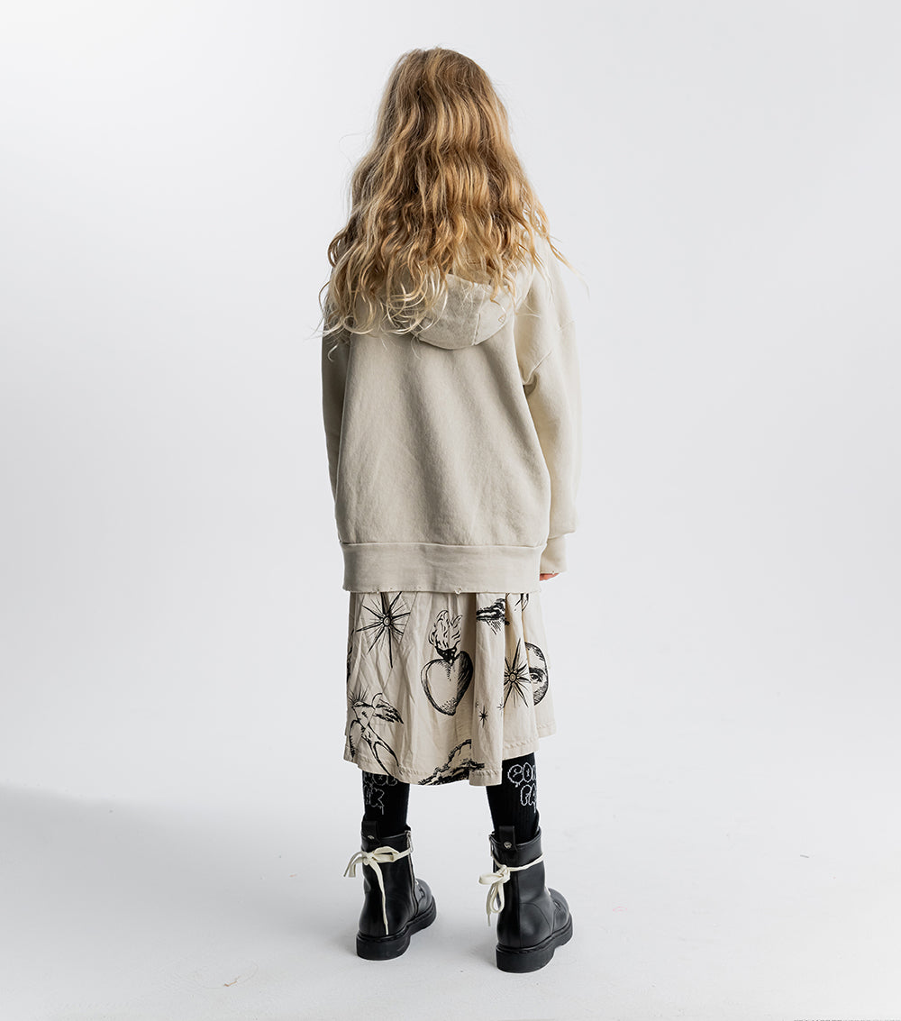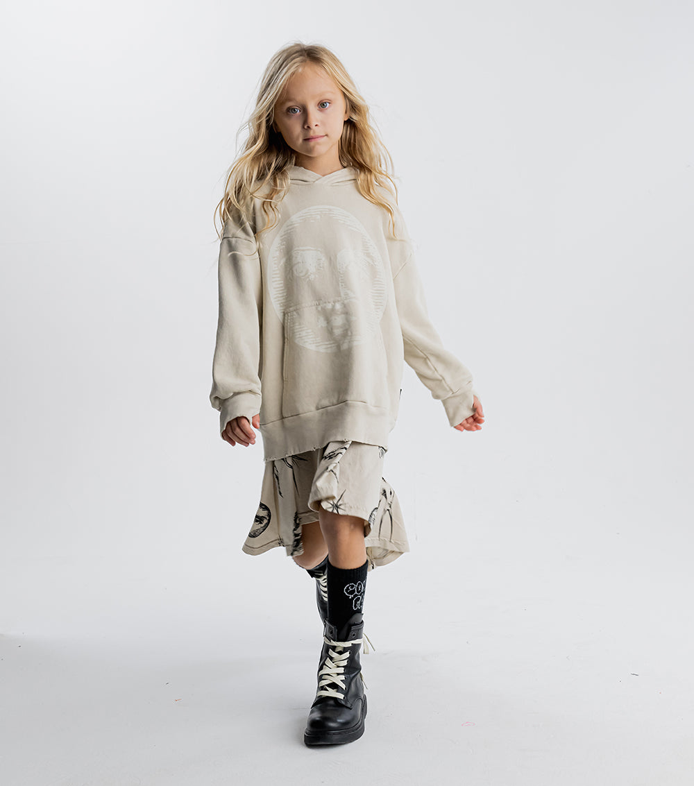 our all time fave gender neutral hoodie is as deconstructed as always, but this time with an inked out twist. the gaze from a mysterious moon gives off those dark, daring vibes, which is kinda our thing. this smokey natural piece is made from cozy-as-ever french terry with a sick crossover hem. to add to the mood it’s got a larger-than-life hood delivering that on-point slouchiness. oh yeah and a super big kangaroo pocket to hold all their scribbled-on sketchbooks and temporary tats.