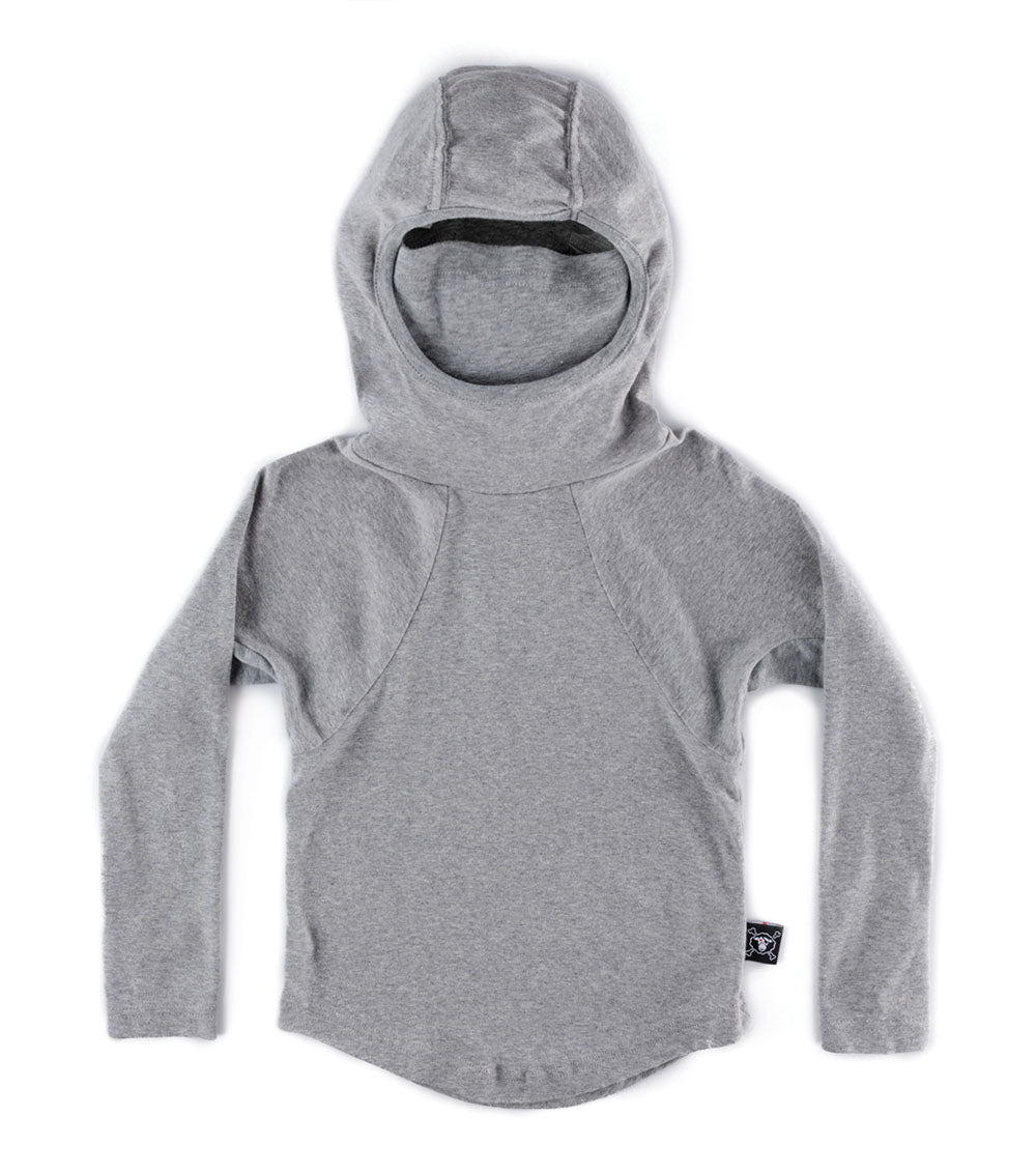 peek-a-boo but make it fashion. boys & girls alike will appreciate the attention to detail in our o.g. heather grey ninja shirt, from the curvy hem to a modular face cover for an edgy, modern look. wear it on its own or layer for a cozy yet offbeat look.