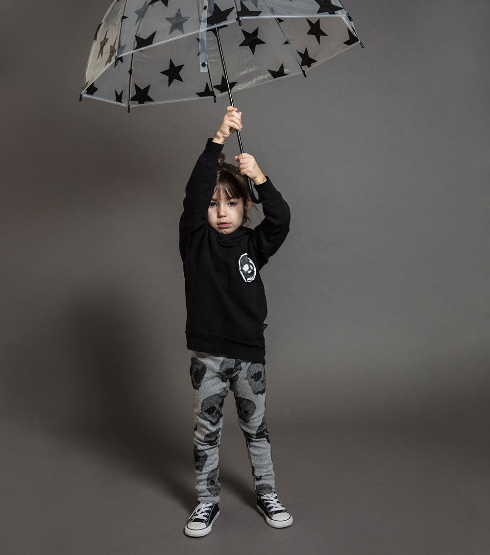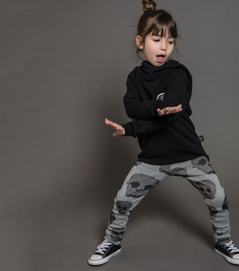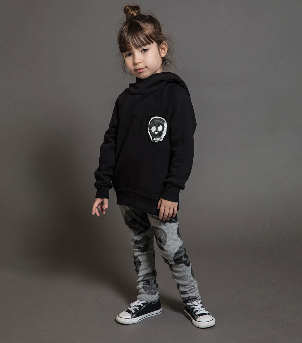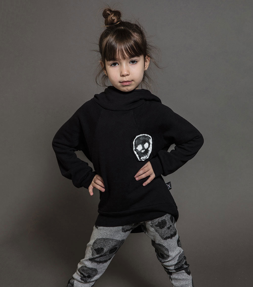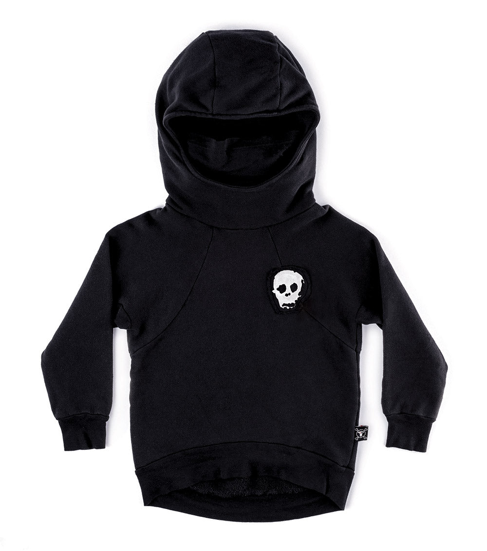 the kids are so down with our ninja shirt. here it comes in a black unisex sweatshirt version for fall. that same peekaboo hood lets them have fun and be cozy at the same time. on the chest, we’ve got a cool patch featuring our dizzy skull design, a collaboration with Shay Id Alony that gives our tribal skull a shake-up. boys & girls alike will enjoy terrorizing the neighborhood in a quality sweatshirt with worn-in comfort. the hi-lo hem makes it a perfect layering piece for boys or girls, as shirttails peek out from underneath.