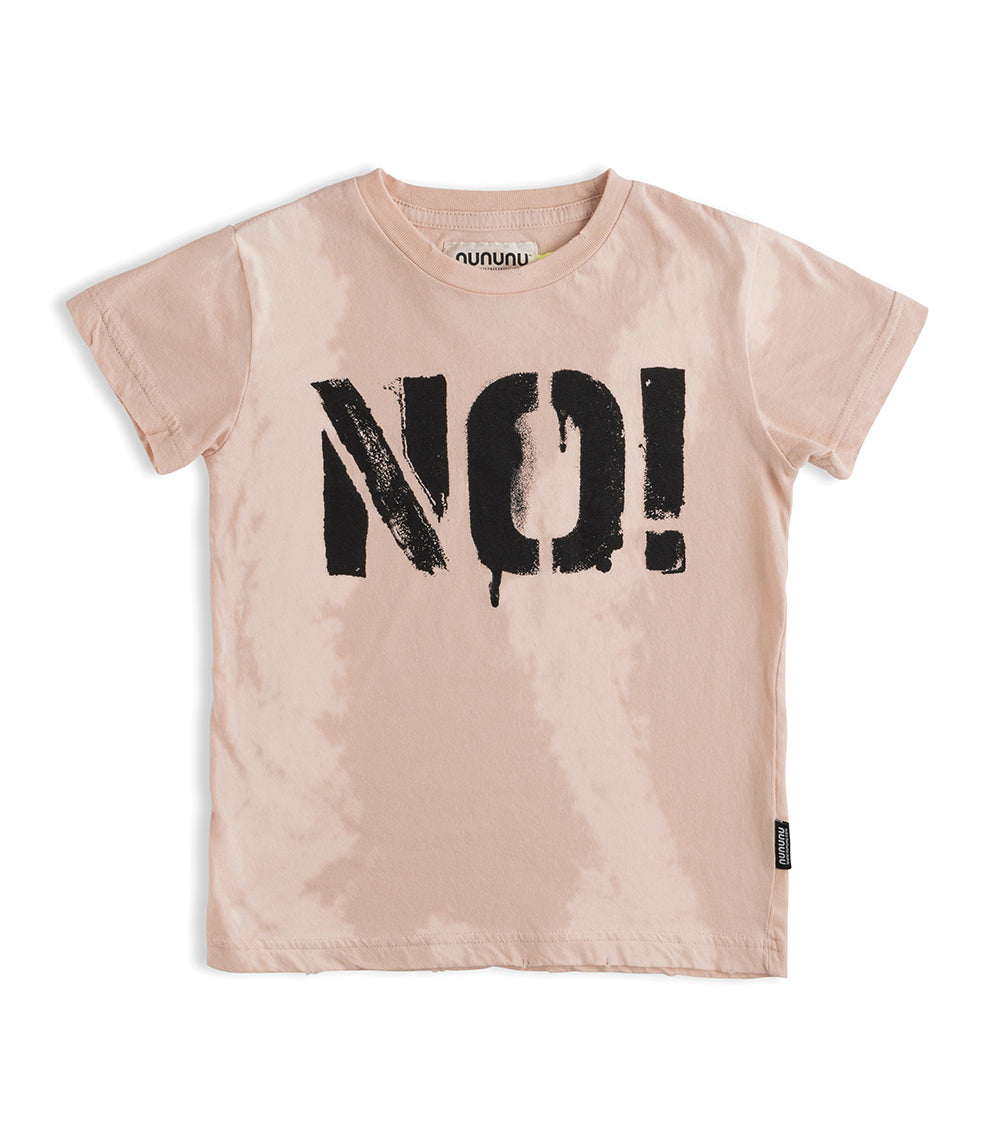 kind of like how adults wear their favorite band on their shirt, kids can have their favorite word. Definitely a statement-making piece for boys & girls, this nude, bleach-effect t-shirt lets them start being “anti” early on with the word “no!” in a drippy stencil print. the shirt itself is classic nununu, totally soft with a relaxed cut. excellent to pair with jeans, surf shorts or layer under a jacket.