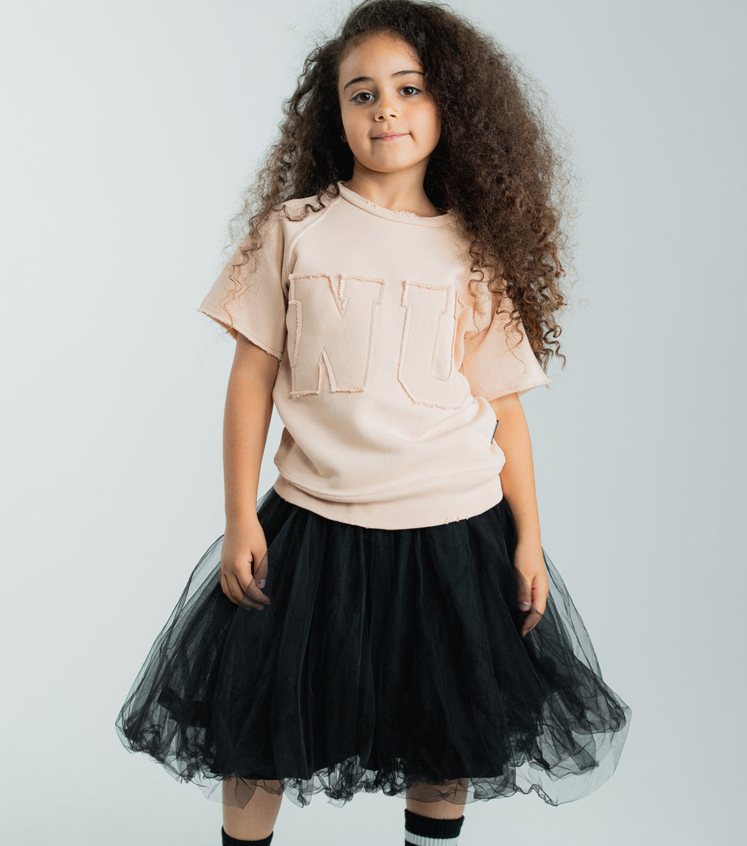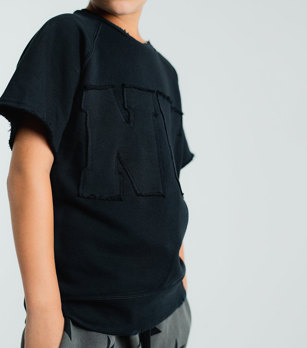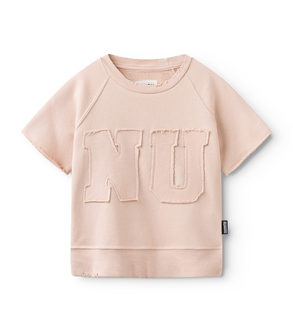 everyone knows that feeling when you want to wear your favorite sweatshirt, but it’s the wrong season. well, problem solved, because we took the stylings of a classic sweatshirt & made a short sleeve t-shirt out of it. This nude, light french terry throw-on top features our “nu” logo in tonal patchwork terry with raw edges. super fun & easy to wear with shorts in the summer, or layered over long sleeves in the fall.