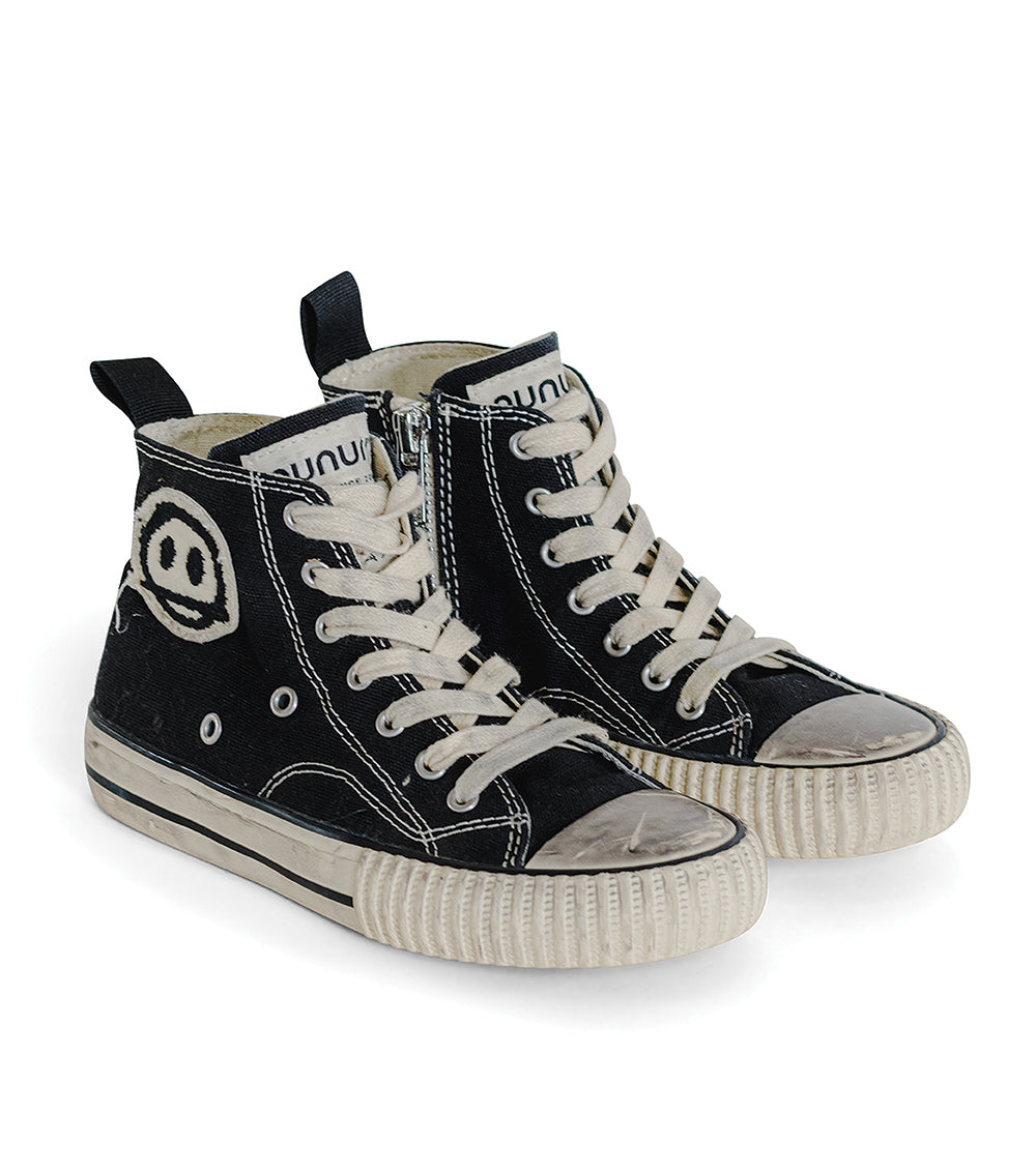 we love a little mix-n-match action, so we made two different colored soles on these unisex black high top sneakers—one yellow, one red. what’s even cooler is we included laces to match the soles & plain white as well, so you can lace ‘em up according to your mood. what’s even cooler than that is there’s a zipper on the side, so you don’t have to tie & untie them all the time. they’re the perfect lived-in high tops, with our sprayed smile-smirk on a side patch & pre-dirtied outsoles & tips.