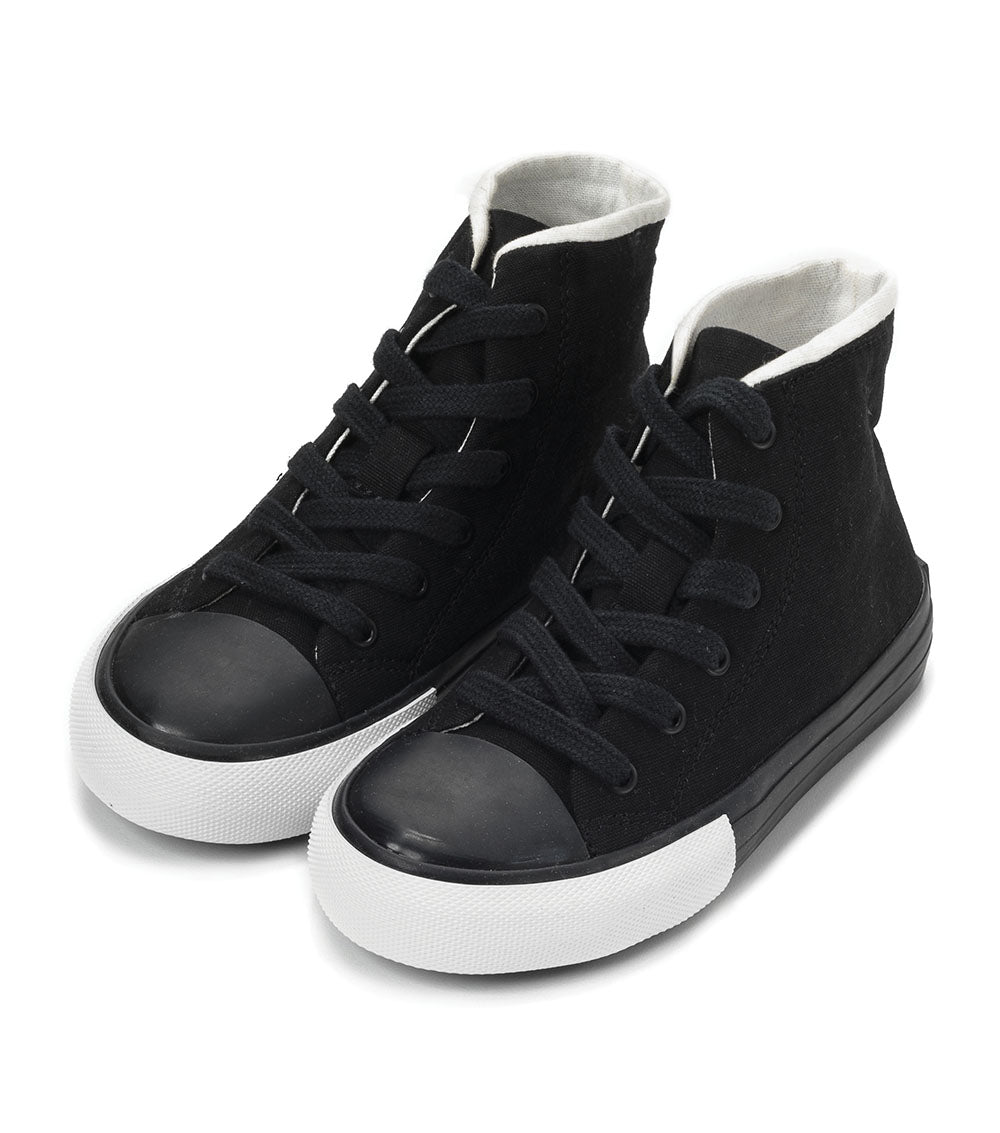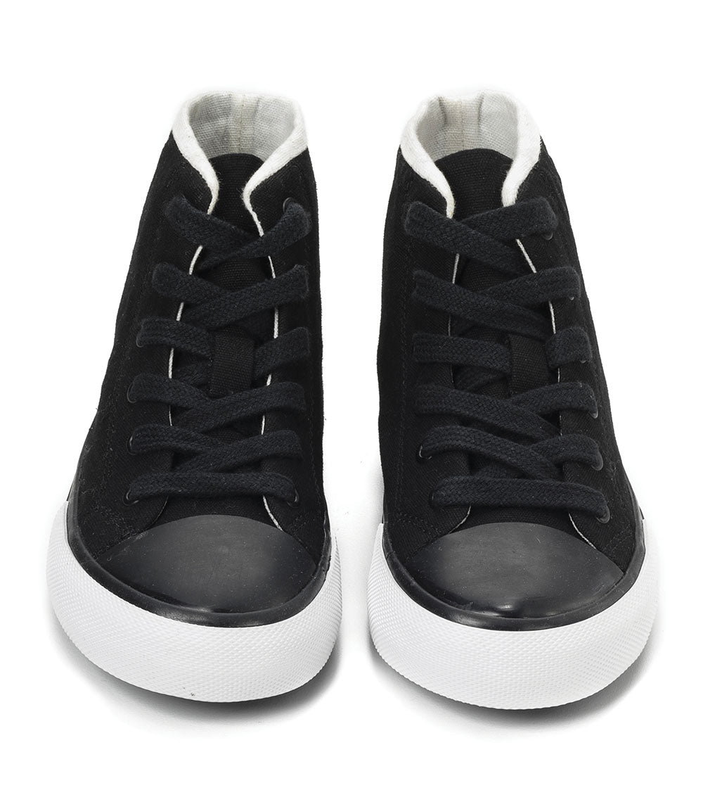 haunting around town is throwing down a vibe when you have the right footwear. these minimalist-cool black high tops are good for boys & girls who just want to lay low, and perhaps have a few untoward adventures. nice sturdy rubber soles in contrast black & white meet black canvas uppers with a classic rubber tip. think good old high tops but more...now.