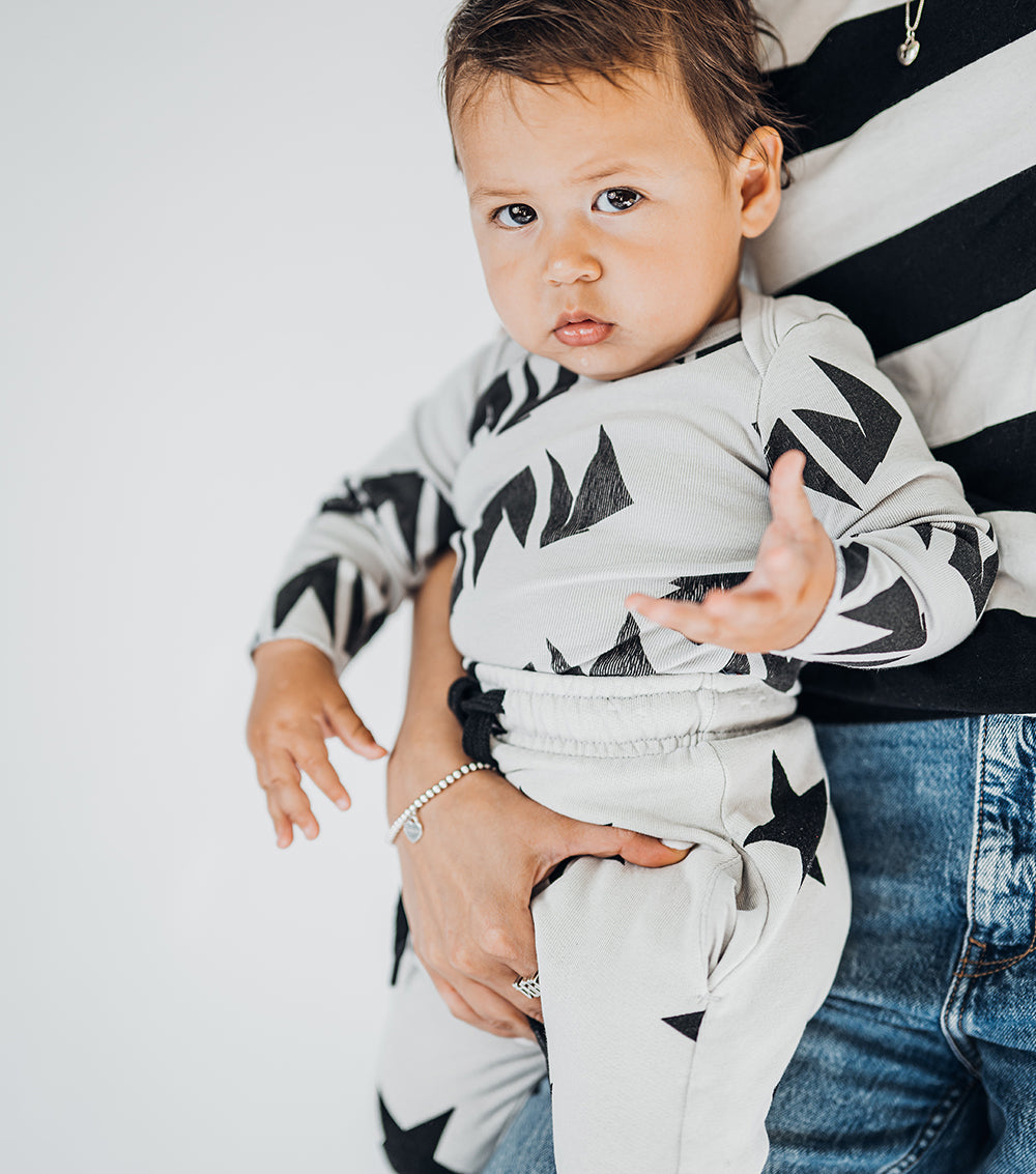 our sharp new “nununu” design in a diagonal all over repeat, an abstract representation of our logo. It happily dances all over this ice grey, cotton-cozy long sleeve baby onesie. it’s a classic shape that goes on with zero friction. snaps at the crotch make diaper changes a no-fuss situation, and shoulder flaps let you pull it down from the top—whatever’s easiest in the moment.