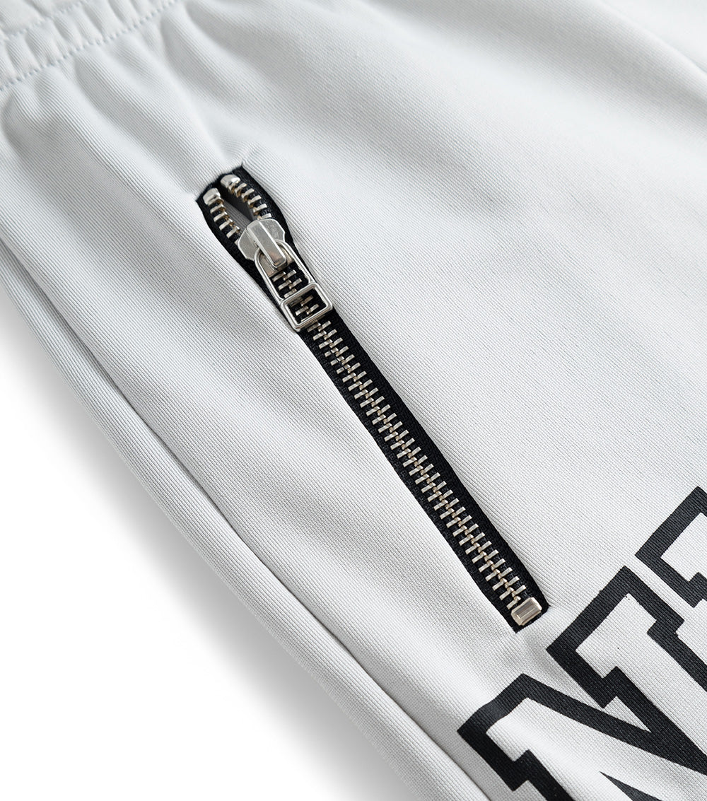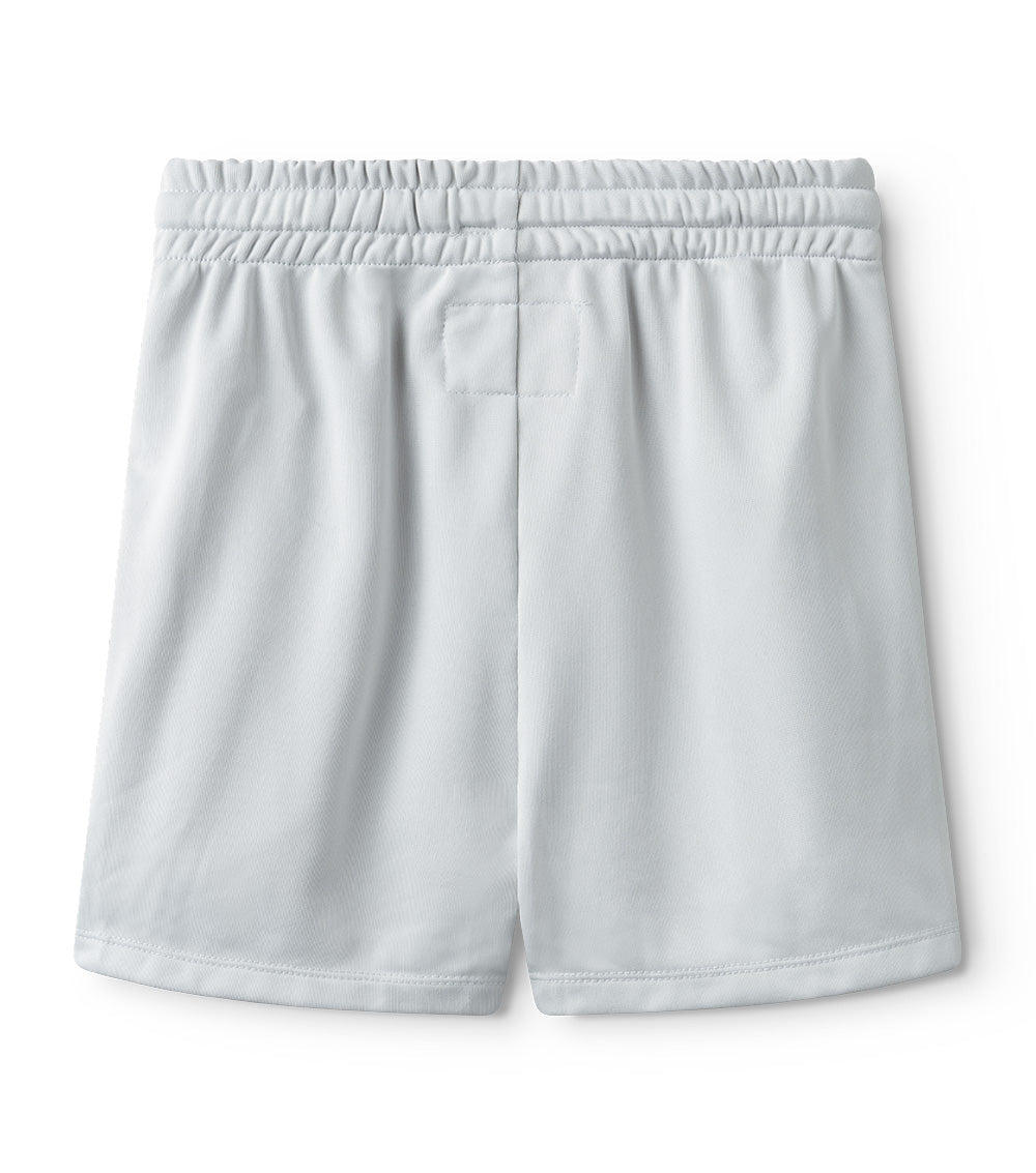 these grey unisex shorts are a good solid, sport-forward look for summer ‘23. medium long, slinky & a little shiny, they’ve got the perfect drape for all manner of activities, or just sitting around all summer, if that’s your vibe. our logo comes in big, scholastic-style block lettering on the front for a bold statement. side zip pockets & an elastic drawstring waist are the dope details here.