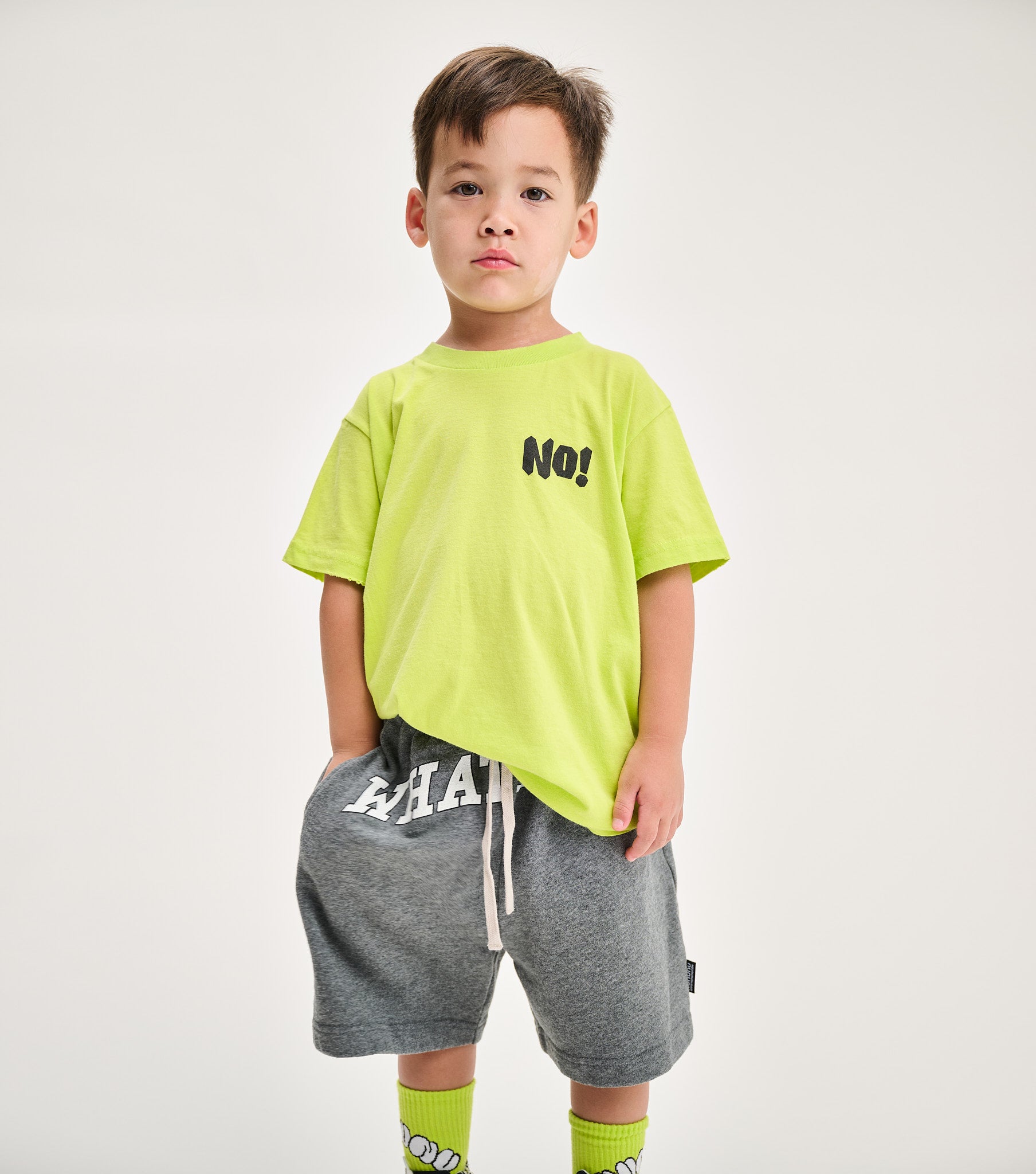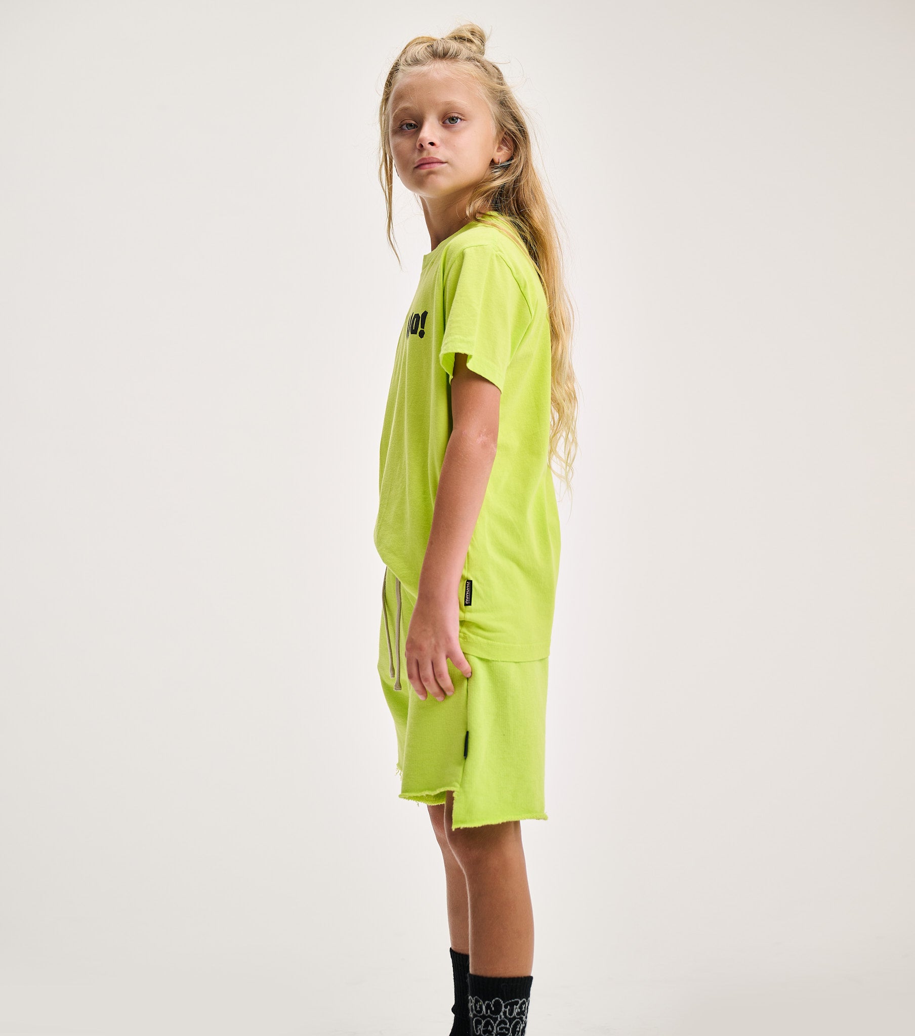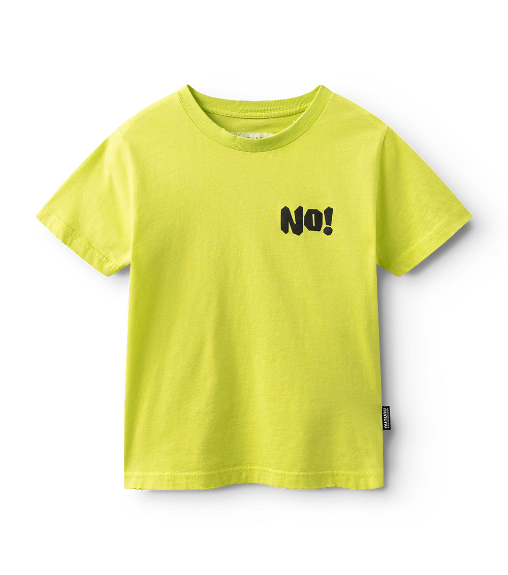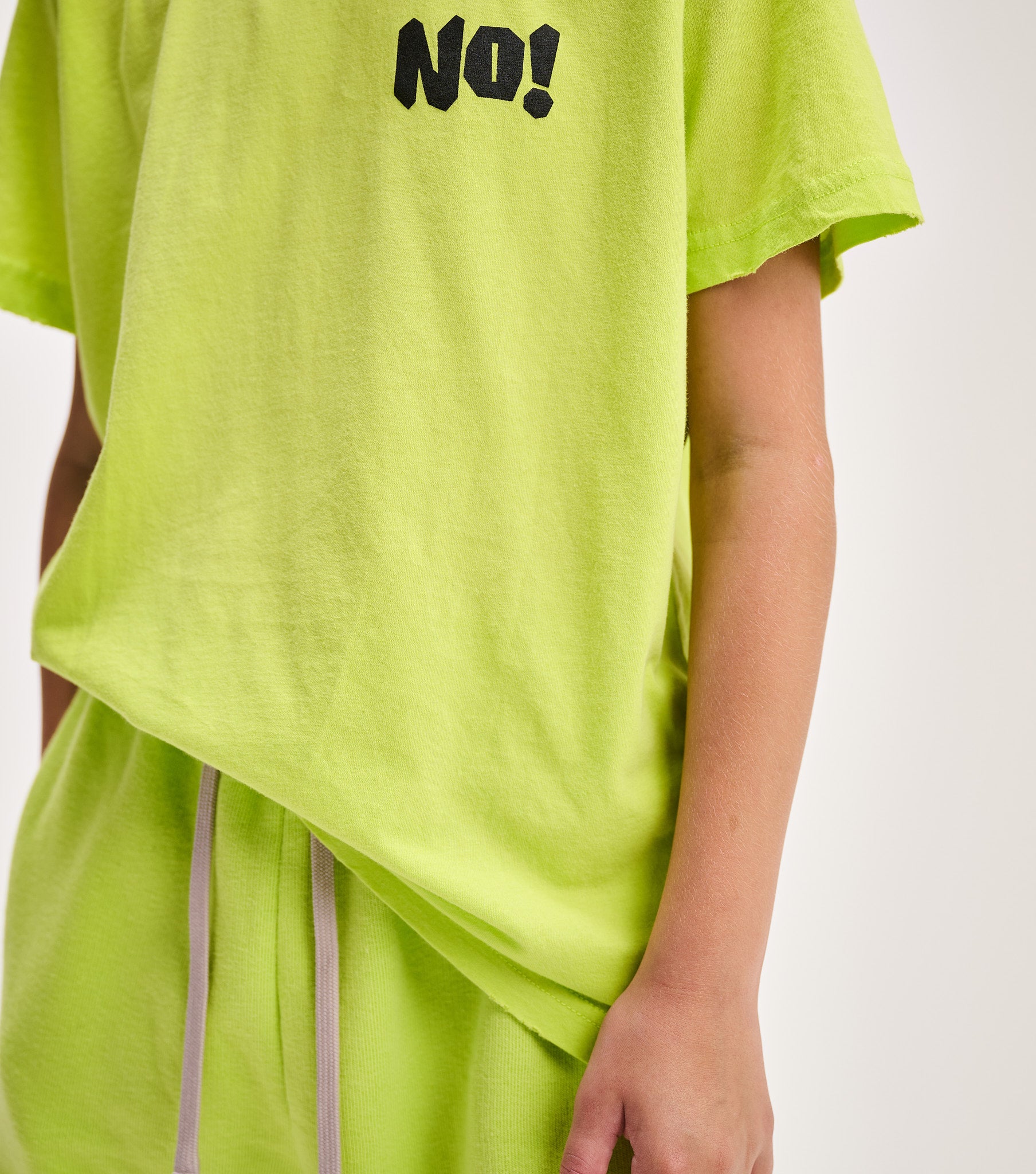 this fit is way too cool not to own. it’s a gender neutral cut made of soft hot lime single cotton with custom deconstruction to give it that lived-in look. your kid’s favorite word is exclaimed in a video game style font with lots of sharp corners & edges. because they’re rock solid at everything they do and fearless in everything they say. especially when it’s a no after being asked to let that screen go! .