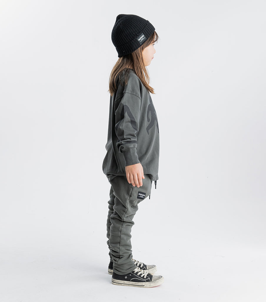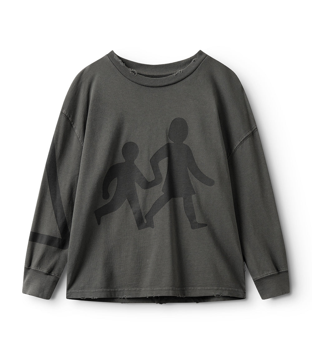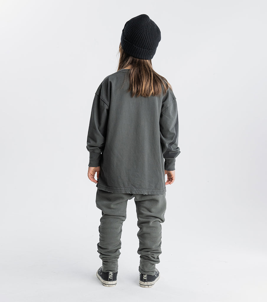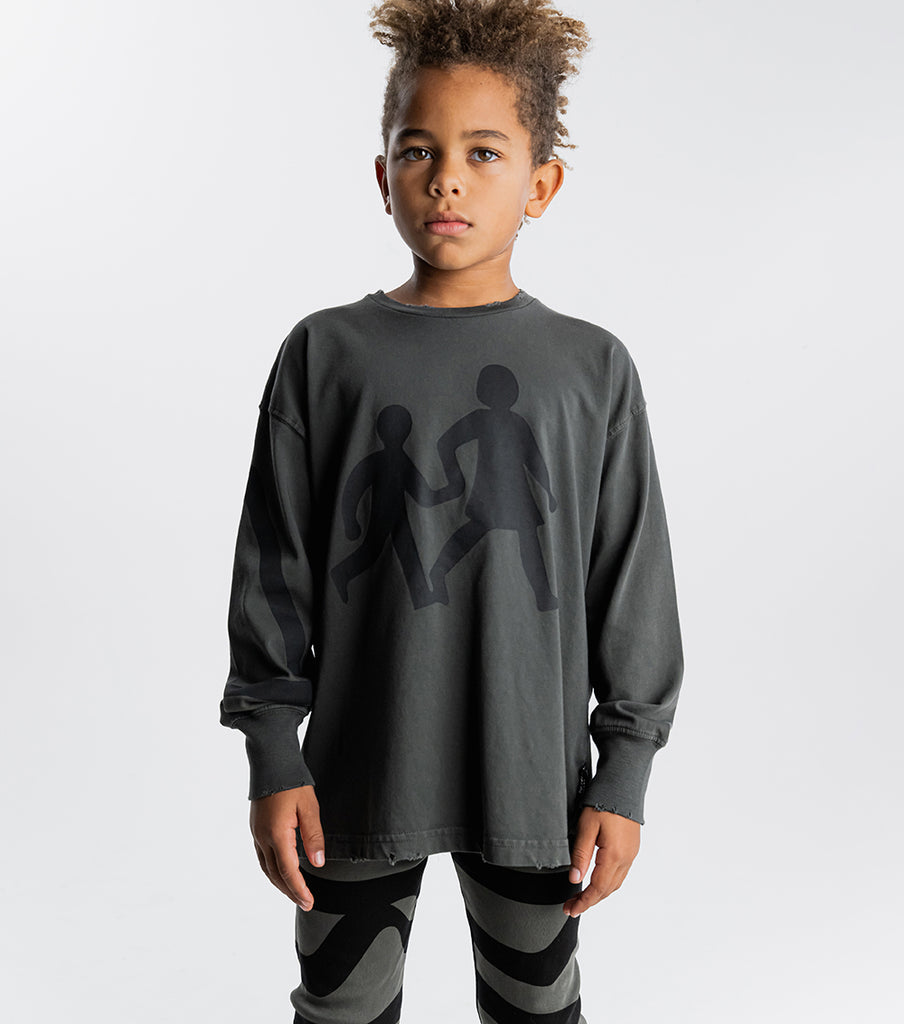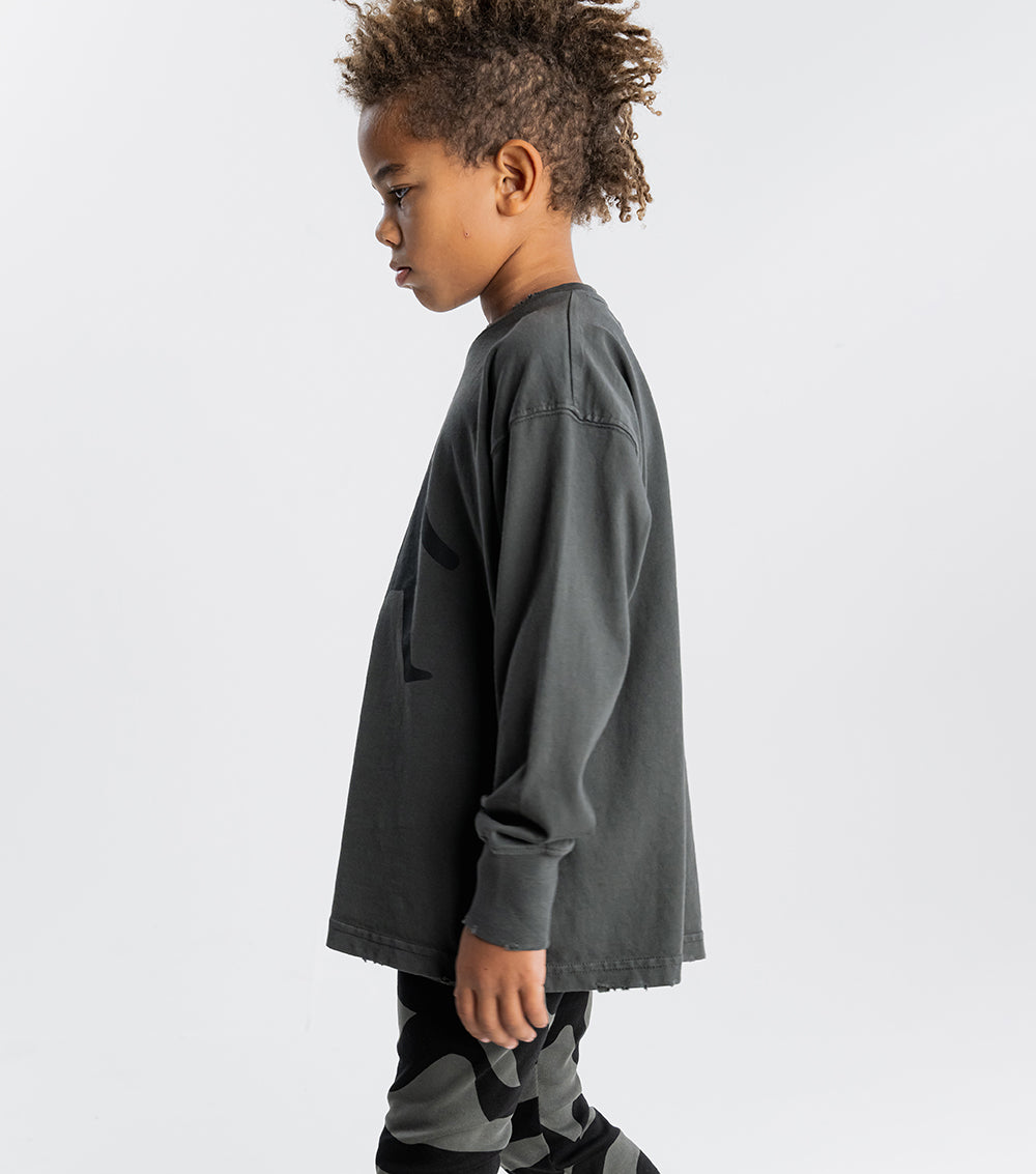 cross the street in style and own it before you get to the other side with this graphite gender neutral long sleeve t. it’s got our on the go graphic print inspired by kids, always busy making their way in the world. we’re obsessed with the ragged edges made with custom deconstruction on this super soft heavy single cotton piece. plus the drop shoulders make it just the right amount of slouch. oh yeah, and check out the sick line detail printed triangle on the right sleeve for bold & edgy crosswalk vibes.