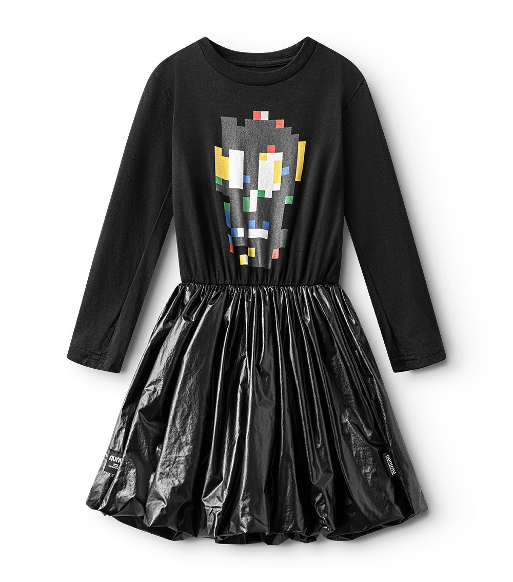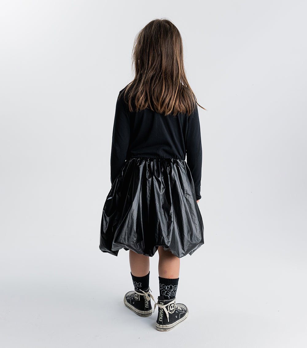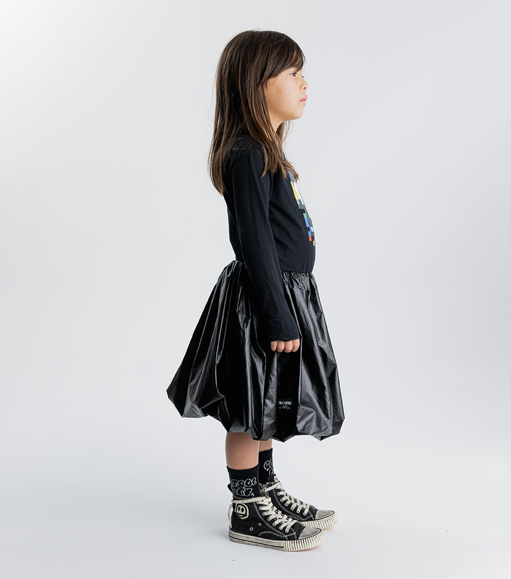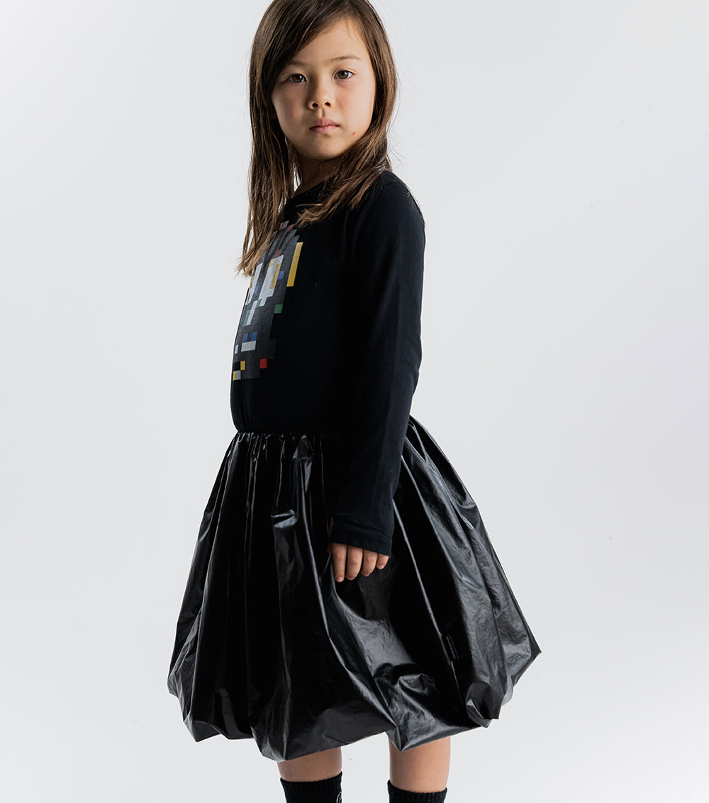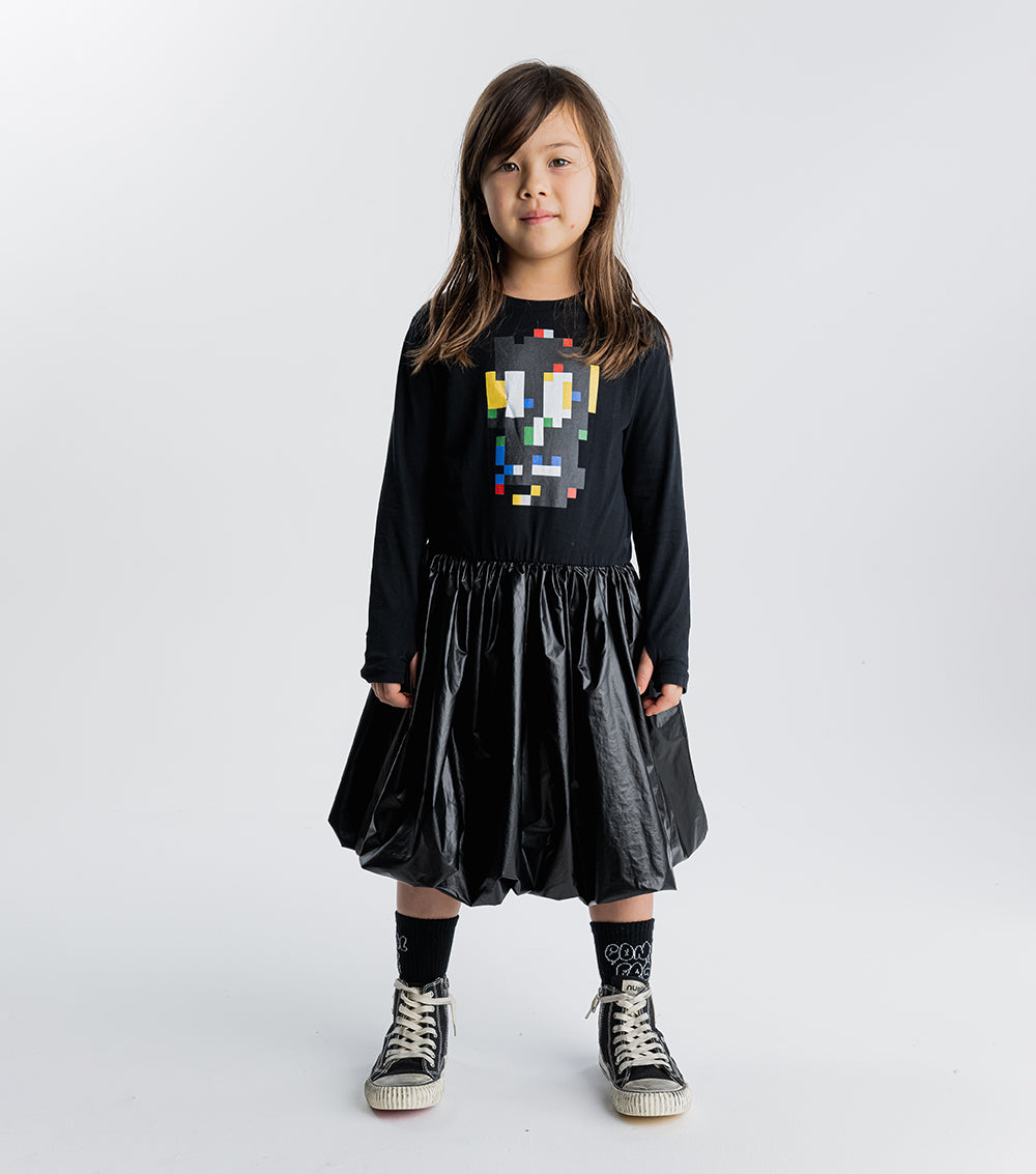 meet the dress that’s equal parts classy & grungy with an all black everywhere look. the pixel skull dress is made of single cotton on top, designed like a perfect long sleeved T. The scrunched elastic waistband and fluffy ballooning nylon skirt, lined with extra soft cotton lining, make for an industrial and inventive look that’s sure to brighten up your nununu’ers day. it’s ready for ballerina style twirling or head banging rockin out. whatever vibe is in the air!